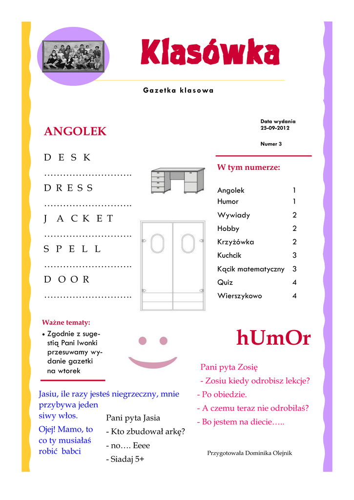 Klasówka Gazetka klasowa Data wydania 25-09-2012 ANGOLEK Numer 3 D E S K ………………………. D R E S S ………………………. J A C K E T ………………………. S P E L L ………………………. W tym numerze: Angolek Humor 1 1 Wywiady 2 Hobby 2 Krzyżówka 2 Kuchcik 3 Kącik matematyczny 3 D O O R Quiz 4 ………………………. Wierszykowo 4 Ważne tematy: hUmOr Zgodnie z sugestią Pani Iwonki przesuwamy wydanie gazetki na wtorek Pani pyta Zosię - Zosiu kiedy odrobisz lekcje? Jasiu, ile razy jesteś niegrzeczny, mnie przybywa jeden siwy włos. Pani pyta Jasia Ojej! Mamo, to co ty musiałaś robić babci - Kto zbudował arkę? - no…. Eeee - Siadaj 5+ - Po obiedzie. - A czemu teraz nie odrobiłaś? - Bo jestem na diecie….. Przygotowała Dominika Olejnik Wywiady—ocena naszej gazetki Natalia Siekierska Wiktoria Mirr - Czy podoba ci się nasza gazetka? - Czy podoba ci się nasza gazetka? - Oczywiście, że tak. - Tak, podoba mi się. - Co byś zmieniła w naszej gazetce? - Co byś zmieniła w naszej gazetce? - żeby było więcej stron i fajniejsze zadania - Nic, poza tym, że więcej stron i więcej zadań. - Co polecasz? - Polecam karate i zadania z gazetki. Wiktoria Białas - Czy podoba ci się nasza gazetka? - Chciałabym, żby utrzymała się całą wieczność. - Co byś zmieniła w naszej gazetce? - Chciałabym, żeby był większy druk i więcej stron. Poza tym wszystko jest w porządku . Piotr i Marcin wydają świetne gazetki. Hobby Karateka Karate służy do obrony siebie i innych. Jak kiedyś ktoś cię napadnie będziesz mógł się obronić. Zapisz się na zajęcia karate - MDK nr 5 Przygotowała Wiktoria Mirr Krzyżówka 1. jest zielona, lubi wodę i skakanie 2. ……. bo krowa 3. Na niej skaczą żaby lub pasą się konie 4. Str. 2 Stolica Polski 1 2 3 4 Przygotował Marcin Pastuszak Tytuł biuletynu KUCHCIK kącik kulinarny Przepis sałatkowy Składniki: 1 marchewka 1 papryka 1 ogórek konserwowy szczypiorek szczypta soli odrobina pieprzu 1 pomidor Pokroić wszystko w kostkę. Wrzucić do miski. Wymieszać. SMACZNEGO! Przygotowała Wiktoria Białas Kącik matematyczny Ile widzisz trójkątów? Ile widzisz trójkątów? A) 9 C) 23 A) 12 C) 16 B) D) 10 B) D) 8 12 28 Przygotowała Agata Kowalczyk Numer 3 Str. 3 Gazetka klasowa Quiz Klasówka Marcin Pastuszak Piotr Pastuszak [email protected] [email protected] II wojna światowa rozpoczęła się: A) 2.XII.2000 B) 1.XI.1935 C) 1.IX.1939 Ile lat trwała II wojna światowa? A) 1 rok B) 8 lat C) 6 lat Wierszykowo Brzechwa Jan Tańcowała igła z nitką Tańcowała igła z nitką, Igła - pięknie, nitka - brzydko. Igła cała jak z igiełki, Nitce plączą się supełki. Igła naprzód - nitka za nią: "Ach, jak cudnie tańczyć z panią!" Igła biegnie drobnym ściegiem, A za igłą - nitka biegiem. Igła górą, nitka bokiem, Igła zerka jednym okiem, Sunie zwinna, zręczna, śmigła. Nitka szepce: "Co za igła!" Tak ze sobą tańcowały, Aż uszyły fartuch cały!