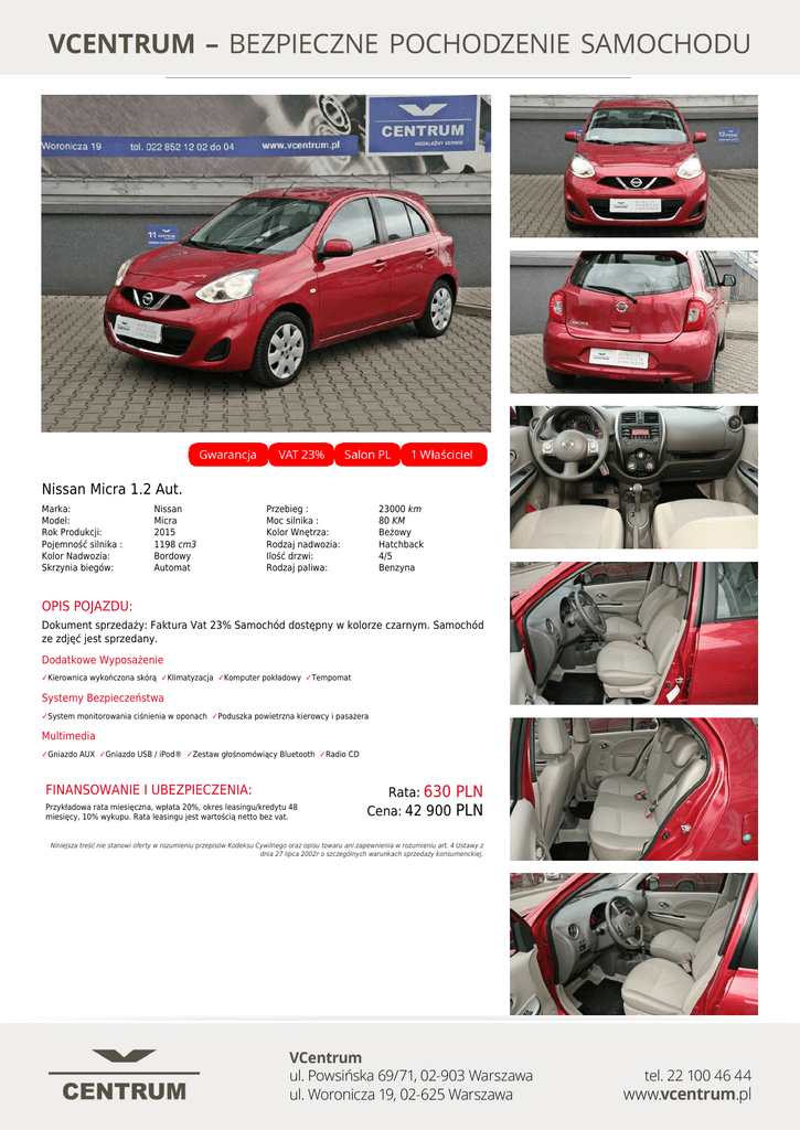 Nissan Micra 1.2 Aut. Marka: Model: Rok Produkcji: Pojemność silnika : Kolor Nadwozia: Skrzynia biegów: Nissan Micra 2015 1198 cm3 Bordowy Automat Przebieg : Moc silnika : Kolor Wnętrza: Rodzaj nadwozia: Ilość drzwi: Rodzaj paliwa: 23000 km 80 KM Beżowy Hatchback 4/5 Benzyna OPIS POJAZDU: Dokument sprzedaży: Faktura Vat 23% Samochód dostępny w kolorze czarnym. Samochód ze zdjęć jest sprzedany. Dodatkowe Wyposażenie ✓Kierownica wykończona skórą ✓Klimatyzacja ✓Komputer pokładowy ✓Tempomat Systemy Bezpieczeństwa ✓System monitorowania ciśnienia w oponach ✓Poduszka powietrzna kierowcy i pasażera Multimedia ✓Gniazdo AUX ✓Gniazdo USB / iPod® ✓Zestaw głośnomówiący Bluetooth ✓Radio CD FINANSOWANIE I UBEZPIECZENIA: Przykładowa rata miesięczna, wpłata 20%, okres leasingu/kredytu 48 miesięcy, 10% wykupu. Rata leasingu jest wartością netto bez vat. Rata: 630 Cena: 42 900 PLN PLN Niniejsza treść nie stanowi oferty w rozumieniu przepisów Kodeksu Cywilnego oraz opisu towaru ani zapewnienia w rozumieniu art. 4 Ustawy z dnia 27 lipca 2002r o szczególnych warunkach sprzedaży konsumenckiej. Powered by TCPDF (www.tcpdf.org)
