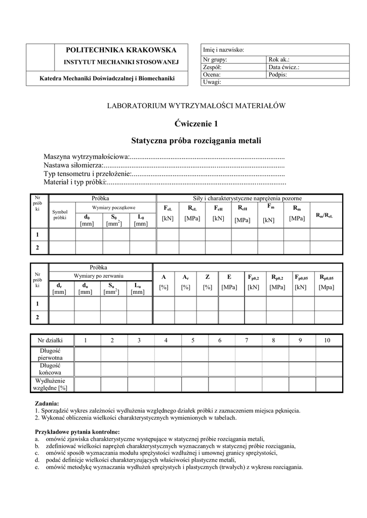 Imię i nazwisko: POLITECHNIKA KRAKOWSKA Nr grupy: Zespół: Ocena: Uwagi: INSTYTUT MECHANIKI STOSOWANEJ Katedra Mechaniki Doświadczalnej i Biomechaniki Rok ak.: Data ćwicz.: Podpis: LABORATORIUM WYTRZYMAŁOŚCI MATERIAŁÓW Ćwiczenie 1 Statyczna próba rozciągania metali Maszyna wytrzymałościowa:.................................................................................... Nastawa siłomierza:.................................................................................................. Typ tensometru i przełożenie:................................................................................... Materiał i typ próbki:................................................................................................. Nr prób ki Próbka Wymiary początkowe Symbol próbki d0 [mm] S0 [mm2] FeL L0 [mm] [kN] Siły i charakterystyczne naprężenia pozorne Fm ReH ReL FeH Rm [MPa] [kN] [MPa] [kN] [MPa] Rm/ReL 1 2 Próbka Nr prób ki Wymiary po zerwaniu dr [mm] du [mm] Su [mm2] Lu [mm] 1 2 3 A Ar Z E Fp0,2 Rp0,2 Fp0,05 Rp0,05 [%] [%] [%] [MPa] [kN] [MPa] [kN] [Mpa] 9 10 1 2 Nr działki 4 5 6 7 8 Długość pierwotna Długość końcowa Wydłużenie względne [%] Zadania: 1. Sporządzić wykres zależności wydłużenia względnego działek próbki z zaznaczeniem miejsca pęknięcia. 2. Wykonać obliczenia wielkości charakterystycznych wymienionych w tabelach. Przykładowe pytania kontrolne: a. omówić zjawiska charakterystyczne występujące w statycznej próbie rozciągania metali, b. zdefiniować wielkości naprężeń charakterystycznych wyznaczanych w statycznej próbie rozciągania, c. omówić sposób wyznaczania modułu sprężystości wzdłużnej i umownej granicy sprężystości, d. podać definicje wielkości charakteryzujących właściwości plastyczne metali, e. omówić metodykę wyznaczania wydłużeń sprężystych i plastycznych (trwałych) z wykresu rozciągania. Podstawowe nowe pojęcia i oznaczenia wprowadzone normą PN-EN 10002-1 „Próba rozciągania” 9Badania w temperaturze otoczenia) Rm – wytrzymałość na rozciąganie ReH – górna granica plastyczności ReL – dolna granica plastyczności Rp – umowna granica plastyczności przy wydłużeniu nieproporcjonalnym Rt – umowna granica plastyczności przy wydłużeniu całkowitym Rr – umowna granica plastyczności przy wydłużeniu trwałym np. R r0,2 A = A5 – wydłużenie trwałe; ale A10 = A11,3 At – wydłużenie całkowite procentowe przy rozerwaniu Agt – wydłużenie całkowite procentowe przy największej sile Ag – wydłużenie nieproporcjonalne procentowe przy największej sile (inaczej wydłużenie trwałe) Lc – długość części równoległej (części o pomniejszonym przekroju) Lc – długość pomiarowa ekstensometru Ae – wydłużenie (ekstensometru) procentowe na granicy plastyczności ΔLm – wydłużenie przy największej sile
