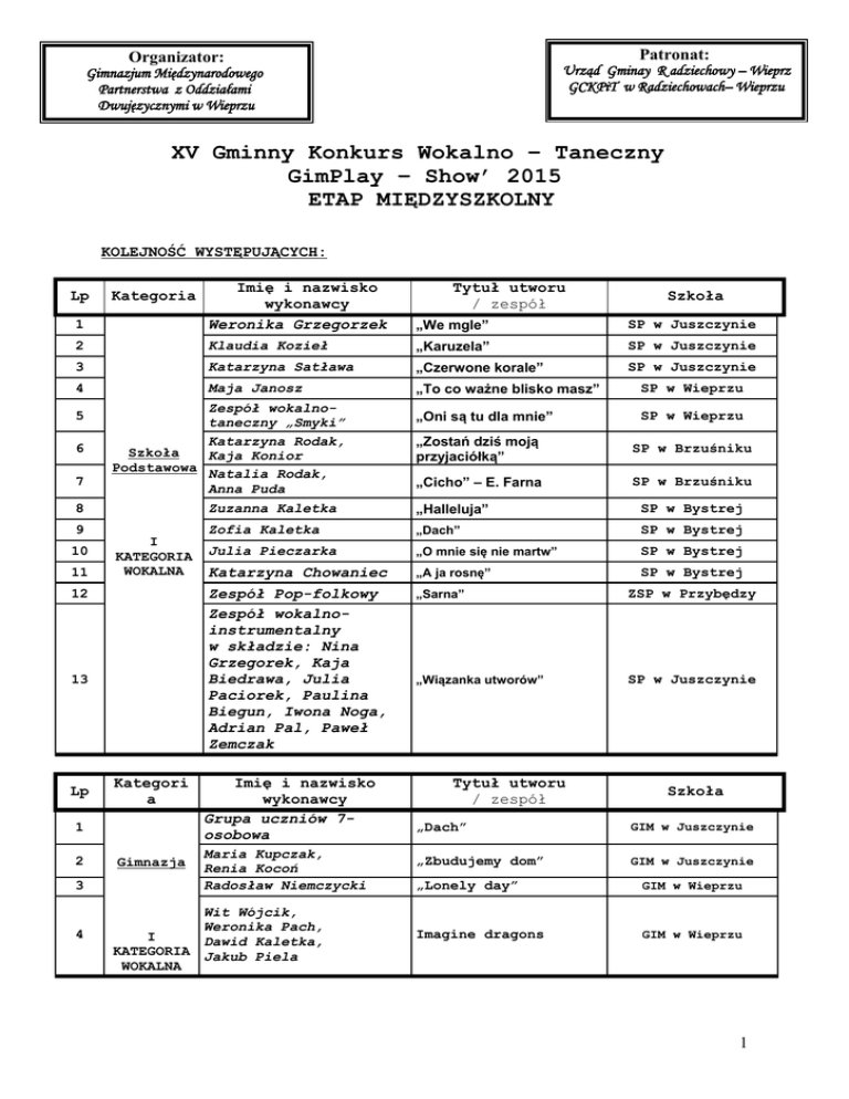 Patronat: Organizator: Urząd Gminay R adziechowy – Wieprz GCKPiT w Radziechowach– Wieprzu Gimnazjum Międzynarodowego Partnerstwa z Oddziałami Dwujęzycznymi w Wieprzu XV Gminny Konkurs Wokalno – Taneczny GimPlay – Show’ 2015 ETAP MIĘDZYSZKOLNY KOLEJNOŚĆ WYSTĘPUJĄCYCH: 1 Imię i nazwisko wykonawcy Weronika Grzegorzek „We mgle” SP w Juszczynie 2 Klaudia Kozieł „Karuzela” SP w Juszczynie 3 Katarzyna Satława „Czerwone korale” SP w Juszczynie 4 Maja Janosz „To co ważne blisko masz” SP w Wieprzu „Oni są tu dla mnie” SP w Wieprzu Lp 5 6 7 8 9 10 11 Kategoria Zespół wokalnotaneczny „Smyki” Katarzyna Rodak, Szkoła Kaja Konior Podstawowa Natalia Rodak, Anna Puda Zuzanna Kaletka I KATEGORIA WOKALNA 12 13 Lp Kategori a 1 2 3 4 Gimnazja Tytuł utworu / zespół Szkoła „Zostań dziś moją przyjaciółką” SP w Brzuśniku „Cicho” – E. Farna SP w Brzuśniku „Halleluja” SP w Bystrej Zofia Kaletka „Dach” SP w Bystrej Julia Pieczarka „O mnie się nie martw” SP w Bystrej Katarzyna Chowaniec Zespół Pop-folkowy Zespół wokalnoinstrumentalny w składzie: Nina Grzegorek, Kaja Biedrawa, Julia Paciorek, Paulina Biegun, Iwona Noga, Adrian Pal, Paweł Zemczak „A ja rosnę” SP w Bystrej Imię i nazwisko wykonawcy Grupa uczniów 7osobowa Maria Kupczak, Renia Kocoń Radosław Niemczycki Wit Wójcik, Weronika Pach, I Dawid Kaletka, KATEGORIA Jakub Piela WOKALNA „Sarna” ZSP w Przybędzy „Wiązanka utworów” SP w Juszczynie Tytuł utworu / zespół Szkoła „Dach” GIM w Juszczynie „Zbudujemy dom” GIM w Juszczynie „Lonely day” GIM w Wieprzu Imagine dragons GIM w Wieprzu 1 XV Gminny Konkurs Wokalno – Taneczny GimPlay – Show’ 2015 ETAP MIĘDZYSZKOLNY Lp Kategoria 1 Gimnazja 2 3 4 5 6 7 I KATEGORIA TANIEC Imię i nazwisko wykonawcy Grupa 5-osobowa Grupa taneczna „VENUS” w składzie: Suława Martyna,Caputa Roxana, Caputa Dominika, Jurasz Kinga, Błachut Joanna, Żuławska Ilona Caputa Aleksandra, Wawrowska Antonina Zespół wokalnotaneczny „Smyki” Zespół wokalnotaneczny „Smyki” Emilia Murańska, Julia Kosiec, Anna Puda,Weronika Okwat, Emilia Kościewicz, Natalia Gołębiowska, Maksymilian Murański, Patrycja Kosiec, Wiktoria Żyrek, Dominik Marek, Natalia Rodak, Katarzyna Rodak, Maksymilian Goryl, Agnieszka Hatala, Julia Kozieł Grupa 6-osobowa Koordynator: Tytuł utworu / zespół Szkoła „La la” - Shakira SP w Bystrej „Shake it of” – Taylor Swift SP w Wieprzu „Chandelier” - Sia SP w Wieprzu „Zumba” SP w Wieprzu „Zasiali górale” SP w Wieprzu „Mix 4 utworów” SP w Brzuśniku „Sear Jose” – Fayde can’t let go GIM w Juszczynie Wieprz, 7 maja 2015 r. Alina Jakubiec 2