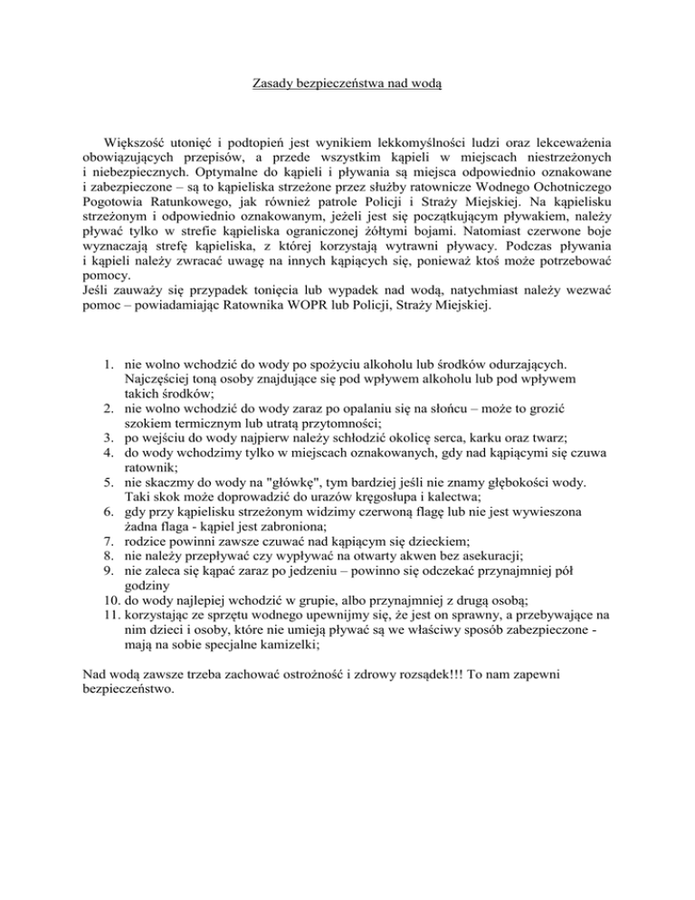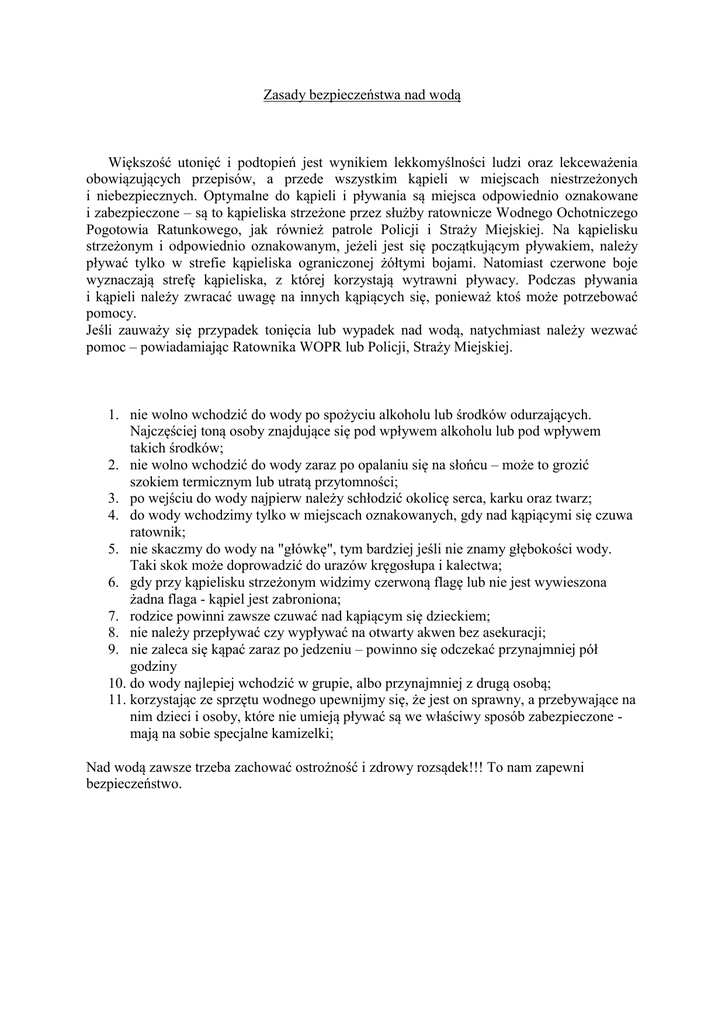 Zasady bezpieczeństwa nad wodą Większość utonięć i podtopień jest wynikiem lekkomyślności ludzi oraz lekceważenia obowiązujących przepisów, a przede wszystkim kąpieli w miejscach niestrzeżonych i niebezpiecznych. Optymalne do kąpieli i pływania są miejsca odpowiednio oznakowane i zabezpieczone – są to kąpieliska strzeżone przez służby ratownicze Wodnego Ochotniczego Pogotowia Ratunkowego, jak również patrole Policji i Straży Miejskiej. Na kąpielisku strzeżonym i odpowiednio oznakowanym, jeżeli jest się początkującym pływakiem, należy pływać tylko w strefie kąpieliska ograniczonej żółtymi bojami. Natomiast czerwone boje wyznaczają strefę kąpieliska, z której korzystają wytrawni pływacy. Podczas pływania i kąpieli należy zwracać uwagę na innych kąpiących się, ponieważ ktoś może potrzebować pomocy. Jeśli zauważy się przypadek tonięcia lub wypadek nad wodą, natychmiast należy wezwać pomoc – powiadamiając Ratownika WOPR lub Policji, Straży Miejskiej. 1. nie wolno wchodzić do wody po spożyciu alkoholu lub środków odurzających. Najczęściej toną osoby znajdujące się pod wpływem alkoholu lub pod wpływem takich środków; 2. nie wolno wchodzić do wody zaraz po opalaniu się na słońcu – może to grozić szokiem termicznym lub utratą przytomności; 3. po wejściu do wody najpierw należy schłodzić okolicę serca, karku oraz twarz; 4. do wody wchodzimy tylko w miejscach oznakowanych, gdy nad kąpiącymi się czuwa ratownik; 5. nie skaczmy do wody na "główkę", tym bardziej jeśli nie znamy głębokości wody. Taki skok może doprowadzić do urazów kręgosłupa i kalectwa; 6. gdy przy kąpielisku strzeżonym widzimy czerwoną flagę lub nie jest wywieszona żadna flaga - kąpiel jest zabroniona; 7. rodzice powinni zawsze czuwać nad kąpiącym się dzieckiem; 8. nie należy przepływać czy wypływać na otwarty akwen bez asekuracji; 9. nie zaleca się kąpać zaraz po jedzeniu – powinno się odczekać przynajmniej pół godziny 10. do wody najlepiej wchodzić w grupie, albo przynajmniej z drugą osobą; 11. korzystając ze sprzętu wodnego upewnijmy się, że jest on sprawny, a przebywające na nim dzieci i osoby, które nie umieją pływać są we właściwy sposób zabezpieczone mają na sobie specjalne kamizelki; Nad wodą zawsze trzeba zachować ostrożność i zdrowy rozsądek!!! To nam zapewni bezpieczeństwo.