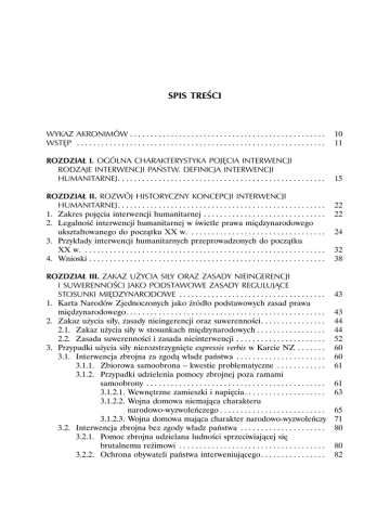 Spis treści Wykaz akronimów . . . . . . . . . . . . . . . . . . . . . . . . . . . . . . . . . . . . . . . . . . . . . . . . . 10 Wstęp . . . . . . . . . . . . . . . . . . . . . . . . . . . . . . . . . . . . . . . . . . . . . . . . . . . . . . . . . . . . . 11 Rozdział I. Ogólna charakterystyka pojęcia interwencji Rodzaje interwencji państw. Definicja interwencji humanitarnej . . . . . . . . . . . . . . . . . . . . . . . . . . . . . . . . . . . . . . . . . . . . . . . . . . . 15 Rozdział II. Rozwój historyczny koncepcji interwencji humanitarnej . . . . . . . . . . . . . . . . . . . . . . . . . . . . . . . . . . . . . . . . . . . . . . . . . . . 1. Zakres pojęcia interwencji humanitarnej . . . . . . . . . . . . . . . . . . . . . . . . . . . . . . . 2. Legalność interwencji humanitarnej w świetle prawa międzynarodowego . ukształtowanego do początku XX w. . . . . . . . . . . . . . . . . . . . . . . . . . . . . . . . . . 3. Przykłady interwencji humanitarnych przeprowadzonych do początku . XX w. . . . . . . . . . . . . . . . . . . . . . . . . . . . . . . . . . . . . . . . . . . . . . . . . . . . . . . . . . . . 4. Wnioski . . . . . . . . . . . . . . . . . . . . . . . . . . . . . . . . . . . . . . . . . . . . . . . . . . . . . . . . . . . Rozdział III. Zakaz użycia siły oraz zasady nieingerencji i suwerenności jako podstawowe zasady regulujące stosunki międzynarodowe . . . . . . . . . . . . . . . . . . . . . . . . . . . . . . . . . . . . . 1. Karta Narodów Zjednoczonych jako źródło podstawowych zasad prawa . międzynarodowego . . . . . . . . . . . . . . . . . . . . . . . . . . . . . . . . . . . . . . . . . . . . . . . . . 2. Zakaz użycia siły, zasady nieingerencji oraz suwerenności . . . . . . . . . . . . . . . . 2.1. Zakaz użycia siły w stosunkach międzynarodowych . . . . . . . . . . . . . . . . . 2.2. Zasada suwerenności i zasada nieinterwencji . . . . . . . . . . . . . . . . . . . . . . . 3. Przypadki użycia siły nierozstrzygnięte expressis verbis w Karcie NZ . . . . . . . . 3.1. Interwencja zbrojna za zgodą władz państwa . . . . . . . . . . . . . . . . . . . . . . . 3.1.1. Zbiorowa samoobrona – kwestie problematyczne . . . . . . . . . . . . . 3.1.2. Przypadki udzielenia pomocy zbrojnej poza ramami . samoobrony . . . . . . . . . . . . . . . . . . . . . . . . . . . . . . . . . . . . . . . . . . . . . 3.1.2.1. Wewnętrzne zamieszki i napięcia . . . . . . . . . . . . . . . . . . . . 3.1.2.2. Wojna domowa niemająca charakteru . narodowo-wyzwoleńczego . . . . . . . . . . . . . . . . . . . . . . . . . . 3.1.2.3. Wojna domowa mająca charakter narodowo-wyzwoleńczy 3.2. Interwencja zbrojna bez zgody władz państwa . . . . . . . . . . . . . . . . . . . . . . 3.2.1. Pomoc zbrojna udzielana ludności sprzeciwiającej się . brutalnemu reżimowi . . . . . . . . . . . . . . . . . . . . . . . . . . . . . . . . . . . . . 3.2.2. Ochrona obywateli państwa interweniującego . . . . . . . . . . . . . . . . 22 22 24 32 38 43 43 44 44 52 60 60 61 61 63 65 71 80 80 82 Spis treści 3.2.3. Rozwiązywanie sporów terytorialnych . . . . . . . . . . . . . . . . . . . . . . . 83 3.2.4. Ochrona interesów prawnych interweniującego . . . . . . . . . . . . . . . 84 4. Wnioski . . . . . . . . . . . . . . . . . . . . . . . . . . . . . . . . . . . . . . . . . . . . . . . . . . . . . . . . . . . 85 Rozdział IV. Rozwój praw człowieka w Systemie Narodów Zjednoczonych i systemach regionalnych – kształtowanie się zasady ochrony praw człowieka . . . . . . . . . 88 1. Zarys rozwoju praw człowieka w systemie Narodów Zjednoczonych . . . . . . . 88 2. Prawa człowieka a zakres spraw należących do kompetencji wewnętrznej . państwa . . . . . . . . . . . . . . . . . . . . . . . . . . . . . . . . . . . . . . . . . . . . . . . . . . . . . . . . . . . 93 3. Kształtowanie się podmiotowości prawnomiędzynarodowej jednostki . . . . . . . 94 4. Obowiązek państw poszanowania podstawowych praw człowieka . i odpowiedzialność państw wynikająca z nieposzanowania tego obowiązku . . 103 5. Kształtowanie się zasady ochrony podstawowych praw człowieka . . . . . . . . . . 122 Rozdział V. Przypadki użycia siły w celach humanitarnych po 1945 roku . . . . . . . . . . . . . . . . . . . . . . . . . . . . . . . . . . . . . . . . . . . . . . . . . . . . 124 1. Wstęp . . . . . . . . . . . . . . . . . . . . . . . . . . . . . . . . . . . . . . . . . . . . . . . . . . . . . . . . . . . . 124 2. Przypadki użycia siły w celach humanitarnych od 1945 roku do początku . lat 90. . . . . . . . . . . . . . . . . . . . . . . . . . . . . . . . . . . . . . . . . . . . . . . . . . . . . . . . . . . . . 124 2.1. Interwencja w Kongo w 1964 r. . . . . . . . . . . . . . . . . . . . . . . . . . . . . . . . . . . 125 2.2. Interwencja na Dominikanie w 1965 r. . . . . . . . . . . . . . . . . . . . . . . . . . . . 128 2.3. Interwencja w Bangladeszu w 1971 r. . . . . . . . . . . . . . . . . . . . . . . . . . . . . . 130 2.4. Interwencja w Kambodży w 1978 r. . . . . . . . . . . . . . . . . . . . . . . . . . . . . . . 134 2.5. Interwencja w Ugandzie w 1979 r. . . . . . . . . . . . . . . . . . . . . . . . . . . . . . . . 138 2.6. Interwencja w Republice Środkowej Afryki w 1979 r. . . . . . . . . . . . . . . . 142 2.7. Interwencja w Grenadzie w 1983 r. . . . . . . . . . . . . . . . . . . . . . . . . . . . . . . 144 3. Wnioski na temat praktyki użycia siły w celach humanitarnych od 1945 r. . do początku lat 90. . . . . . . . . . . . . . . . . . . . . . . . . . . . . . . . . . . . . . . . . . . . . . . . . 148 4. Przypadki użycia siły w celach humanitarnych od początku lat 90. . . . . . . . . . 152 4.1. Interwencja w Liberii w 1990 r. . . . . . . . . . . . . . . . . . . . . . . . . . . . . . . . . . . 153 4.2. Interwencja w Iraku w 1991 r. . . . . . . . . . . . . . . . . . . . . . . . . . . . . . . . . . . . 157 4.3. Interwencja w Somalii w latach 1992–1993 . . . . . . . . . . . . . . . . . . . . 