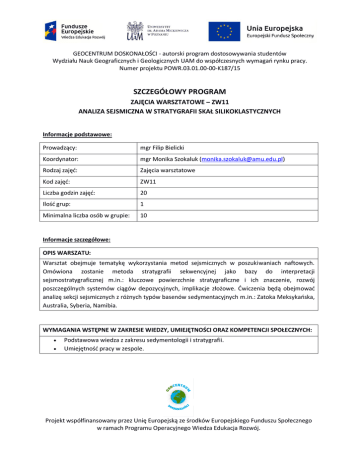 GEOCENTRUM DOSKONAŁOŚCI - autorski program dostosowywania studentów Wydziału Nauk Geograficznych i Geologicznych UAM do współczesnych wymagań rynku pracy. Numer projektu POWR.03.01.00-00-K187/15 SZCZEGÓŁOWY PROGRAM ZAJĘCIA WARSZTATOWE – ZW11 ANALIZA SEJSMICZNA W STRATYGRAFII SKAŁ SILIKOKLASTYCZNYCH Informacje podstawowe: Prowadzący: mgr Filip Bielicki Koordynator: mgr Monika Szokaluk ([email protected]) Rodzaj zajęć: Zajęcia warsztatowe Kod zajęć: ZW11 Liczba godzin zajęć: 20 Ilość grup: 1 Minimalna liczba osób w grupie: 10 Informacje szczegółowe: OPIS WARSZATU: Warsztat obejmuje tematykę wykorzystania metod sejsmicznych w poszukiwaniach naftowych. Omówiona zostanie metoda stratygrafii sekwencyjnej jako bazy do interpretacji sejsmostratygraficznej m.in.: kluczowe powierzchnie stratygraficzne i ich znaczenie, rozwój poszczególnych systemów ciągów depozycyjnych, implikacje złożowe. Ćwiczenia będą obejmować analizę sekcji sejsmicznych z różnych typów basenów sedymentacyjnych m.in.: Zatoka Meksykańska, Australia, Syberia, Namibia. WYMAGANIA WSTĘPNE W ZAKRESIE WIEDZY, UMIEJĘTNOŚCI ORAZ KOMPETENCJI SPOŁECZNYCH: Podstawowa wiedza z zakresu sedymentologii i stratygrafii. Umiejętność pracy w zespole. Projekt współfinansowany przez Unię Europejską ze środków Europejskiego Funduszu Społecznego w ramach Programu Operacyjnego Wiedza Edukacja Rozwój. GEOCENTRUM DOSKONAŁOŚCI - autorski program dostosowywania studentów Wydziału Nauk Geograficznych i Geologicznych UAM do współczesnych wymagań rynku pracy. Numer projektu POWR.03.01.00-00-K187/15 Program warsztatu: RODZAJ ZAJĘĆ ZAKRES TEMATYCZNY LICZBA GODZIN DZIEŃ PIERWSZY Wykład Podstawy sejsmiki refleksyjnej: fizyczne podstawy, fazowość i polaryzacja, akwizycja, processing, interpretacja. 1 godz. Wykład Wprowadzenie do zaawansowanych metod interpretacji danych sejsmicznych: analiza atrybutów sejsmicznych, AVO, inwersja sejsmiczna, dekompozycja spektralna. 30 min Wykład Wprowadzenie do metody sejsmostratygraficznej. 30 min Wykład Stratygrafia sekwencyjna – baza stratygrafii sejsmicznej: kluczowe powierzchnie stratygraficzne i ich znaczenie, rozwój poszczególnych systemów ciągów depozycyjnych, implikacje złożowe. 2 godz. Wykład Stratygrafia sejsmiczna: metodyka interpretacji sejsmostratygraficznej, typy wyklinowań refleksów sejsmicznych, analiza sejsmofacjalna, geomorfologia sejsmiczna. 1 godz. Ćwiczenia Zadanie 1: dowiązanie danych sejsmicznych do otworu. 40 min Ćwiczenia Zadanie 2: interpretacja parasekwencji. 30 min Ćwiczenia Zadanie 3: korelacja parasekwencji. 40 min DZIEŃ DRUGI Ćwiczenia Zadanie 4: identyfikacja powierzchni stratygraficznych na modelowej sekcji. 40 min Ćwiczenia Zadanie 5: identyfikacja facji sejsmicznych na modelowej sekcji. 30 min Ćwiczenia Zadanie 6: sejsmostratygraficzna interpretacja modelowej sekcji. 40 min Ćwiczenia Zadanie 7: interpretacja sejsmostratygraficzna danych różnoczęstotliwościowych. 50 min Projekt współfinansowany przez Unię Europejską ze środków Europejskiego Funduszu Społecznego w ramach Programu Operacyjnego Wiedza Edukacja Rozwój. GEOCENTRUM DOSKONAŁOŚCI - autorski program dostosowywania studentów Wydziału Nauk Geograficznych i Geologicznych UAM do współczesnych wymagań rynku pracy. Numer projektu POWR.03.01.00-00-K187/15 Ćwiczenia Zadanie 8: interpretacja sejsmostratygraficzna – Wind River Basin. 1 godz. Ćwiczenia Zadanie 9: interpretacja sejsmostratygraficzna – Syberia. 1 godz. Ćwiczenia Zadanie 10: interpretacja sejsmostratygraficzna – Afryka Południowa. 1 godz. Ćwiczenia Zadanie 11: interpretacja sejsmostratygraficzna – Namibia. 1 godz. DZIEŃ TRZECI Ćwiczenia Zadanie 12: interpretacja sejsmostratygraficzna – Alaska. 1 godz. Ćwiczenia Zadanie 13: interpretacja sejsmostratygraficzna – Australia. 1 godz. Ćwiczenia Zadanie 14: interpretacja oraz mapowanie facji sejsmicznych – Zatoka Meksykańska. 2 godz. Ćwiczenia Zadanie 15: interpretacja sejsmofacjalna oraz mapowanie facji sejsmicznych – Teksas. 2 godz. Dyskusja oraz podsumowanie zajęć warsztatowych. 30 min Zalecana literatura: 1. Catuneanu O., 2006. Principles of Sequence Stratigraphy. Elsevier Science Publishers. 2. Veeken P. & van Moerkerken B., 2013. Seismic Stratigraphy and Depositional Facies Models. EAGE Publications. Projekt współfinansowany przez Unię Europejską ze środków Europejskiego Funduszu Społecznego w ramach Programu Operacyjnego Wiedza Edukacja Rozwój.