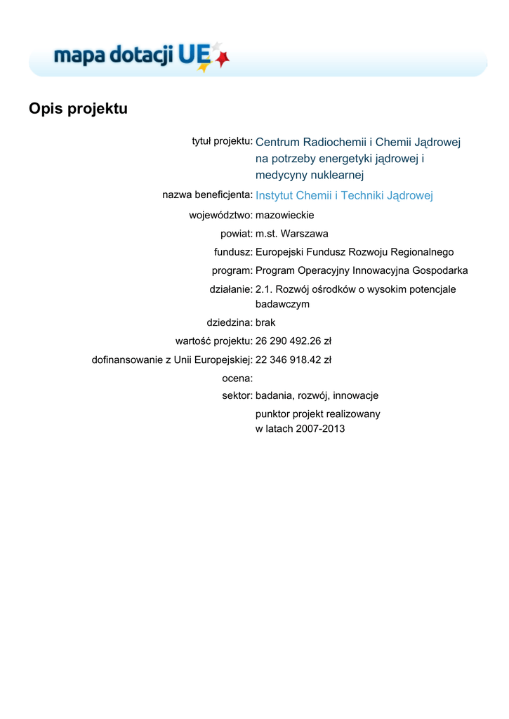 Opis projektu tytuł projektu: Centrum Radiochemii i Chemii Jądrowej na potrzeby energetyki jądrowej i medycyny nuklearnej nazwa beneficjenta: Instytut Chemii i Techniki Jądrowej województwo: mazowieckie powiat: m.st. Warszawa fundusz: Europejski Fundusz Rozwoju Regionalnego program: Program Operacyjny Innowacyjna Gospodarka działanie: 2.1. Rozwój ośrodków o wysokim potencjale badawczym dziedzina: brak wartość projektu: 26 290 492.26 zł dofinansowanie z Unii Europejskiej: 22 346 918.42 zł ocena: sektor: badania, rozwój, innowacje punktor projekt realizowany w latach 2007-2013
