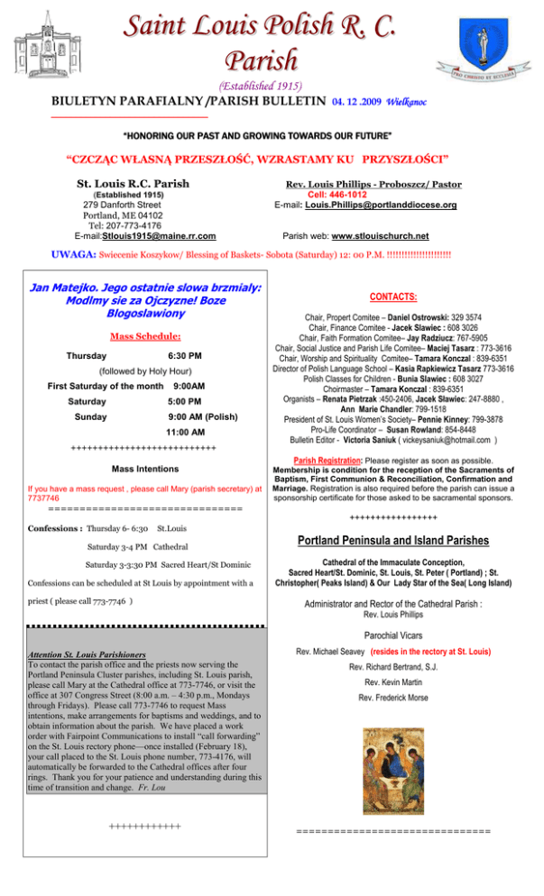 Saint Louis Polish R. C. Parish (Established 1915) BIULETYN PARAFIALNY /PARISH BULLETIN 04. 12 .2009 Wielkanoc ________________________________ “HONORING OUR PAST AND GROWING TOWARDS OUR FUTURE” “CZCZĄC WŁASNĄ PRZESZŁOŚĆ, WZRASTAMY KU PRZYSZŁOŚCI” St. Louis R.C. Parish (Established 1915) 279 Danforth Street Portland, ME 04102 Tel: 207-773-4176 E-mail:[email protected] Rev. Louis Phillips - Proboszcz/ Pastor Cell: 446-1012 E-mail: [email protected] Parish web: www.stlouischurch.net UWAGA: Swiecenie Koszykow/ Blessing of Baskets- Sobota (Saturday) 12: 00 P.M. !!!!!!!!!!!!!!!!!!!!!! Jan Matejko. Jego ostatnie slowa brzmialy: Modlmy sie za Ojczyzne! Boze Blogoslawiony Mass Schedule: Thursday 6:30 PM (followed by Holy Hour) First Saturday of the month Saturday 9:00AM 5:00 PM Sunday 9:00 AM (Polish) 11:00 AM CONTACTS: Chair, Propert Comitee – Daniel Ostrowski: 329 3574 Chair, Finance Comitee - Jacek Slawiec : 608 3026 Chair, Faith Formation Comitee– Jay Radziucz: 767-5905 Chair, Social Justice and Parish Life Comitee– Maciej Tasarz : 773-3616 Chair, Worship and Spirituality Comitee– Tamara Konczal : 839-6351 Director of Polish Language School – Kasia Rapkiewicz Tasarz 773-3616 Polish Classes for Children - Bunia Slawiec : 608 3027 Choirmaster – Tamara Konczal : 839-6351 Organists – Renata Pietrzak :450-2406, Jacek Sławiec: 247-8880 , Ann Marie Chandler: 799-1518 President of St. Louis Women’s Society– Pennie Kinney: 799-3878 Pro-Life Coordinator – Susan Rowland: 854-8448 Bulletin Editor - Victoria Saniuk ( [email protected] ) +++++++++++++++++++++++++++ Mass Intentions If you have a mass request , please call Mary (parish secretary) at 7737746 Parish Registration: Please register as soon as possible. Membership is condition for the reception of the Sacraments of Baptism, First Communion & Reconciliation, Confirmation and Marriage. Registration is also required before the parish can issue a sponsorship certificate for those asked to be sacramental sponsors. =============================== +++++++++++++++++ Confessions : Thursday 6- 6:30 St.Louis Saturday 3-4 PM Cathedral Saturday 3-3:30 PM Sacred Heart/St Dominic Confessions can be scheduled at St Louis by appointment with a priest ( please call 773-7746 ) Portland Peninsula and Island Parishes Cathedral of the Immaculate Conception, Sacred Heart/St. Dominic, St. Louis, St. Peter ( Portland) ; St. Christopher( Peaks Island) & Our Lady Star of the Sea( Long Island) Administrator and Rector of the Cathedral Parish : Rev. Louis Phillips Parochial Vicars Attention St. Louis Parishioners To contact the parish office and the priests now serving the Portland Peninsula Cluster parishes, including St. Louis parish, please call Mary at the Cathedral office at 773-7746, or visit the office at 307 Congress Street (8:00 a.m. – 4:30 p.m., Mondays through Fridays). Please call 773-7746 to request Mass intentions, make arrangements for baptisms and weddings, and to obtain information about the parish. We have placed a work order with Fairpoint Communications to install “call forwarding” on the St. Louis rectory phone—once installed (February 18), your call placed to the St. Louis phone number, 773-4176, will automatically be forwarded to the Cathedral offices after four rings. Thank you for your patience and understanding during this time of transition and change. Fr. Lou Rev. Michael Seavey (resides in the rectory at St. Louis) ++++++++++++ =============================== Rev. Richard Bertrand, S.J. Rev. Kevin Martin Rev. Frederick Morse PORTLAND PENINSULA AND ISLANDS WEEKDAY MASS SCHEDULE (Effective Feb 2 2008 ) Monday 7:00 a.m. St. Peter 12:15 p.m. Cathedral 5:15 p.m. Sacred Heart/St. Dominic POLISH LANGUAGE SCHOOL Students meet on Sundays in a lower parish hall . Lesson for adults resumes at 10:30 A.M. and a class for children begins at 10:45 A.M. Tuesday 7:00 a.m. St. Peter 12:15 p.m. Cathedral 5:15 p.m. Sacred Heart/St. Dominic Wednesday 7:00 a.m. St. Peter 12:00 noon St. Christopher (winter; 6 p.m. summer) 12:15 p.m. Cathedral 5:15 p.m. Sacred Heart/St. Dominic Repetitio est Mater Studiorum Thursday 7:00 a.m. St. Peter 12:15 p.m. Cathedral 5:15 p.m. Sacred Heart/St. Dominic :::::::::::::::::::::::::::::::::::::::::::::::::::::::::: Friday 7:00 a.m. St. Peter 12:15 p.m. Cathedral 5:15 p.m. Sacred Heart/St. Dominic The St. Louis Women's Society meets the first Tuesday of every month from September to June at 7 PM. A typical meeting agenda is covered in forty-five minutes and is followed by a social that ends by 9 PM Saint Louis Women’s Society KAWIARNIA PANI HELENKI Dzieki uprzejmosci pani Helenki, od kilku juz lat mozemy uraczyc swoje podniebienie aromatyczna POLSKIE KSIAZKI Miejska Biblioteka Publiczna w Portland, mieszczaca sie na Congress St. posiada w swej sekcji zagranicznej zbior polskich ksiazek , zarowno dla dzieci jak i dla doroslych. Od tego czy ktos je wypozycza czy tez nie , dyrekcja kawa ( i nie tylko) po polskiej Mszy Sw. konczacej sie okolo godziny 10-ej. Proponuje wszystkim parafiankom jak i parafianom wspoluczestnictwo w podtrzymywaniu tej naszej tradycji, przejawiajace sie w dzieleniu z innymi swoich kulinarnych wypiekow . biblioteki uzaleznia swoja decyzje co do ewentualnego Na scianie, w Sali parafialnej znajduje sie zakupu nowych pozycji literackich do polskiej kolekcji. kalendarium na nadchodzace miesiace, chetnych do przyniesienia ciast, etc. prosze o wpisanie swego ::::::::::::::::::::::::::::::::::::::::::::::::::::::::::::::::::::::::::::::::::::::::::: nazwiska na konkretna date. Unikniemy w ten sposob sytuacji w ktorej czasami mamy caly asortyment slodkosci, a czasami wcale. Dziekuje za pomoc i wspolprace w tej mierze, zwlaszcza pani Helence. SMACZNEGO Maciej Tasarz Council 14246 The Knights of Columbus is a men’s organization created to unite men in their faith and help others in difficult times. Through their Good Neighbor Project, Knights distribute donated bread and pastries