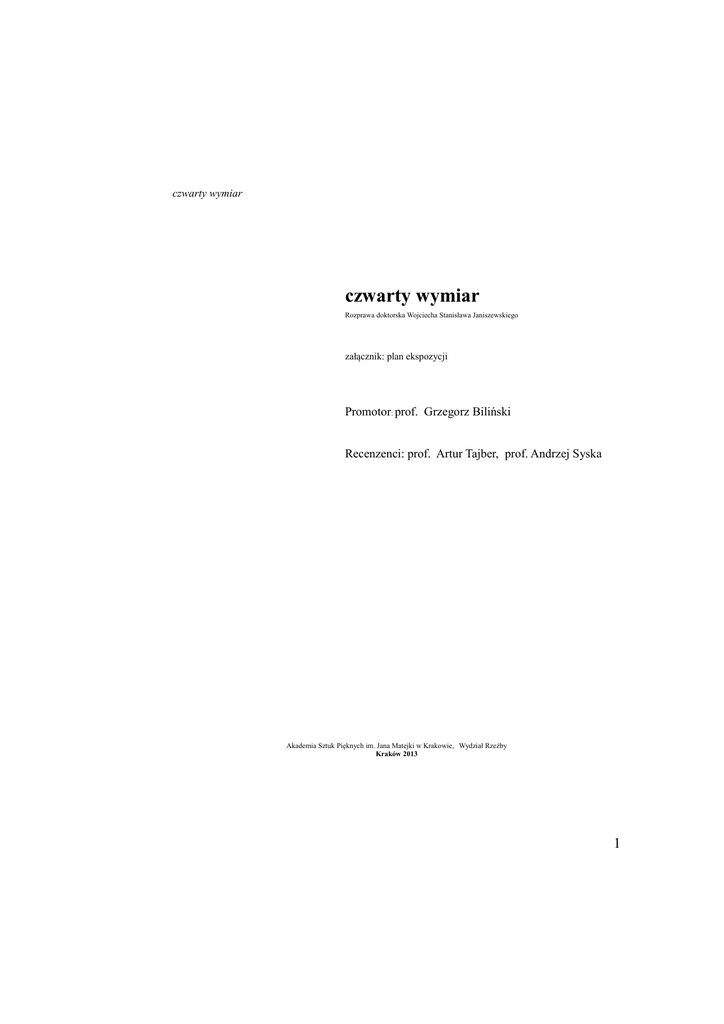 czwarty wymiar czwarty wymiar Rozprawa doktorska Wojciecha Stanisława Janiszewskiego załącznik: plan ekspozycji Promotor: prof. Grzegorz Biliński Recenzenci: prof. Artur Tajber, prof. Andrzej Syska Akademia Sztuk Pięknych im. Jana Matejki w Krakowie, Wydział Rzeźby Kraków 2013 1 czwarty wymiar Przedmiot ekspozycji. 1. „Medium Liryczne” - 'wstępna' część pracy: 1. sterowana ruchem 'widza' projekcja kostki 27 sześcianów (3 x 3 x 3) przedstawiających na ścianach zapis video sklejania Butelki Kleina . 2. projekcja pełnego zapisu video sklejania Butelki Kleina. 3. stanowiska do przeglądania, odsłuchiwania, tekstowej części rozprawy 2. LDO4D (laboratorium doświadczania obiektów 4D)– podstawowa cześć pracy – sterowana położeniem głowy i ruchem gałek ocznych transformacja obiektów 4D 2 czwarty wymiar Przestrzeń ekspozycji Dwa odizolowane akustycznie pomieszczenia o powierzchni minimalnej: 4m x 4m x 4m 3 czwarty wymiar Zaplecze techniczne 1. „Medium Liryczne” - 'wstępna' część pracy: 1. Rzutnik 2. Komputer PC (projekcja sześcianów) Ram = 4GB 4-rdzeniowy procesor karta graficzna NVIDIA seria 200 wewnętrzna karta dźwiękowa 24 bit/ 4 kanały 3. kamera USB (PS 3) 4. 4-kanałowy system AUDIO (wzmacniacz, głośniki) 5. komputer PC (odtwarzacz DVD ) (projekcja VIDEO) 6. komputery PC (stanowiska do 'przeglądania', „odsłuchiwania tekstowej części rozprawy) 2. LDO4D (laboratorium doświadczania obiektów 4D)– podstawowa cześć pracy 1. Rzutnik 2. Komputer PC (transformacje sześcianów) Ram = 4GB 4-rdzeniowy procesor karta graficzna NVIDIA seria 200 wewnętrzna karta dźwiękowa 24 bit/ 4 kanały 3. 4-kanałowy system AUDIO (wzmacniacz, głośniki) 4 czwarty wymiar 4. Komputer PC (detekcja ruchu głowy i gałek ocznych) Ram = 4GB 4-rdzeniowy procesor 5. kamera USB (PS 3) 6. 4-kanałowy system AUDIO (wzmacniacz, głośniki) 5 czwarty wymiar Symulacja ekspozycji „Medium liryczne” 6 czwarty wymiar 7 czwarty wymiar 8 czwarty wymiar 9 czwarty wymiar Symulacja ekspozycji LDO4D 10 czwarty wymiar 11 czwarty wymiar 12 czwarty wymiar 13 czwarty wymiar Założenia ideologiczne Medium Liryczne LDO4D ( laboratorium doświadczania obiektów 4D) – 'praktyczna' część rozprawy doktorskiej odnosi się 'wprost' do podstaw geometrii, topologii. Licealna wiedza matematyczna pozwala na jej 'zrozumienie' – Butelka Kleina, sześcian 4D nie są jednak 'omawiane' w programach szkolnych (kurs podstawowy) . Choć opisuję konstrukcję BK w tekście rozprawy, uznałem za istotne dopełnienie dyskursu o 'przedstawienie liryczne'. Umieściłem w dodatkach do podstawowej części rozprawy rozdział 'Medium Liryczne” ostatecznie pozostał nagłówek i przypis: W pierwotnym planie pracy poniższy rozdział miał być zapisem, dokumentacją lirycznej, metafizycznej osnowy pracy, miał być znakiem źródła, inspiracji. Zadanie takie, po części, spełnił rozdział ' Przestrzeń'. Wprowadzenie do pracy 'lirycznego medium' miało być manifestem podróży autora w 'nieznane wymiary', zaznaczeniem kontekstu filozoficznego (zarówno ontologicznego jak i epistemologicznego). Po napisaniu rozdziału 'Rozprawa', kompletnym wykonaniu instalacji LDO4D, całkiem naturalnie, organicznie, pojawił się zamysł wprowadzenia w miejsce tekstu działania, uzupełniającej instalacji, będącego zapisem sklejania przez autora (z metalowej siatki) Butelki Kleina. W o wiele doskonalszy sposób niż tekst stanowić będzie ona wstęp do LDO4D, Plan omówionej w przypisie instalacji rozwinął się – postanowiłem dodać w miejscu jej prezentacji „stanowiska” do oglądania, słuchania 'tekstowej części rozprawy' i przeglądania pełnego zapisu video 'sklejania wstęgi'. Chcę by wspomnianym miejscem była osobna sala - przedsionek LDO4D, wprowadzenie 'liryczne', a i teoretyczne do podstawowej części. „Medium Liryczne” pomyślane jest jako swoista gra – odnajdywanie tajemnicy ruchu 27 sześcianów przedstawiających na ścianach fragmenty rejestracji sklejania BK i obraz z kamery (skierowanej na oglądających). Zmiany ruchu sześcianów są wyzwalane algorytmicznie zmianami obrazu z kamery – nie są przypadkowe, stochastyczne, pozostają jednak nieodgadnione – algorytm uzależnia zmianę ruchu sześcianów od współrzędnych miejsca 'największej' zmiany obrazu, ta jest możliwa do 'antycypacji', jednak zależna jest algorytmicznie, a nie przewidywalnie1, od poprzedzającej ją zmiany. Gra jest oddawaniem się perfidii algorytmu, zgoła nieprzyjaznej maszynerii, zdaje się, jednak, uczestniczeniem w 'magicznym' procesie, uwewnętrznianym znajdowaniem przez oglądających obrazów 1 14 Zależność zmiany ruchu sześcianów od zmiany obrazu nie jest prostą, geometryczną zależnością. 'Trajektoria ruchu' sześcianów obliczana jest na podstawie współrzędnych 'największej' zmiany obrazu, nie jest jednak ich 'geometrycznym przekształceniem', geometryczną analogią zmian obrazu. Przesuwanie dłoni przed kamerą zostaje zdekodowane jako ciąg współrzędnych obrazujących jej ruch, wyzwolone zmiany obrotów, przesunięć sześcianów nie są 'liniowym' podążaniem za dłonią – jedynie bezruch ręki jest wprost tłumaczony na bezruch sześcianów. Poddajemy się wrażeniu zależności obrotów (przesunięć) brył od ruchu dłoni, choć nie potrafimy przewidzieć zmian (nawet znając algorytm – wyniki jego działania, wzór, są wyświetlane na ekranie). czwarty wymiar ich własnego 'uwikłania w proces' . W 'geometrię' sześcianów wprowadziłem błąd nanoszenia obrazu2 (z kamer, filmu) - wywołuje złudzenie otwierania ścian, zmylenie 'wnętrza' bryły z jej 'zewnętrzem' – manipulacja tyle jawna, co nieoczywista, wymykająca się intuicji. Wspomniane zmiany obrazu wyzwalają dźwięki (kwadrofoniczne) – są fragmentami czytanego tekstu rozprawy, tła rejestrowanego sklejania BK, wariacji muzycznych. Kolejne 'wywołania' zagłuszają, kasują, p