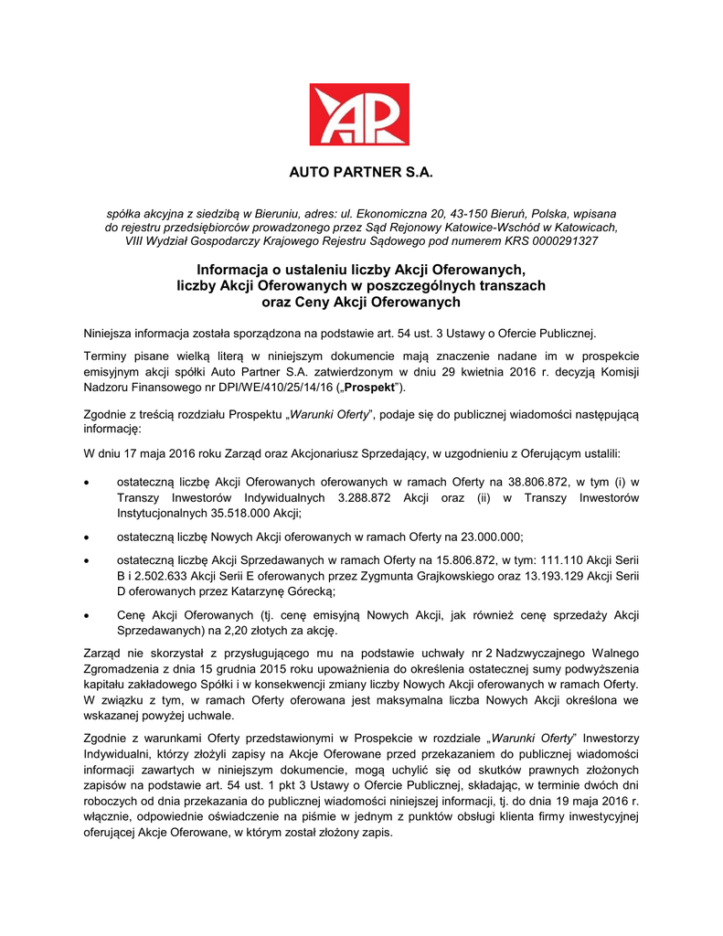 AUTO PARTNER S.A. spółka akcyjna z siedzibą w Bieruniu, adres: ul. Ekonomiczna 20, 43-150 Bieruń, Polska, wpisana do rejestru przedsiębiorców prowadzonego przez Sąd Rejonowy Katowice-Wschód w Katowicach, VIII Wydział Gospodarczy Krajowego Rejestru Sądowego pod numerem KRS 0000291327 Informacja o ustaleniu liczby Akcji Oferowanych, liczby Akcji Oferowanych w poszczególnych transzach oraz Ceny Akcji Oferowanych Niniejsza informacja została sporządzona na podstawie art. 54 ust. 3 Ustawy o Ofercie Publicznej. Terminy pisane wielką literą w niniejszym dokumencie mają znaczenie nadane im w prospekcie emisyjnym akcji spółki Auto Partner S.A. zatwierdzonym w dniu 29 kwietnia 2016 r. decyzją Komisji Nadzoru Finansowego nr DPI/WE/410/25/14/16 („Prospekt”). Zgodnie z treścią rozdziału Prospektu „Warunki Oferty”, podaje się do publicznej wiadomości następującą informację: W dniu 17 maja 2016 roku Zarząd oraz Akcjonariusz Sprzedający, w uzgodnieniu z Oferującym ustalili: ostateczną liczbę Akcji Oferowanych oferowanych w ramach Oferty na 38.806.872, w tym (i) w Transzy Inwestorów Indywidualnych 3.288.872 Akcji oraz (ii) w Transzy Inwestorów Instytucjonalnych 35.518.000 Akcji; ostateczną liczbę Nowych Akcji oferowanych w ramach Oferty na 23.000.000; ostateczną liczbę Akcji Sprzedawanych w ramach Oferty na 15.806.872, w tym: 111.110 Akcji Serii B i 2.502.633 Akcji Serii E oferowanych przez Zygmunta Grajkowskiego oraz 13.193.129 Akcji Serii D oferowanych przez Katarzynę Górecką; Cenę Akcji Oferowanych (tj. cenę emisyjną Nowych Akcji, jak również cenę sprzedaży Akcji Sprzedawanych) na 2,20 złotych za akcję. Zarząd nie skorzystał z przysługującego mu na podstawie uchwały nr 2 Nadzwyczajnego Walnego Zgromadzenia z dnia 15 grudnia 2015 roku upoważnienia do określenia ostatecznej sumy podwyższenia kapitału zakładowego Spółki i w konsekwencji zmiany liczby Nowych Akcji oferowanych w ramach Oferty. W związku z tym, w ramach Oferty oferowana jest maksymalna liczba Nowych Akcji określona we wskazanej powyżej uchwale. Zgodnie z warunkami Oferty przedstawionymi w Prospekcie w rozdziale „Warunki Oferty” Inwestorzy Indywidualni, którzy złożyli zapisy na Akcje Oferowane przed przekazaniem do publicznej wiadomości informacji zawartych w niniejszym dokumencie, mogą uchylić się od skutków prawnych złożonych zapisów na podstawie art. 54 ust. 1 pkt 3 Ustawy o Ofercie Publicznej, składając, w terminie dwóch dni roboczych od dnia przekazania do publicznej wiadomości niniejszej informacji, tj. do dnia 19 maja 2016 r. włącznie, odpowiednie oświadczenie na piśmie w jednym z punktów obsługi klienta firmy inwestycyjnej oferującej Akcje Oferowane, w którym został złożony zapis. Niniejszy dokument w żadnym przypadku nie stanowi oferty ani zaproszenia, jak również samodzielnej podstawy podjęcia decyzji w przedmiocie inwestowania w papiery wartościowe spółki AUTO PARTNER S.A. („Spółka”). Jedynym prawnie wiążącym dokumentem zawierającym informacje o Spółce oraz ofercie publicznej papierów wartościowych Spółki w Polsce („Oferta”) jest prospekt („Prospekt”) przygotowany w związku z ofertą publiczną papierów wartościowych Spółki na terytorium Polski i ich dopuszczeniem i wprowadzeniem do obrotu na rynku regulowanym prowadzonym przez Giełdę Papierów Wartościowych w Warszawie S.A. oraz zatwierdzony przez Komisję Nadzoru Finansowego, będącą organem nadzoru nad rynkiem kapitałowym w Polsce, wraz z aneksami, komunikatami aktualizującymi do Prospektu oraz niniejszą informacją. Prospekt wraz z aneksami, komunikatami aktualizującymi oraz niniejszą informacją został opublikowany na stronie internetowej Spółki (www.auto-partner.pl) oraz na stronie internetowej Banku Zachodniego WBK S.A. pełniącego w ramach Oferty funkcję oferującego (www.dmbzwbk.pl). Niniejszy dokument nie stanowi rekomendacji w rozumieniu rozporządzenia Ministra Finansów z dnia 19 października 2005 r. w sprawie informacji stanowiących rekomendacje dotyczące instrumentów finansowych, ich emitentów lub wystawców. Niniejszy dokument nie jest przeznaczony do rozpowszechniania, bezpośrednio albo pośrednio, na terytorium albo do Stanów Zjednoczonych Ameryki albo w innych państwach, w których publiczne rozpowszechnianie informacji zawartych w niniejszym materiale może podlegać ograniczeniom lub być zakazane przez prawo.