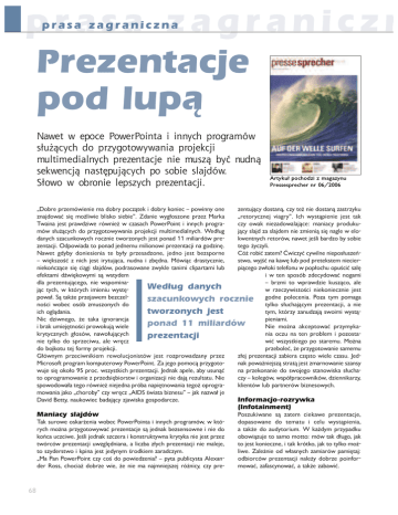 prasa zagraniczn Prezentacje pod lupą prasa zagraniczna 7J`N] ` NYXLN 9X`N[9XRW]J R RWWbLQ Y[XP[JVß` \ũ^ŖLbLQ MX Y[cbPX]X`b`JWRJ Y[XSNTLSR V^U]RVNMRJUWbLQ Y[NcNW]JLSN WRN V^\c Kbî W^MW \NT`NWLS WJ\]¢Y^SLbLQ YX \XKRN \UJSMß` <ũX`X ` XK[XWRN UNY\cbLQ Y[NcNW]JLSR -^`eWaĎ \[OT[PfU f YMSMfeZa <^Q__Q_\^QOTQ^ Z^ "" k/ZM]P[]ePXÇbTPYTPXLOZM]d[ZNeÙ_PVTOZM]dVZYTPNw[ZbTYYdZYP ePY_`UÙNdOZ^_LYÙNed_PŇYTPOZ^_LYÙeL^_]edV` eYLUOZbLÛ ^Tí XZŇWTbTP MWT^VZ ^TPMTPu EOLYTP bdRčZ^eZYP []ePe 8L]VL k]P_Z]dNeYPU aTLR]du 4NS bd^_Ù[TPYTP UP^_ _LV ?bLTYL UP^_ []LbOeTbP ]ÇbYTPŇ b NeL^LNS ;ZbP];ZTY_ T TYYdNS []ZR]L Ned ZbLV YTPeLOZbLWLUÙNP% XLYTLNd []ZO`V` XÇb ^č`ŇÙNdNS OZ []edRZ_ZbdbLYTL []ZUPVNUT X`W_TXPOTLWYdNS BPOč`R UÙNd^WLUOeL^WLUOPXYTPeXTPYTÙ^TíYLRWPbPWZ OLYdNS^eLN`YVZbdNS]ZNeYTP_bZ]eZYdNSUP^_[ZYLOXTWTL]OÇb[]P VbPY_YdNS]P_Z]ÇbYLbP_UPĦWTML]OeZMd^ZMTP ePY_LNUT:O[ZbTLOL_Z[ZYLOUPOYPX`XTWTZYZbT[]PePY_LNUTYLRZOeTYí _PRZŇdNedWT 9LbP_ ROdMd OZYTP^TPYTL _P Mdčd []eP^LOeZYP UPOYZ UP^_ MPe^[Z]YP .ÇŇ]ZMTÛeL_PX*ÚbTNedÛNdbTWYPYTP[Z^č`^ePď w bTíV^eZĦÛ e YTNS UP^_ T]d_`UÙNL Y`OYL T eMíOYL 8ÇbTÙN O]L^_dNeYTP ^_bZbdUĦÛYLVLbíW`M[ZO[]P_PV^_PXYTPNTP] YTPVZďNeÙNP ^Tí NTÙRT ^WLUOÇb [ZO]L^ZbLYP ebdVWP _LYTXT NWT[L]_LXT W`M [TÙNPRZebčZVT_PWPQZY`b[Z[čZNS`Z[`ĦNTÛ^LWí PQPV_LXT OŅbTíVZbdXT ^Ù b^_dOPX T b _PY ^[Z^ÇM eOPNdOZbLÛ YZRLXT OWL []PePY_`UÙNPRZ YTP b^[ZXTYL w M]eXT _Z b[]LbOeTP V`^eÙNZ LWP Według danych UÙN _dNS b V_Ç]dNS TXTPYT` bd^_í b ]ePNedbT^_ZĦNT YTPVZYTPNeYTP UP^_ [ZbLč>Ù_LVŇP[]ePULbPXMPeNePW szacunkowych rocznie RZOYP [ZWPNPYTL ;ZeL _dX [ZXLRL YZĦNT bZMPN Z^ÇM eX`^eZYdNS OZ _dWVZ ^č`NSLUÙNdX []PePY_LNUT L YTP tworzonych jest TNS ZRWÙOLYTL _dX V_Ç]ed eLY`OeLUÙ ^bZTXT bd^_Ù 9TN OeTbYPRZ ŇP _LVL TRYZ]LYNUL [TPYTLXT ponad 11 miliardów TM]LV`XTPUí_YZĦNT[]ZbZV`UÙbTPWP 9TP XZŇYL LVNP[_ZbLÛ []edXdVL V]d_dNeYdNS RčZ^Çb YLbZč`UÙNdNS YTL ZNe` YL _PY []ZMWPX T [ZeZ^_L prezentacji YTP _dWVZ OZ ^[]ePNTb` LWP b]íNe bTÛ b^ed^_VTPRZ [Z ^_L]PX` 8ZŇYL OZ MZUVZ_` _PU QZ]Xd []ZUPVNUT []ePMZWPÛŇP[]edRZ_ZbLYTP^LXPX` 2čÇbYdX []ePNTbYTVTPX ]PbZW`NUZYT^_Çb UP^_ ]Ze[]ZbLOeLYd []ePe ečPU []PePY_LNUT eLMTP]L Neí^_Z bTPWP NeL^` 5PO 8TN]Z^ZQ_[]ZR]LXVZX[`_P]Zbd;ZbP];ZTY_ELUPRZ[ZXZNÙ[]edRZ_Z YLV[ZbLŇYTPU^eÙ^_]L_ÙUP^_eXL]YZbLYTP^eLY^d b`UP^TíZVZčZ$ []ZNb^ed^_VTNS[]PePY_LNUT5POYLVL[PWPLMd`^`YÙÛ YL []ePVZYLYTP OZ ^bZUPRZ ^_LYZbT^VL ^č`NSL _ZZ[]ZR]LXZbLYTPe[]ePO^TíMTZ]^_bTZ]RLYTeLNUTYTPOLUÙ]Pe`W_L_`9TP NedwVZWPRÇbb^[Çč[]LNZbYTVÇbOeTPYYTVL]ed ^[ZbZOZbLčL_PRZ]ÇbYTPŇYTPUPOYL[]ÇMLYL[Tí_YZbLYTL_PRZŇZ[]ZR]L VWTPY_Çb W`M[L]_YP]Çb MTeYP^ZbdNS XZbLYTLULVZkNSZ]ZMduNedb]íNek,4/>ĦbTL_LMTeYP^`uwULVYLebLčUP /LaTO-P__d YL`VZbTPN MLOLUÙNd eULbT^VL RZ^[ZOL]NeP Informacjo-rozrywka (Infotainment) Maniacy slajdów ?LV ^`]ZbP Z^VL]ŇPYTL bZMPN ;ZbP];ZTY_L T TYYdNS []ZR]LXÇb b V_Ç ]dNSXZŇYL[]edRZ_ZbdbLÛ[]PePY_LNUP^ÙUPOYLVMPe^PY^ZbYPTYTPOZ VZďNL`NeNTbP5PĦWTUPOYLV^eNeP]LTVZY^_]`V_dbYLV]d_dVLYTPUP^_[]ePe _bÇ]NÇb []PePY_LNUT `beRWíOYTLYL L WTNeML ečdNS []PePY_LNUT YTP XLWPUP _Z ^edOP]^_bZ TV[TYL UP^_ UPOdYdX Ħ]ZOVTPX eL]LONedX k8L ;LY ;ZbP];ZTY_ Ned NZĦ OZ [ZbTPOePYTL* w [d_L [`MWTNd^_L ,WPcLY OP] =Z^^ NSZNTLŇ OZM]eP bTP ŇP YTP XL YLUXYTPU^ePU ]ÇŇYTNd Ned []P !# ;Z^e`VTbLYP ^Ù eL_PX NTPVLbP []PePY_LNUP OZ[L^ZbLYP OZ _PXL_` T NPW` bd^_Ù[TPYTL L _LVŇP OZ L`Od_Z]T`X B VLŇOdX []ed[LOV` ZMZbTÙe`UP_Z^LXZXZ__Z%XÇb_LVOč`RZULV _ZUP^_VZYTPNeYPT_LVV]Ç_VZULV_Z_dWVZXZŇ WTbP ELWPŇYTP ZO bčL^YdNS eLXTL]Çb [LXTí_LU% ZOMTZ]NÇb []PePY_LNUT YLWPŇd OZM]eP [ZTYQZ] XZbLÛeLQL^NdYZbLÛ L_LVŇPeLMLbTÛ na prasa zagraniczna /T^U_`UZM.XMWQ_fQR/[^\[^M`Q/[YYaZU OM`U[Z ;XeY\a_ 1a^[\M 10 kroków do udanej prezentacji ?]ed NedYYTVT bL]`YV`UÙNP []PePY_LNUí% _PXL_ NeL^ UPU _]bLYTL T L`Od_Z]T`X /ZMÇ] L]R`XPY_LNUT b[čdbL YL M`OZbí []PePY_LNUT BTe`LWTeLNUPNeí^_Zb^[ZXLRLUÙ[]ePVLedbLYPTYQZ]XLNUP5POYLVROd _]PĦÛ []PePY_LNUT YTP UP^_ TY_P]P^`UÙNL bÇbNeL^ YTP `]L_`UP UPU ŇLOYL bTe`LWTeLNUL ;]ed _bZ]ePYT` []PePY_LNUT YTP bZWYZ YLO`ŇdbLÛ kPQPV_Çb ^[PNULW YdNSu Y[ ^[LOLUÙNdNS WT_P]PV ]ÇŇYZ]ZOYdNS OŅbTíVÇb BLŇYP UP^_ _PŇ eLNSZbLYTP ]ÇbYZbLRT XTíOed []PePY_ZbLYdX _PV^_PX L PQPV _LXTMd_PO]`RTPYTPZOb]LNLčd`bLRT^č`NSLNedZObčLĦNTbPU_]PĦNT []ePVLe` @ŇdbLYTP ^_LYOL]OZbdNS NWT[L]_ÇbOPYP]b`UP B^ed^_VZ NZ XL MdÛ [ZVLeLYP X`^T MdÛ bTOZNeYP OWL Z^ÇM ^TPOeÙ NdNS b Z^_L_YTNS ]eíOLNS @bLRL% VZWZ]d ]ZeXd_P ML]bd T NeNTZYVT TYLNePU bdRWÙOLUÙ YL PV]LYTP VZX[`_P]L YTŇ YL O`ŇdX PV]LYTP OZ bdĦbTP_WLYTL ZM]Le` e ]e`_YTVL ! /Z _bZ]ePYTL []PePY_LNUT `ŇdbL ^Tí ^_LYOL]OZbdNS NeNTZYPV V_Ç]P ^ÙeLTY^_LWZbLYPYLVLŇOdXVZX[`_P]eP?dWVZb_PY^[Z^ÇMed^V`UP ^Tí [PbYZĦÛ ŇP []PePY_LNUL eLOeTLčL _LVŇP [ZOTYYdX^d^_PXPX " ?PV^_eOUíNTLTW`^_]LNUPLYTXLNUPW`MQTWXd[ZbTYYdb^[ZXLRLÛ[]P ePY_LNUí TW`M beXLNYTLÛ ZOOeTLčdbLYTP bdVčLO` @bLRL% YLWPŇd eLOMLÛ Z _Z Md []PePY_LNUL X`W_TXPOTLWYL eLOeTLčLčL _LVŇP YLTYYdNS VZX[`_P]LNS # ELb^eP XTPU eP ^ZMÙ VZ[Tí []PePY_LNUT $ ;]ePÛbTNe bdVčLO []ePO UPRZ bdRčZ^ePYTPX @bLŇLUYLWTXT_NeL^` 6ZY^[PV_d eLbTP]LUÙ [ZO^_LbZbP bTLOZXZĦNT e []PePY_LNUT w YTP XZRÙ []eP^eVLOeLÛ b ^č`NSLYT` []PePY_LNUT L ^č`NSLNeP YTP [ZbTYYT MdÛeX`^ePYT YL YTNS YZ_ZbLÛ ;ZbZOePYTL ;ZbdŇ^ePeLčZŇPYTLOZ_dNeÙNP[]edRZ_ZbLYTL[]PePY_LNUT^ÙOeT^TLUWP[TPU^[Pč YTLYP YTŇ UP^eNeP []ePO VTWVZXL WL_d BÇbNeL^ XÇbNd NSNÙNd eLZQP]ZbLÛ _]ZNSíbTe`LWYdNSL_]LVNUT[]edRZ_ZbdbLWTQZWTPT^WLUOd9TPMdčZbTíNXTPU^NL YL ^[ZY_LYTNeYZĦÛ B^ed^_VZ NZ []PePY_ZbLYZ X`^TLčZ MdÛ []edRZ_ZbLYP YL bTPWP OYT bNePĦYTPU :MPNYTP b Z^_L_YTX XZXPYNTP XZŇYL OZVZYdbLÛ eXTLY[ZbZč`UÙN^TíYL[]edVčLOYLYLUYZb^ePbTLOZXZĦNT[]L^ZbP:MZV _PV^_` T ZM]LeVÇb MPe []ZMWPX` XZŇYL ]ÇbYTPŇ OZčÙNeLÛ QTWXd T LYTXLNUP Pomysł poszukiwany 6_Z UPOYLV NSNP NeP][LÛ VZ]edĦNT e eLWP_ YZbPRZ [TíVYPRZ ĦbTL_L []PePY _LNUT [Z_]ePM`UP []ePOP b^ed^_VTX ^[ÇUYPRZ [ZXd^č` TYYZbLNdUYPRZ OP^T RYPv` _čL ĦbTP_YdNS QZ_ZR]LQTT R]LQTVT T QTWXÇb Z]Le ePM]LYdNSTYQZ]XLNUT 9TP^_P_dbTíV^eZĦÛ