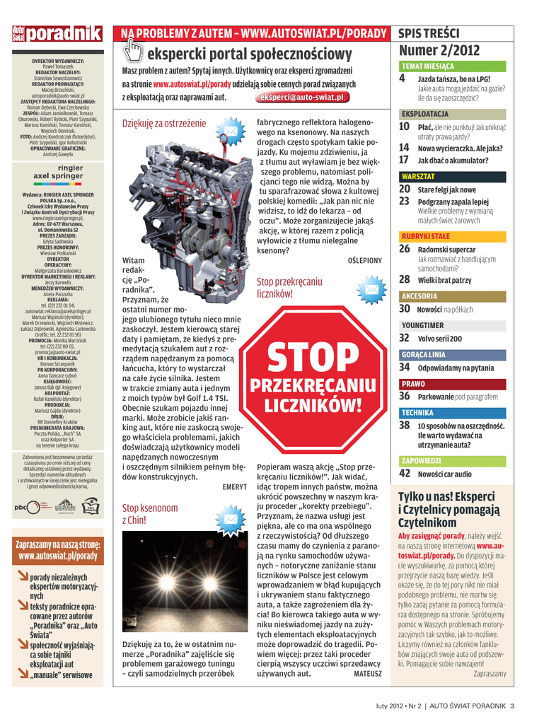 NAA PROBLEMY N PR Z AUTEM – WWW.AUTOSWIAT.PL/PORADY SPIS TREŚCI DYREKTOR WYDAWNICZY: Paweł Tomaszek REDAKTOR NACZELNY: Stanisław Sewastianowicz REDAKTOR PROWADZĄCY: Maciej Brzeziński, [email protected] ZASTĘPCY REDAKTORA NACZELNEGO: Roman Dębecki, Ewa Czechowska ZESPÓŁ: Adam Jamiołkowski, Tomasz Okurowski, Robert Rybicki, Piotr Szypulski, Mariusz Kamiński, Tomasz Kamiński, Wojciech Denisiuk. FOTO: Andrzej Kondratczyk (fotoedytor), Piotr Szypulski, Igor Kohutnicki OPRACOWANIE GRAFICZNE: Andrzej Gawęda Wydawca: RINGIER AXEL SPRINGER POLSKA Sp. z o.o., Członek Izby Wydawców Prasy i Związku Kontroli Dystrybucji Prasy www.ringieraxelspringer.pl, Adres: 02-672 Warszawa, ul. Domaniewska 52 PREZES ZARZĄDU: Edyta Sadowska PREZES HONOROWY: Wiesław Podkański DYREKTOR OPERACYJNY: Małgorzata Barankiewicz DYREKTOR MARKETINGU I REKLAMY: Jerzy Karwelis MENEDŻER WYDAWNICZY: Aneta Pacuszka REKLAMA: tel. (22) 232 01 04, [email protected] Mariusz Wąsiński (dyrektor), Marek Drzewiecki, Wojciech Mistewicz, Łukasz Dąbrowski, Agnieszka Laskowska (traffic; tel. 22 232 01 50) PROMOCJA: Monika Marciniak tel. (22) 232 00 05, [email protected] HR I KOMUNIKACJA: Roman Szczepanik PR KORPORACYJNY: Anna Gancarz-Luboń KSIĘGOWOŚĆ: Janusz Bąk (gł. księgowy) KOLPORTAŻ: Rafał Kamiński (dyrektor) PRODUKCJA: Mariusz Gajda (dyrektor) DRUK: RR Donnelley Kraków PRENUMERATA KRAJOWA: Poczta Polska, „Ruch” SA oraz Kolporter SA na terenie całego kraju Zabroniona jest bezumowna sprzedaż czasopisma po cenie niższej od ceny detalicznej ustalonej przez wydawcę. Sprzedaż numerów aktualnych i archiwalnych w innej cenie jest nielegalna i grozi odpowiedzialnością karną. PRINTED IN POLAND TEMAT MIESIĄCA Masz problem z autem? Spytaj innych. Użytkownicy oraz eksperci zgromadzeni na stronie www.autoswiat.pl/porady udzielają sobie cennych porad związanych [email protected] z eksploatacją oraz naprawami aut. Dziękuję za ostrzeżenie Witam redakcję „Poradnika”. Przyznam, że ostatni numer mojego ulubionego tytułu nieco mnie zaskoczył. Jestem kierowcą starej daty i pamiętam, że kiedyś z premedytacją szukałem aut z rozrządem napędzanym za pomocą łańcucha, który to wystarczał na całe życie silnika. Jestem w trakcie zmiany auta i jednym z moich typów był Golf 1.4 TSI. Obecnie szukam pojazdu innej marki. Może zrobicie jakiś ranking aut, które nie zaskoczą swojego właściciela problemami, jakich doświadczają użytkownicy modeli napędzanych nowoczesnym i oszczędnym silnikiem pełnym błędów konstrukcyjnych. EMERYT Stop ksenonom z Chin! Zapraszamy na naszą stronę: www.autoswiat.pl/porady porady niezależnych ekspertów motoryzacyjnych teksty poradnicze opracowane przez autorów „Poradnika” oraz „Auto Świata” społeczność wyjaśniająca sobie tajniki eksploatacji aut „manuale” serwisowe Numer 2/2012 ekspercki portal społecznościowy Dziękuję za to, że w ostatnim numerze „Poradnika” zajęliście się problemem garażowego tuningu – czyli samodzielnych przeróbek 4 Jazda tańsza, bo na LPG! Jakie auta mogą jeździć na gazie? Ile da się zaoszczędzić? EKSPLOATACJA fabrycznego reflektora halogenowego na ksenonowy. Na naszych drogach często spotykam takie pojazdy. Ku mojemu zdziwieniu, ja z tłumu aut wyławiam je bez większego problemu, natomiast policjanci tego nie widzą. Można by tu sparafrazować słowa z kultowej polskiej komedii: „Jak pan nic nie widzisz, to idź do lekarza – od oczu”. Może zorganizujecie jakąś akcję, w której razem z policją wyłowicie z tłumu nielegalne ksenony? OŚLEPIONY 10 Stop przekręcaniu liczników! 28 14 17 Płać, ale nie punktuj! Jak uniknąć utraty prawa jazdy? Nowa wycieraczka. Ale jaka? Jak dbać o akumulator? WARSZTAT 20 23 Stare felgi jak nowe Podgrzany zapala lepiej Wielkie problemy z wymianą małych świec żarowych RUBRYKI STAŁE 26 Radomski supercar Jak rozmawiać z handlującym samochodami? Wielki brat patrzy AKCESORIA 30 STOP PRZEKRĘCANIU LICZNIKÓW! Nowości na półkach YOUNGTIMER 32 Volvo serii 200 GORĄCA LINIA 34 Odpowiadamy na pytania PRAWO 36 Parkowanie pod paragrafem TECHNIKA 38 Popieram waszą akcję „Stop przekręcaniu liczników!”. Jak widać, idąc tropem innych państw, można ukrócić powszechny w naszym kraju proceder „korekty przebiegu”. Przyznam, że nazwa usługi jest piękna, ale co ma ona wspólnego z rzeczywistością? Od dłuższego czasu mamy do czynienia z paranoją na rynku samochodów używanych – notoryczne zaniżanie stanu liczników w Polsce jest celowym wprowadzaniem w błąd kupujących i ukrywaniem stanu faktycznego auta, a także zagrożeniem dla życia! Bo kierowca takiego auta w wyniku nieświadomej jazdy na zużytych elementach eksploatacyjnych może doprowadzić do tragedii. Powiem więcej: przez taki proceder cierpią wszyscy uczciwi sprzedawcy używanych aut. MATEUSZ 10 sposobów na oszczędność. Ile warto wydawać na utrzymanie auta? ZAPOWIEDZI 42 Nowości car audio Tylko u nas! Eksperci i Czytelnicy pomagają Czytelnikom Aby zasięgnąć porady, należy wejść na naszą stronę internetową www.autoswiat.pl/porady. Do dyspozycji macie wyszukiwarkę, za pomocą której przejrzycie naszą bazę wiedzy. Jeśli okaże się, że do tej pory nikt nie miał podobnego problemu, nie martw się, tylko zadaj pytanie za pomocą formularza dostępnego na stronie. Spróbujemy pomóc w Waszych problemach motoryzacyjnych tak szybko, jak to możliwe. Liczymy również na członków fanklubów znających swoje auta od podszewki. Pomagajcie sobie nawzajem! Zapraszamy luty 2012 • Nr 2 | AUTO ŚWIAT PORADNIK 3