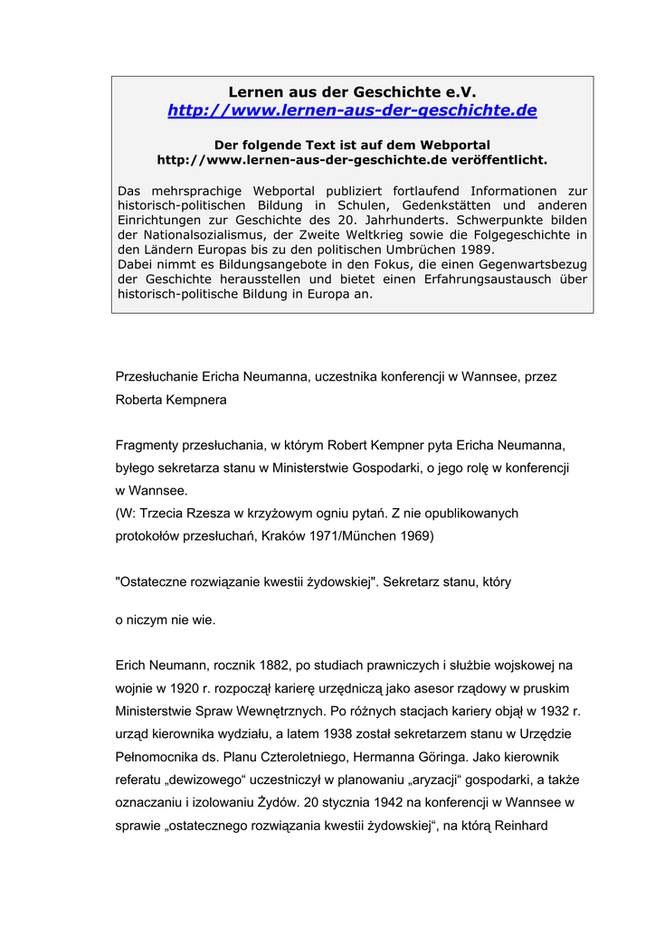 Lernen aus der Geschichte e.V. http://www.lernen-aus-der-geschichte.de Der folgende Text ist auf dem Webportal http://www.lernen-aus-der-geschichte.de veröffentlicht. Das mehrsprachige Webportal publiziert fortlaufend Informationen zur historisch-politischen Bildung in Schulen, Gedenkstätten und anderen Einrichtungen zur Geschichte des 20. Jahrhunderts. Schwerpunkte bilden der Nationalsozialismus, der Zweite Weltkrieg sowie die Folgegeschichte in den Ländern Europas bis zu den politischen Umbrüchen 1989. Dabei nimmt es Bildungsangebote in den Fokus, die einen Gegenwartsbezug der Geschichte herausstellen und bietet einen Erfahrungsaustausch über historisch-politische Bildung in Europa an. Przesłuchanie Ericha Neumanna, uczestnika konferencji w Wannsee, przez Roberta Kempnera Fragmenty przesłuchania, w którym Robert Kempner pyta Ericha Neumanna, byłego sekretarza stanu w Ministerstwie Gospodarki, o jego rolę w konferencji w Wannsee. (W: Trzecia Rzesza w krzyżowym ogniu pytań. Z nie opublikowanych protokołów przesłuchań, Kraków 1971/München 1969) "Ostateczne rozwiązanie kwestii żydowskiej". Sekretarz stanu, który o niczym nie wie. Erich Neumann, rocznik 1882, po studiach prawniczych i służbie wojskowej na wojnie w 1920 r. rozpoczął karierę urzędniczą jako asesor rządowy w pruskim Ministerstwie Spraw Wewnętrznych. Po różnych stacjach kariery objął w 1932 r. urząd kierownika wydziału, a latem 1938 został sekretarzem stanu w Urzędzie Pełnomocnika ds. Planu Czteroletniego, Hermanna Göringa. Jako kierownik referatu „dewizowego“ uczestniczył w planowaniu „aryzacji“ gospodarki, a także oznaczaniu i izolowaniu Żydów. 20 stycznia 1942 na konferencji w Wannsee w sprawie „ostatecznego rozwiązania kwestii żydowskiej“, na którą Reinhard Heydrich zaprosiłczołowych przedstawicieli najwyższych władz Rzeszy, Neumann reprezentował ministerstwa: Gospodarki, Pracy, Finansów, Wyżywienia, Komunikacji oraz Uzbrojenia i Amunicji. W 1945 r. został internowany, na początku 1948 zwolniony z powodu choroby i zmarł jeszcze w tym samym roku. Kopię protokołu z podręcznych akt uczestnika konferencji z ramienia Ministerstwa Spraw Zagranicznych, podsekretarza stanu Martina Luthera, odnaleziono dopiero jesienią1947 r., tuż przed udokumentowanym tutaj przesłuchaniem Neumanna. Mimo tego dowodu żyjący jeszcze uczestnicy konferencji utrzymywali strategię obrony, polegającą na zaprzeczaniu, że kiedykolwiek otrzymali osobiście taki protokół. Dowodzą tego wybrane tutaj fragmenty przesłuchania. (W: Trzecia Rzesza w krzyżowym ogniu pytań. Z nie opublikowanych protokołów przesłuchań, tłum. K. Bunsch, Kraków 1971) Dr Kempner: - Dawnośmy się nie widzieli; czy pan sobie mnieprzypomina? Sekretarz stanu Neumann: - W Oberursel (w Taunus, centrum przesłuchań). P. - Słusznie. Od tego czasu się nie widzieliśmy, to już wnet dwa lata. Obecnie nadszedł czas, by porozmawiać o pańskim osobistym losie. Nie ma zbyt wielu ludzi, którzy tak jak pan brali udział w posiedzeniach o decydującym znaczeniu. O. - Trudno mi to samemu oceniać ... P. - Panie Neumann, chcę panu coś powiedzieć: jeżeli pan teraz, jako dawniejszy sekretarz stanu, będzie wobec mnie usiłował umniejszyć swoje ówczesne stanowisko i znaczenie, to absolutnie ma pan do tego prawo. Jeśli pan nie chce, nie musi pan ze mną rozmawiać. Ale powiem panu cośinnego: to ja, jeśli będzie mi pan opowiadał takie rzeczy, nie myślę z panem rozmawiać. Ilu sekretarzy stanu było w Trzeciej Rzeszy? Około 50, nieprawda? O. - Tak. P. - To byli ci panowie, którzy znali sprawy. Na posiedzeniach mówiono bardzo jasno. Wasz nieżyjący marszałek Rzeszy nie brał wody do ust. O. - Göring mówił bardzo wiele rzeczy, które można ocenić tylko pod kątem jego specyficznej osobowości. P. - Czy miał pan kiedy do czynienia ze sprawami żydowskimi, czy teżbyło to poza pańskim resortem? O. - To było poza moim zadaniem. P. - Czy wiadomo panu, że Żydów na Wschodzie wymordowano? O. - O tym słyszałem. P. - Kiedy pan po raz pierwszy dowiedział się, że taki program nabrałurzędowej mocy? O. - W czasie mojego uwięzienia. P. - Urzędowo przedtem pan o tym nie słyszał? O. - Nigdy. P. - Mam na myśli, jako sekretarz stanu do spraw planu czteroletniego. O. - Plan czteroletni jako taki nie miał nic wspólnego ze sprawążydowską. P. - Czy ta afera nie była na ustach wszystkich? O. - Nie. P. - Dla przygotowania tych spraw musiały się przecież odbywaćkonferencje. O. - To możliwe. P. - Czy nie był pan może raz zaproszony na taką konferencję? O. - Nie. P. - Kto, pańskim zdaniem, był zaproszony? Jaki resort? O. - Resorty polityczne. Przypuszczam, Ministerstwo Spraw Wewnętrznych, Kancelaria Rzeszy. P. - Kto jeszcze? O. - To były te dwa główne resorty polityczne. Tam, gdzie w rachubęwchodziły sprawy gospodarcze, kompetentne było Ministerstwo Gospodarki; tak samo gdy chodziło o problemy tak zwanej aryzacji. P. - Czy znał pan Himmlera? Czy brał pan udział w jakiejś konferencji z nim? O. - Nigdy. P. - Czy znał pan Heydricha? O. - Tak. P. - Czy konferował z panem? O. - Nie. P. - Czy nie miał pan nic wspólnego z tymi żydowskimi sprawami? O. - Nie, z tymi nie. Po pogromie w roku 1938 Göring otrzymał zadanie oczyszczenia tych spraw i odbył kilka posiedzeń, o których i ja słyszałem. P. - Czy brał pan w nich udział? O. - Brałem udział w jednej konferencji w Ministerstwie Lotnictwa. P. - Kiedy? O. - Po wydarzeniach z listopada 1938. P. - Czy to była ta słynna konferencja, na której był obecny Stuckart? O. - Tego nie mogę powiedzieć. To była konferencja, na której Göring powiedział, że polecono mu unikać powtórzenia się takich spraw. P. - Ponieważ jest to takie straszne? O. - Tak. P. - Kiedy rozmawiał pan z Himmlerem albo Heydrichem? O. - Nigdy z nimi nie rozmawiałem. Na przyjęciach wymieniano pozdrowienia i na tym koniec. P. - Czy mieszkał
