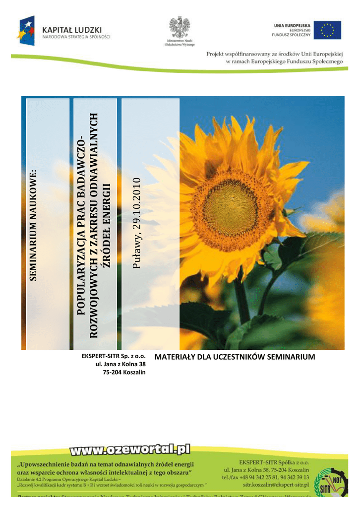 EKSPERT-SITR Sp. z o.o. ul. Jana z Kolna 38 75-204 Koszalin MATERIAŁY DLA UCZESTNIKÓW SEMINARIUM Puławy, 29.10.2010 POPULARYZACJA PRAC BADAWCZOROZWOJOWYCH Z ZAKRESU ODNAWIALNYCH ŹRÓDEŁ ENERGII SEMINARIUM NAUKOWE: SPIS TREŚCI 1. Program seminarium naukowego 2. Informacje ogólne 2.1. Popularyzacja prac badawczo-rozwojowych z zakresu odnawialnych źr ó de łe ergii- mgr inż. Wojciech Krużewski 3. Prezentacje 3.1. Hybrydowe układy technologiczne wytwarzania energii i paliw z odnawialnych źr ó de łe ergii- mgr inż. Wojciech Krużewski 3.2. Zastosowanie instalacji biogazowych w gospodarstwach rodzinnych i farmerskich z obrób ką u bstratu pofermentacyjnego- prof. dr hab. inż. Wacław Romaniuk 3.3. Powstanie inteligentnych sieci elektroenergetycznych niezbędny warunek rozwoju z wykorzystaniem zielonej energetyki odnawialnych źr ó de łe ergii- dr inż. Bogdan Sedler 3.4. Zastosowanie czystego oleju rośl in nego, a ko aliw a ru gie j generacji do napędzania konstrukcyjnie zaawansowanych silników spalinowych- dr inż. Piotr Pasyniuk 4. Materiały dodatkowe 4.1. 4.2. 4.3. 4.4. Energetyka a odnawialne źr ó dł a e ergii- dr inż. Wiesław Golka Technologie wykorzystania biopaliw stałych- mgr inż. Agnieszka Trojanowska Konwersja biomasy do paliw płynnych II generacji oraz CNG i LNG przeznaczonych do napędu ciągników o ln ic zych a przykładzie praktycznych zastosowań- prof. dr hab. inż. Andrzej Myczko Sposób n sta la cja o dgazow ania io m asy, dpadów ip liw kopalnych- dr Henryk Karcz, mgr inż. Stanisław Szczepaniak PROGRAM SEMINARIUM NAUKOWEGO „POPULARYZACJA PRAC BADAWCZO - ROZWOJOWYCH Z ZAKRESU ODNAWIALNYCH ŹRÓDEŁ ENERGII” Termin: Miejsce: 29 października 2010 r. Instytut Uprawy Nawożenia i Gleboznawstwa Państwowy Instytut Badawczy Ul. Czartoryskich 8, 24-100 Puławy 8.45 – 9.00 Rejestracja uczestników. Kawa i poczęstunek powitalny. Wprowadzenie 9.00 – 9.15 mgr inż. Wojciech Krużewski (EKSPERT-SITR Sp. z o.o. w Koszalinie) Hybrydowe układy technologiczne wytwarzania energii i paliw z odnawialnych źródeł energii 9.15 – 10.30 mgr inż. Wojciech Krużewski (EKSPERT-SITR Sp. z o.o. w Koszalinie) 10.30 – 10.45 Przerwa kawowa Zastosowanie instalacji biogazowych w gospodarstwach rodzinnych i farmerskich z obróbką substratu pofermentacyjnego 10.45 – 12.15 12.15 – 12.45 prof. dr hab. inż. Wacław Romaniuk (Instytut Technologiczno-Przyrodniczy w Warszawie) Lunch Powstanie inteligentnych sieci elektroenergetycznych - niezbędny warunek rozwoju z wykorzystaniem zielonej energetyki odnawialnych źródeł energii 12.45 – 14.15 dr inż. Bogdan Sedler (Fundacja Naukowo-Techniczna „Gdańsk” Instytut Polska Sieć Gospodarki Morskiej) Zastosowanie czystego oleju roślinnego, jako paliwa drugiej generacji do napędzania konstrukcyjnie zaawansowanych silników spalinowych 14.15 – 15.45 dr inż. Piotr Pasyniuk (Instytut Technologiczno-Przyrodniczy w Falentach) 15.45 – 16.00 Dyskusja UDZIAŁ W SEMINARIUM JEST BEZPŁATNY SEMINARIUM NAUKOWE INFORMACJE OGÓLNE 29.10.2010 Popularyzacja prac badawczorozwojowych z zakresu odnawialnych źródeł energii mgr inż. Wojciech Krużewski „POPULARYZACJA PRAC BADAWCZO - ROZWOJOWYCH Z ZAKRESU ODNAWIALNYCH ŹRÓDEŁ ENERGII” Seminarium naukowe w ramach projektu: Upowszechnianie badań na temat odnawialnych źródeł energii oraz wsparcie ochrona własności intelektualnej z tego obszaru. mgr inż. Wojciech Krużewski 29.10.2010, Puławy Finansowanie: Projekt współfinansowany ze środków Unii Europejskiej w ramach Europejskiego Funduszu Społecznego (EFS). Działanie 4.2 Programu Operacyjnego Kapitał Ludzki: „Rozwój kwalifikacji kadr systemu B + R i wzrost świadomości roli nauki w rozwoju gospodarczym" 2 1 Cele projektu Celem głównym projektu jest podniesienie wiedzy w zakresie prac badawczo-rozwojowych i badań naukowych z zakresu Odnawialnych Źródeł Energii oraz wsparcie ochrony własności intelektualnej z tego obszaru na terenie kraju. 3 Cele szczegółowe upowszechnienie i uświadomienie co do znaczenia prowadzonych prac badawczo-rozwojowych w zakresie OZE, przedstawienie barier i sugestii rozwiązań we wdrażaniu wyników badań do praktyki w sektorach mogących wykorzystywać OZE podwyższenie wiedzy związanej z ochroną własności intelektualnej z zakresu OZE wśród 60 pracowników jednostek naukowych (w tym 35% tj. 21 kobiet oraz 65% tj. 36 mężczyzn) 4 2 Partner Projektu Stowarzyszenie Naukowo Techniczne Inżynierów i Techników Rolnictwa Zarząd Główny w Warszawie 5 Działania w projekcie: Wortal naukowoinformacyjny Szkolenia nt. ochrony własności intelektualnej z zakresu OZE Zarządzanie i koordynacja realizacji projektu Targi promocyjne Seminaria Publikacja nt. osiągnięć z zakresu OZE 6 3 Seminaria • W ramach projektu przeprowadzonych zostanie 19 jednodniowych otwartych seminariów naukowych na temat OZE mających na celu uświadomienie i popularyzację prac badawczo-rozwojowych z tego zakresu. Są skierowane do pracowników jednostek naukowych. • Seminaria będą bezpośrednio transmitowane w Internecie na www.ozewortal.pl wortalu . Seminaria będą organizowane w całej Polsce, w zależności od zainteresowania. Informacje o seminariach będą publikowane na wortalu. 7 Targi promocyjne Planowany jest także udział w targach promocyjnych mających na celu popularyzację OZE. Celem tego działania jest zaprezentowanie osiągnięć naukowych w obszarze OZE, prezentacja broszur naukowych, materiałów informacyjnych oraz bezpośrednie konsultacje i spotkania z uczestnikami zainteresowanymi OZE. Będziemy m.in.: POLEKO, Międzynarodowe Targi Ochrony Środowiska, Poznań, 23-26.11.2010 8 4 Szkolenia nt. ochrony własności intelektualnej 4-dniowe szkolenia nt. ochrony własności intelektualnej z zakresu OZE. Szkolenia są przeznaczone dla 60 pracowników jednostek naukowych. Tematyka będzie obejmować: głównie zakres ustawy Prawo własności intelektualnej, p