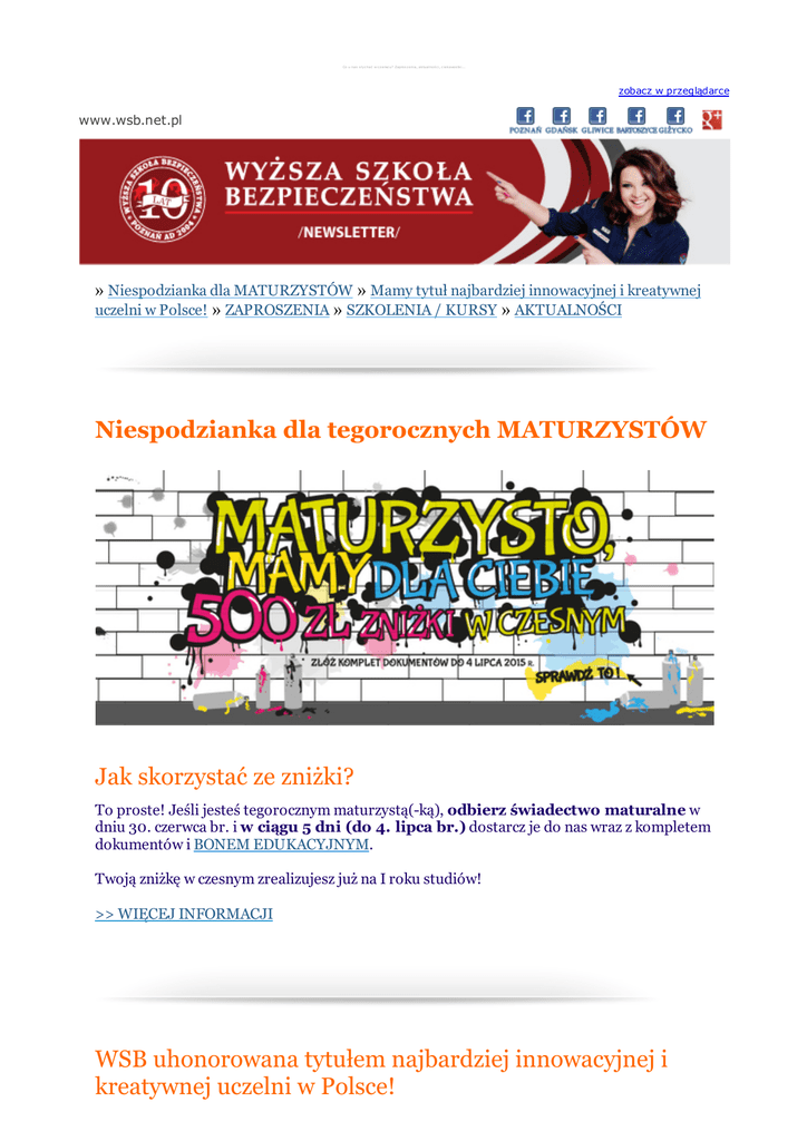 Co u nas s łyc hać w c z erwc u? Zapros z enia, aktualnoś c i, c iekawos tki... zobacz w przeglądarce www.wsb.net.pl » Niespodzianka dla MATURZYSTÓW » Mamy tytuł najbardziej innowacyjnej i kreatywnej uczelni w Polsce! » ZAPROSZENIA » SZKOLENIA / KURSY » AKTUALNOŚCI Niespodzianka dla tegorocznych MATURZYSTÓW Jak skorzystać ze zniżki? To proste! Jeśli jesteś tegorocznym maturzystą(ką), odbierz świadectwo maturalne w dniu 30. czerwca br. i w ciągu 5 dni (do 4. lipca br.) dostarcz je do nas wraz z kompletem dokumentów i BONEM EDUKACYJNYM. Twoją zniżkę w czesnym zrealizujesz już na I roku studiów! >> WIĘCEJ INFORMACJI WSB uhonorowana tytułem najbardziej innowacyjnej i kreatywnej uczelni w Polsce! Z przyjemnością informujemy, iż 10. czerwca br. Wyższa Szkoła Bezpieczeństwa po raz kolejny uzyskała certyfikaty: Wiarygodna Szkoła oraz Dobra UczelniaDobra Praca, a także znalazła się w zaszczytnym gronie sześciu najlepszych Uczelni wyróżnionych w konkursie na Najbardziej innowacyjną i kreatywną Uczelnię w Polsce w tworzeniu perspektyw zawodowych. więcej informacji... ZAPROSZENIA SZKOLENIA / KURSY Międzynarodowa Szkoła Letnia Studentów na Ukrainie Protokół dyplomatyczny w pracy urzędników samorządowych W dniach 2528 maja 2015 r. delegacja Wyższej Szkoły Bezpieczeństwa z siedzibą w Poznaniu gościła na Tarnopolskim Państwowym Uniwersytecie Medycznym na Ukrainie. Zachęcamy do udziału w szkoleniu: ,,Pozycja prawna prezydenta, burmistrza, wójta, starosty. Praktyczne stosowanie protokołu dyplomatycznego w pracy urzędników samorządowych. Zagrożenia karne związane z pełnioną funkcją”. Owocem międzynarodowej kooperacji jest m.in. możliwość udziału naszych studentów w X Międzynarodowej Szkole Letniej Studentów, która organizowana jest w dniach 1728 lipca 2015 br. w Tarnopolu. czytaj więcej... VII Międzynarodowa Konferencja Naukowa: BEZPIECZEŃSTWO WIELORAKIE PERSPEKTYWY Tegoroczna edycja konferencji odbywać się będzie pod hasłem "Racjonalność a bezpieczeństwo Szkolenie jest przeznaczone dla kadry kierowniczej urzędów i ich jednostek organizacyjnych. Na wykładowców wybraliśmy praktyków z wieloletnim doświadczeniem. Szkolenie ma dostarczyć Państwu szeregu praktycznych porad, przypomnieć zasady w większości znane oraz przestrzec przed popełnieniem niektórych błędów. Szkolenie odbędzie się w dniach 1819 czerwca br. w Łagowie (woj. lubuskie). czytaj więcej... AKTUALNOŚCI Pozytywna ocena PKA dla organizacji". Celem spotkania jest wymiana myśli, doświadczeń oraz prezentacja wyników badań dotyczących funkcjonowania człowieka, społeczeństwa oraz państwa. Rozważania obejmować będą wieloaspektowe perspektywy racjonalności w kontekście szeroko pojętego bezpieczeństwa organizacji. Konferencja adresowana jest do przedstawicieli różnych środowisk zarówno ludzi nauki, biznesu i administracji, nauczycieli wszystkich szczebli kształcenia, jak i pracowników instytucji państwowych i samorządowych, studentów, czyli osób związanych z wielowymiarowym bezpieczeństwem, a także firm zainteresowanych problematyką bezpieczeństwa od strony teoretycznej i praktycznej. Konferencję zaplanowano w terminie 2325 września 2015 roku, zaś obrady będą się odbywać w Hotelu Mikulski*** w Gliwicach – uroczym mieście położonym na południu Polski. Termin zgłoszeń: 31. sierpnia 2015 r. szczegóły... I Międzynarodowa Konferencja Naukowa „Edukacja elit XXI wieku" Serdecznie zachęcamy do udziału w konferencji, która podejmować będzie niezwykle ważny, zdaniem organizatorów, temat odpowiedniej edukacji i kreacji elit.Temat ten wydaje się szczególnie aktualny także z związku z tak eksponowaną dzisiaj rolą liderstwa i przywództwa edukacyjnego. Stąd szczególnego znaczenia nabierają następujące kwestie: Kompetencji i kwalifikacje elit XXI wieku. Kształcenia elit XXI wieku w znowelizowanym systemie szkolnictwa wyższego. Elitaryzmu a egalitaryzmu edukacyjnego i w edukacji. Elitaryzmu w kontekście idei przywództwa edukacyjnego. Bezpieczeństwa elit w kulturze masowej i inne. bezpieczeństwa narodowego w Gliwicach Mamy niebywałą przyjemność poinformować, iż Polska Komisja Akredytacyjna, która objęła oceną programową kierunek bezpieczeństwo narodowe w Gliwicach, uchwałą z dnia 7. maja 2015 r. wydała pozytywną ocenę jakości kształcenia na wspomnianym kierunku, prowadzonym przez Wydział Studiów Społecznych w Gliwicach. Uczelnia spełniła wszystkie przyjęte kryteria jakościowe oceny w stopniu najwyższym. szczegóły... Długa droga po nagrody wspomnienie bartoszyckiego Rajdu Studenci z Koła Naukowego ,,Bractwo Róża" Wyższej Szkoły Bezpieczeństwa, Wydziału Nauk Społecznych w Bartoszycach, wspólnie z Klubem Wojskowym 20. Bartoszyckiej Brygady Zmechanizowanej zorganizowali po raz pierwszy Rodzinny Rajd Pieszy ,,Wędrowiec'', który odbył się 31. maja 2015 r. w ramach Dnia Dziecka. 70 uczestników rajdu zmagało się na dwóch niezwykle malowniczych trasach i miało do pokonania na podstawowej trasie 8,5 km. Bardziej wytrwali mogli spróbować swoich sił na dłuższej o długości 12,5 km. Były nagrody, gry i zabawy w... pianie, a także wiele, wiele innych atrakcji. ZOBACZ DOKŁADNIEJSZĄ RELACJĘ >> Gdańscy studenci w Centrum Powiadamiania Ratunkowego Dla Centrum Powiadamiania Ratunkowego (CPR) mieszczącego się przy ul. Sosnowej 2 w Gdańsku, miesiąc maj obfitował w wizyty studentów z Wydziału Studiów Społecznych w Gdańsku, chcących zgłębić swą wiedzę nt. struktur, organizacji i funkcjonowania systemu obsługującego zgłoszenia alarmowe. Dzięki wizycie studenci w sposób praktyczny zapoznali się z historią, strukturą, zadaniami Konferencja odbędzie się w dniach 2325 września 2015 r., w Hotelu Mikulski*** w Gliwicach. Termin zgłoszeń: 31. sierpnia 2015 r. szczegóły... i rolą CPRu. Poznali wymogi formalno prawne, które
