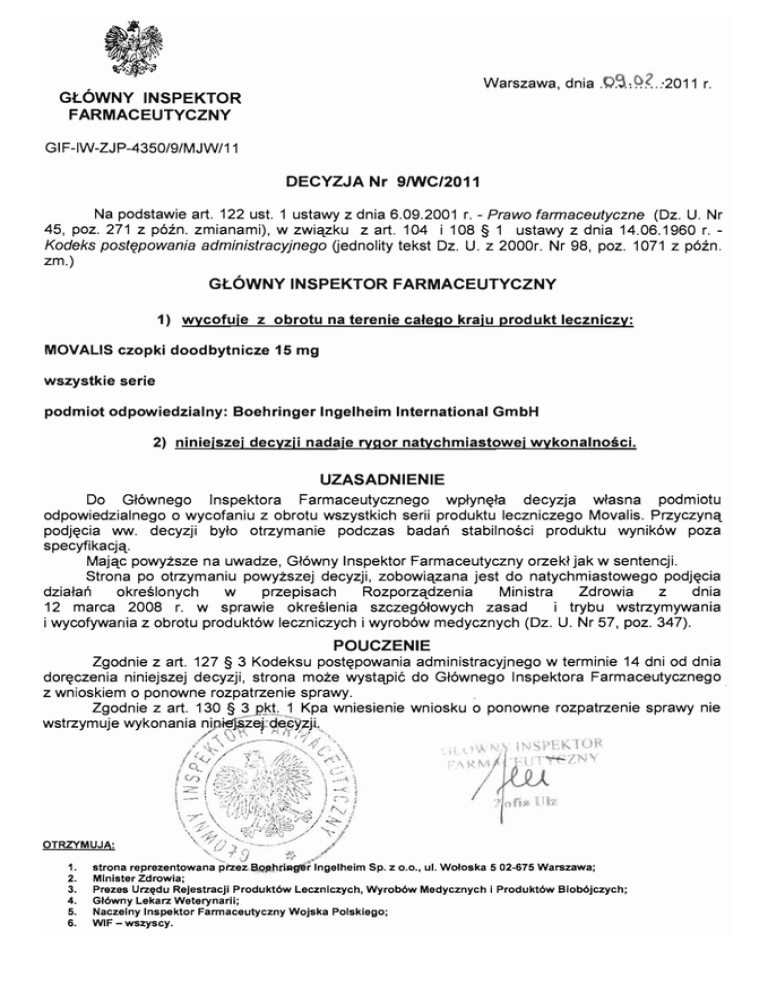 odpowiedzialnego 0 wycofaniu z obrotu wszystkich serii produktu leczniczego Movalis. Przyczyna