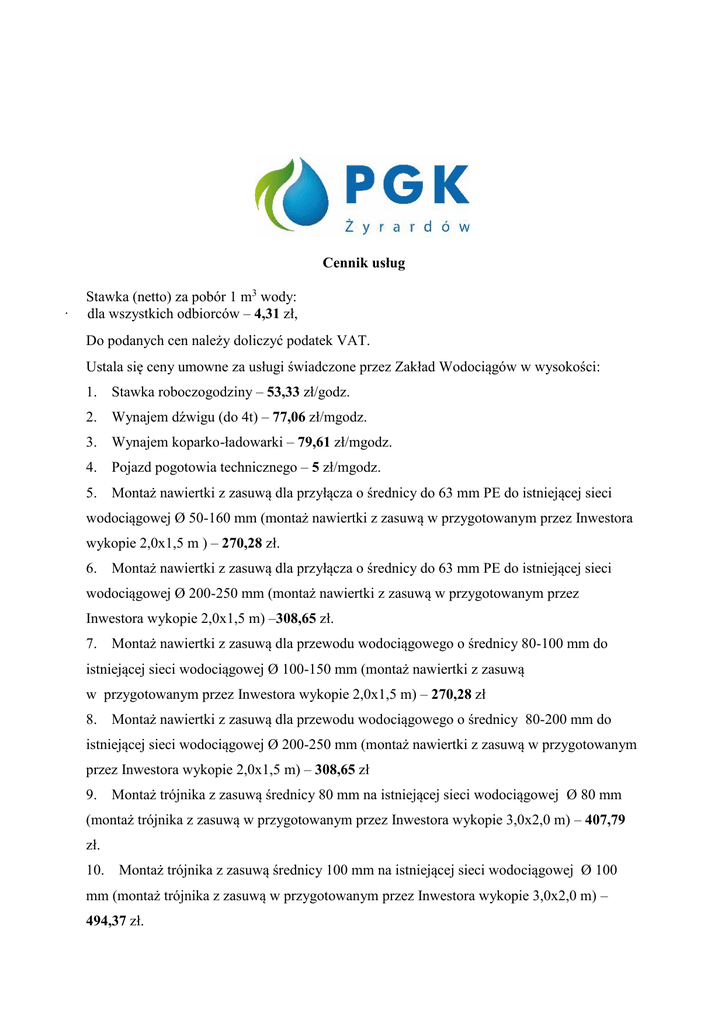 Cennik usług · Stawka (netto) za pobór 1 m3 wody: dla wszystkich odbiorców – 4,31 zł, Do podanych cen należy doliczyć podatek VAT. Ustala się ceny umowne za usługi świadczone przez Zakład Wodociągów w wysokości: 1. Stawka roboczogodziny – 53,33 zł/godz. 2. Wynajem dźwigu (do 4t) – 77,06 zł/mgodz. 3. Wynajem koparko-ładowarki – 79,61 zł/mgodz. 4. Pojazd pogotowia technicznego – 5 zł/mgodz. 5. Montaż nawiertki z zasuwą dla przyłącza o średnicy do 63 mm PE do istniejącej sieci wodociągowej Ø 50-160 mm (montaż nawiertki z zasuwą w przygotowanym przez Inwestora wykopie 2,0x1,5 m ) – 270,28 zł. 6. Montaż nawiertki z zasuwą dla przyłącza o średnicy do 63 mm PE do istniejącej sieci wodociągowej Ø 200-250 mm (montaż nawiertki z zasuwą w przygotowanym przez Inwestora wykopie 2,0x1,5 m) –308,65 zł. 7. Montaż nawiertki z zasuwą dla przewodu wodociągowego o średnicy 80-100 mm do istniejącej sieci wodociągowej Ø 100-150 mm (montaż nawiertki z zasuwą w przygotowanym przez Inwestora wykopie 2,0x1,5 m) – 270,28 zł 8. Montaż nawiertki z zasuwą dla przewodu wodociągowego o średnicy 80-200 mm do istniejącej sieci wodociągowej Ø 200-250 mm (montaż nawiertki z zasuwą w przygotowanym przez Inwestora wykopie 2,0x1,5 m) – 308,65 zł 9. Montaż trójnika z zasuwą średnicy 80 mm na istniejącej sieci wodociągowej Ø 80 mm (montaż trójnika z zasuwą w przygotowanym przez Inwestora wykopie 3,0x2,0 m) – 407,79 zł. 10. Montaż trójnika z zasuwą średnicy 100 mm na istniejącej sieci wodociągowej Ø 100 mm (montaż trójnika z zasuwą w przygotowanym przez Inwestora wykopie 3,0x2,0 m) – 494,37 zł. 11. Montaż trójnika z zasuwą średnicy 150 mm na istniejącej sieci wodociągowej Ø 150 mm (montaż trójnika z zasuwą w przygotowanym przez Inwestora wykopie 3,0x2,0 m) – 711,00 zł. 12. Montaż trójnika z zasuwą średnicy 200 mm na istniejącej sieci wodociągowej Ø 200 mm (montaż trójnika z zasuwą w przygotowanym przez Inwestora wykopie 3,0x2,0 m) – 1215,56 zł. 13. Montaż trójnika z zasuwą średnicy 250 mm na istniejącej sieci wodociągowej Ø 250 mm (montaż trójnika z zasuwą w przygotowanym przez Inwestora wykopie 3,0x2,0 m) 1574,79 zł 14. Montaż nawiertek lub trójników o innych średnicach – cena wg indywidualnej kalkulacji. 15. Montaż węzła wodomierzowego (konsola) Ø 20 mm – 331,45 zł. 16. Montaż węzła wodomierzowego (konsola) Ø 25 mm – 653,33 zł. 17. Montaż węzła wodomierzowego (konsola) Ø 32 mm – 1 233,71 zł. 18. Montaż węzła wodomierzowego (konsola) Ø 40 mm – 1 725,15 zł. 19. Wykonanie przyłącza wodociągowego wg. kosztorysu na zapytanie. Do podanych cen należy doliczyć podatek VAT wg obowiązujących stawek. Ceny wykonania przyłącza wodociągowego obejmują roboty ziemne, montażowe oraz koszty materiałów. Cennik nie obejmuje kosztów rozbiórki i odtwarzania nawierzchni utwardzonych i innych obiektów znajdujących się na trasie przyłącza wodociągowego oraz kosztów obsługi geodezji.