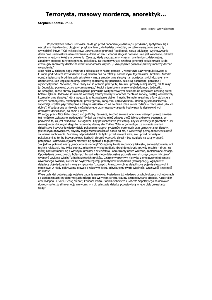 Terrorysta, masowy morderca, anorektyk… Stephen Khamsi, Ph.D. (tøum. Robert TULO Wa kiewicz) W pocz tkach historii ludzko ci, na døugo przed nadaniem jej dziesi ciu przykaza , spotykamy si z naczelnym i bardzo destrukcyjnym przykazaniem. „Nie b dziesz wiedziaø, co tobie wyrz dzono ani co ty wyrz dziøe innym.” Od tysi cleci owo „przykazanie ignorancji” podkopuje nasz edukacj i wychowywanie dzieci oraz uniemo liwia nam odró nianie dobra od zøa. I chocia zøo jest poznane i nie jest wrodzone, odradza si ono w ka dym kolejnym pokoleniu. Zawsze, kiedy zaprzeczamy wøasnym zranieniom z dzieci stwa, zadajemy podobne rany nast pnemu pokoleniu. Ta traumatyzuj ca sztafeta generacji b dzie trwaøa a do czasu, gdy zaczniemy dziaøa na rzecz wiadomo ci krzywd. „Tylko poprzez poznanie prawdy mo emy dozna wyzwolenia.” Alice Miller w dalszym ci gu inspiruje i odciska si w naszej pami ci. Prawda was wyzwoli (publikowana w Europie pod tytuøem Przebudzenie Ewy) zmusza nas do refleksji nad naszymi tajemnicami i brakami. Autorka obna a jeden z najbrudniejszych sekretów – nasz emocjonaln lepot na nadu ycia, jakich doznajemy w dzieci stwie. Bez wzgl du na kraj, warstw spoøeczn czy pokolenie, dzieci s porzucane, poni ane i wykorzystywane. Niewinne, maøe istoty nie s wstanie prze y tej traumy i prawdy o niej inaczej, ni tøumi c j . Jednak e, poniewa „ciaøo zawsze pami ta,” kocioø z tym bólem wrze w nie wiadomo ci jednostki. Na szcz cie, ró ne obrony psychologiczne pozwalaj wiktymizowanym dzieciom na cz ciow ochron przed bólem i l kiem. Jednak e støumienie wczesnej traumy tworzy w ofiarach mentalne zapory, pustk wewn trzn i „emocjonaln lepot ,” która wp dza je w krzywdzenie siebie i innych. Te maøe, niewinne ofiary staj si z czasem samobójcami, psychopatami, przest pcami, zabójcami i prostytutkami. Dokonuj samookalecze , zapeøniaj szpitale psychiatryczne i robi to wszystko, co na co dzie robili im ich rodzice – rzecz jasna „dla ich dobra”. Wpadaj one w niewol nie wiadomego przymusu powtarzania i odtwarzania destrukcyjnych dramatów dzieci stwa, na sobie i innych. W swojej pracy Alice Miller cz sto cytuje Bibli . Zauwa a, e cho zawiera ona wiele wa nych prawd, zawiera te mnóstwo „toksycznej pedagogiki.” Mówi, e musimy mie odwag zje jabøko z drzewa poznania, by podwa y to, co jest szkodliwe i nielogiczne. Czy posøusze stwo jest cnot ? Czy ciekawo jest grzechem? Czy nieznajomo dobrego i zøego to naprawd idealny stan? Alice Miller argumentuje, e otwarcie zranie dzieci stwa i uzyskanie wiedzy dzi ki pokonaniu naszych systemów obronnych oraz „emocjonalnej lepoty, jest naszym obowi zkiem, aby my mogli zacz odró nia dobro od zøa, a wi c wzi peøn odpowiedzialno za wøasne zachowania. Jeste my odpowiedzialni nie tylko przed samymi sob , ale i przed przyszøymi pokoleniami za to, by bezwarunkowo kocha i chroni wszystkie dzieci – bez wzgl du na caø wrogo , pot pienie i ostracyzm z jakimi mo emy si spotka z tego powodu. Jak jednak pokona nasz „emocjonaln lepot ?” Osi gamy to nie za pomoc lekarstw, ani medytowania, ani technik relaksacji, lecz tylko poprzez nieunikniony trud podj cia drogi do odkrycia prawdy o sobie – drogi, na której konfrontujemy si z wøasnymi urazami z dzieci stwa i odmra amy nasze wczesne, zablokowane emocje. Opowiadanie prawdziwych, bolesnych historii wøasnego dzieci stwa pozwala nam skruszy „mury milczenia” i wydoby „wykl t wiedz ” z barbarzy skich mroków. Czerpiemy przy tym nie tylko z empatycznej obecno ci o wieconego wiadka, ale te ze zwykøych regresji, przebøysków wspomnie (retrospekcji), wgl dów w dzieci ce do wiadczenia i mow symptomów fizycznych. Prawdziwy obraz dzieci stwa pojawia si powoli i stopniowo. A kiedy odkrywamy prawd o wøasnym yciu, odzyskujemy swoj witalno , wra liwo i zdolno do miøo ci. Wiele tych idei potwierdzaj ostatnie badania naukowe. Posiadamy ju wiedz o psychobiologicznych obronach i o uszkodzeniach czy deformacjach mózgu pod wpøywem stresu, traumy i zaniedbywania dziecka. Alice Miller ceni Josepha LeDoux, Debr Niehoff, Candace Perta, Daniela Schactera i Roberta Sapolsky’ego za naukowe dowody na to, e silne emocje we wczesnym okresie ycia dziecka pozostawiaj w jego ciele „niezatarte lady.” Jednak e, niezale nie od tych odkry , musimy zmieni nasz sposób traktowania dzieci. Alice Miller wierzy, e odpowiednie regulacje prawne oraz edukacja rodziców zmniejsz rozmiary krzywd i przemocy stosowanej wobec dzieci. Owa „zasada prewencji” zmusi etapami nasz indywidualn mentalno , i caøe spoøecze stwa, do zmian w tym kierunku. Tego rodzaju regulacje prawne istniej ju w Szwecji, Niemczech i RPA. W tej nowej, wa nej ksi ce napotykamy tak e poprzednie, brzemienne w skutki, wgl dy autorki: prawidøowo , e ka dy przest pca do wiadczaø w dzieci stwie poni enia, porzucenia czy wykorzystania; e tylko ludzie bici jako dzieci maj przymus bicia wøasnego potomstwa; e dzieci stwo najokrutniejszych tyranów na wiecie naznaczone jest doznawaniem ekstremalnego okrucie stwa i upokorzenia. Nie mieli oni adnych empatycznych osób, adnego o wieconego wiadka. Hitler, Stalin, Ceausescu i Mao Tse Tung – na politycznej makro-scenie wiata dyktatorzy ci nie wiadomie odtworzyli traumatyczne sytuacje ze swojego dzieci stwa. Bronili si przed zmagazynowanym w sobie bólem najpierw mu zaprzeczaj c, a potem idealizuj c swoich rodziców, by doj do gloryfikowania przemocy i wzi ostateczny rewan na caøych narodach za niegdy do wiadczone okrucie stwa. Na pewnym, bardzo istotnym poziomie, to wøa nie owa „emocjonalna lepota” na wyparty ból dzieci stwa nap dza wiatow machin terroru i wojen. W ksi ce znajdziemy te krótk krytyk unikania tematu dzieci stwa w sze ciu domenach – medycyny, psychoterapii, polityki, systemu karnego, religii i biografii. Pojawia si te kilka analiz nowych przypadków (w tym psychoanalityka Harry’ego Guntripa) oraz wa ne wgl dy zwi zane z karami cielesnymi, zaburzeniami jedzenia i