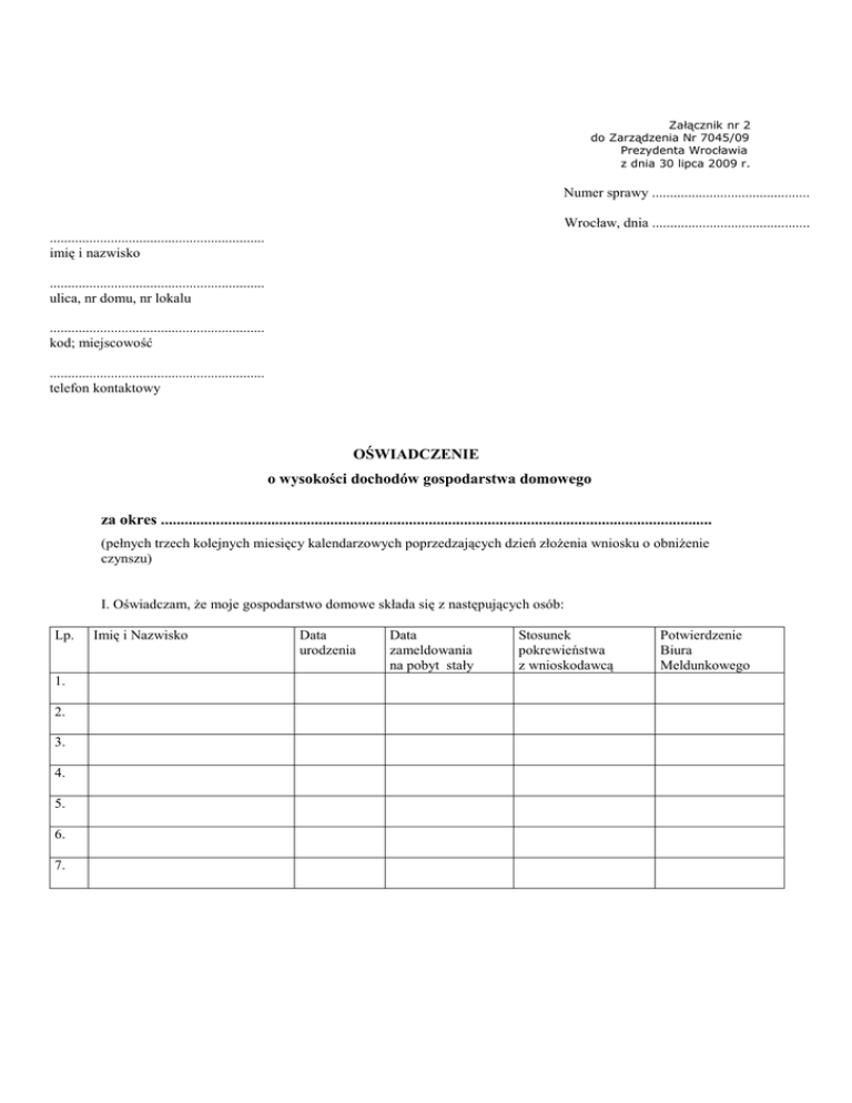 Załącznik nr 2 do Zarządzenia Nr 7045/09 Prezydenta Wrocławia z dnia 30 lipca 2009 r. Numer sprawy ............................................ Wrocław, dnia ............................................ ............................................................ imię i nazwisko ............................................................ ulica, nr domu, nr lokalu ............................................................ kod; miejscowość ............................................................ telefon kontaktowy OŚWIADCZENIE o wysokości dochodów gospodarstwa domowego za okres ............................................................................................................................................ (pełnych trzech kolejnych miesięcy kalendarzowych poprzedzających dzień złoŜenia wniosku o obniŜenie czynszu) I. Oświadczam, Ŝe moje gospodarstwo domowe składa się z następujących osób: Lp. 1. 2. 3. 4. 5. 6. 7. Imię i Nazwisko Data urodzenia Data zameldowania na pobyt stały Stosunek pokrewieństwa z wnioskodawcą Potwierdzenie Biura Meldunkowego II. Oświadczam, Ŝe w podanym wyŜej okresie dochody* moje i wymienionych wyŜej kolejno członków mojego gospodarstwa domowego wyniosły: Lp. Miejsce pracy – nauki Źródła dochodu Wysokość dochodu w zł* **Razem dochody gospodarstwa domowego wynoszą........................................zł III. Średni dochód na 1 członka gospodarstwa domowego wynosi..............................................zł, to jest miesięcznie...............................................zł. IV. Wysokość uzyskanych dochodów potwierdzam załączonymi zaświadczeniami: - ..................................................................................................................................................................................... - ..................................................................................................................................................................................... - ..................................................................................................................................................................................... - ..................................................................................................................................................................................... Składając osobiście niniejsze oświadczenie o wysokości dochodów gospodarstwa domowego oświadczam, Ŝe jest mi wiadomo, Ŝe dokumenty, na których podstawie zadeklarowałem(am) dochody, jestem zobowiązany(a) przechowywać przez okres 3 lat, a uprzedzony(a) o odpowiedzialności karnej z art. 233 § 1 Kodeksu karnego potwierdzam własnoręcznym podpisem prawdziwość danych zamieszczonych w oświadczeniu. .......................................................... (podpis składającego oświadczenie) ....................................... (podpis przyjmującego) * Za dochód uwaŜa się zgodnie z definicją ustawy z dnia 21.06.2001r. o dodatkach mieszkaniowych (Dz. U. z 2001 r. nr 71 poz. 734) wszelkie przychody po odliczeniu kosztów ich uzyskania oraz po odliczeniu składek na ubezpieczenie emerytalne i rentowe oraz na ubezpieczenie chorobowe, określonych w przepisach o systemie ubezpieczeń społecznych, chyba Ŝe zostały juŜ zaliczone do kosztów uzyskania przychodu. Do dochodu nie wlicza się świadczeń pomocy materialnej dla uczniów, dodatków dla sierot zupełnych, jednorazowych zapomóg z tytułu urodzenia się dziecka, dodatku z tytułu urodzenia dziecka, pomocy w zakresie doŜywiania, zasiłków pielęgnacyjnych, zasiłków okresowych z pomocy społecznej, jednorazowych świadczeń pienięŜnych i świadczeń w naturze z pomocy społecznej, dodatku mieszkaniowego oraz zapomogi pienięŜnej, o której mowa w przepisach o zapomodze pienięŜnej dla niektórych emerytów, rencistów i osób pobierających świadczenie przedemerytalne albo zasiłek przedemerytalny w 2007 r. ** Dochód miesięczny gospodarstwa domowego stanowią dochody wnioskodawcy i członków jego rodziny zgłoszonych we wniosku, wykazane ze wszystkich źródeł ich uzyskiwania, odpowiednio udokumentowane przez wnioskodawcę