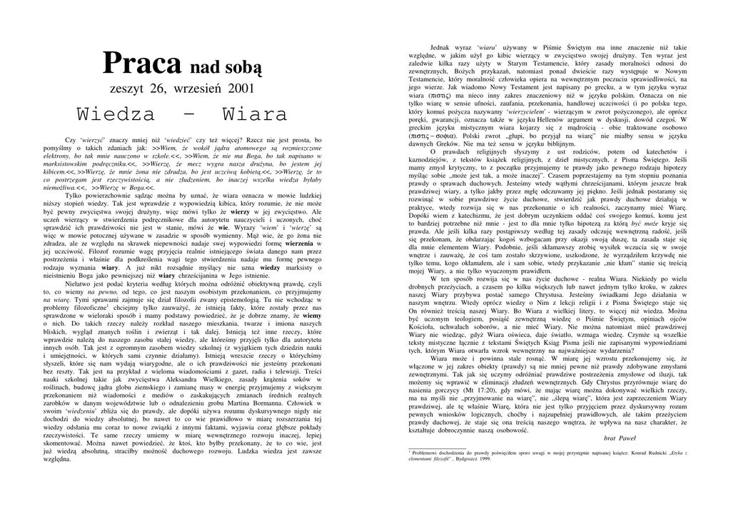 Praca nad sob zeszyt 26, wrzesie 2001 Wiedza - Wiara Czy ‘wierzy ’ znaczy mniej ni ‘wiedzie ’ czy te wi cej? Rzecz nie jest prosta, bo pomy lmy o takich zdaniach jak: >>Wiem, e wokół j dra atomowego s rozmieszczone elektrony, bo tak mnie nauczono w szkole.<<, >>Wiem, e nie ma Boga, bo tak napisano w marksistowskim podr czniku.<<, >>Wierz , e mecz wygra nasza dru yna, bo jestem jej kibicem.<<, >>Wierz , e mnie ona nie zdradza, bo jest uczciw kobiet .<<, >>Wierz , e to co postrzegam jest rzeczywisto ci , a nie złudzeniem, bo inaczej wszelka wiedza byłaby niemo liwa.<<, >>Wierz w Boga.<<. Tylko powierzchownie s dz c mo na by uzna , e wiara oznacza w mowie ludzkiej ni szy stopie wiedzy. Tak jest wprawdzie z wypowiedzi kibica, który rozumie, e nie mo e by pewny zwyci stwa swojej dru yny, wi c mówi tylko e wierzy w jej zwyci stwo. Ale ucze wierz cy w stwierdzenia podr cznikowe dla autorytetu nauczycieli i uczonych, cho sprawdzi ich prawdziwo ci nie jest w stanie, mówi e wie. Wyrazy ‘wiem’ i ‘wierz ’ s wi c w mowie potocznej u ywane w zasadzie w sposób wymienny. M wie, e go ona nie zdradza, ale ze wzgl du na skrawek niepewno ci nadaje swej wypowiedzi form wierzenia w jej uczciwo . Filozof rozumie wag przyj cia realnie istniej cego wiata danego nam przez postrze enia i wła nie dla podkre lenia wagi tego stwierdzenia nadaje mu form pewnego rodzaju wyznania wiary. A ju nikt rozs dnie my l cy nie uzna wiedzy marksisty o nieistnieniu Boga jako pewniejszej ni wiary chrze cijanina w Jego istnienie. Niełatwo jest poda kryteria według których mo na odró ni obiektywn prawd , czyli to, co wiemy na pewno, od tego, co jest naszym osobistym przekonaniem, co przyjmujemy na wiar . Tymi sprawami zajmuje si dział filozofii zwany epistemologi . Tu nie wchodz c w problemy filozoficzne1 chciejmy tylko zauwa y , e istniej fakty, które zostały przez nas sprawdzone w wieloraki sposób i mamy podstawy powiedzie , e je dobrze znamy, e wiemy o nich. Do takich rzeczy nale y rozkład naszego mieszkania, twarze i imiona naszych bliskich, wygl d znanych ro lin i zwierz t i tak dalej. Istniej te inne rzeczy, które wprawdzie nale do naszego zasobu stałej wiedzy, ale które my przyj li tylko dla autorytetu innych osób. Tak jest z ogromnym zasobem wiedzy szkolnej (z wyj tkiem tych dziedzin nauki i umiej tno ci, w których sami czynnie działamy). Istniej wreszcie rzeczy o których my słyszeli, które si nam wydaj wiarygodne, ale o ich prawdziwo ci nie jeste my przekonani bez reszty. Tak jest na przykład z wieloma wiadomo ciami z gazet, radia i telewizji. Tre ci nauki szkolnej takie jak zwyci stwa Aleksandra Wielkiego, zasady kr enia soków w ro linach, budow j dra globu ziemskiego i zamian masy w energi przyjmujemy z wi kszym przekonaniem ni wiadomo ci z mediów o zaskakuj cych zmianach rednich realnych zarobków w danym województwie lub o odnalezieniu grobu Martina Bormanna. Człowiek w swoim ‘wiedzeniu’ zbli a si do prawdy, ale dopóki u ywa rozumu dyskursywnego nigdy nie dochodzi do wiedzy absolutnej, bo nawet to co wie prawidłowo w miar rozszerzania tej wiedzy odsłania mu coraz to nowe zwi zki z innymi faktami, wyjawia coraz gł bsze pokłady rzeczywisto ci. Te same rzeczy umiemy w miar wewn trznego rozwoju inaczej, lepiej skomentowa . Mo na nawet powiedzie , e kto , kto byłby przekonany, e to co wie, jest duchowego rozwoju. Ludzka wiedza jest zawsze ju wiedz absolutn , straciłby mo no wzgl dna. Jednak wyraz ‘wiara’ u ywany w Pi mie wi tym ma inne znaczenie ni takie wzgl dne, w jakim u ył go kibic wierz cy w zwyci stwo swojej dru yny. Ten wyraz jest zaledwie kilka razy u yty w Starym Testamencie, który zasady moralno ci odnosi do zewn trznych, Bo ych przykaza , natomiast ponad dwie cie razy wyst puje w Nowym Testamencie, który moralno człowieka opiera na wewn trznym poczuciu sprawiedliwo ci, na jego wierze. Jak wiadomo Nowy Testament jest napisany po grecku, a w tym j zyku wyraz wiara (πιστις) ma nieco inny zakres znaczeniowy ni w j zyku polskim. Oznacza on nie tylko wiar w sensie ufno ci, zaufania, przekonania, handlowej uczciwo ci (i po polsku tego, który komu po ycza nazywamy ‘wierzycielem’ - wierz cym w zwrot po yczonego), ale oprócz por ki, gwarancji, oznacza tak e w j zyku Hellenów argument w dyskusji, dowód czego . W greckim j zyku mistycznym wiara kojarzy si z m dro ci - obie traktowane osobowo (πιστις − σοφια). Polski zwrot „głupi, bo przyj ł na wiar ” nie miałby sensu w j zyku dawnych Greków. Nie ma te sensu w j zyku biblijnym. O prawdach religijnych słyszymy z ust rodziców, potem od katechetów i kaznodziejów, z tekstów ksi ek religijnych, z dzieł mistycznych, z Pisma wi tego. Je li mamy zmysł krytyczny, to z pocz tku przyjmujemy te prawdy jako pewnego rodzaju hipotezy my l c sobie „mo e jest tak, a mo e inaczej”. Czasem poprzestajemy na tym stopniu poznania prawdy o sprawach duchowych. Jeste my wtedy w tłymi chrze cijanami, którym jeszcze brak prawdziwej wiary, a tylko jakby przez mgł odczuwamy jej pi kno. Je li jednak postaramy si w sobie prawdziwe ycie duchowe, stwierdzi jak prawdy duchowe działaj w rozwin praktyce, wtedy rozwija si w nas przekonanie o ich realno ci, zaczynamy mie Wiar . Dopóki wiem z katechizmu, e jest dobrym uczynkiem odda co swojego komu , komu jest to bardziej potrzebne ni mnie - jest to dla mnie tylko hipotez za któr by mo e kryje si prawda. Ale je li kilka razy post piwszy według tej zasady odczuj wewn trzn rado , je li si przekonam, e obdarzaj c kogo wzbogacam przy okazji swoj dusz , ta zasada staje si dla mnie elementem Wiary. Podobnie, je li skłamawszy zrobi wysiłek wczucia si w swoje wn trze i zauwa , e co tam zostało skrzywione, uszkodzone, e wyrz dziłem krzywd nie tylko temu, kogo okłamałem, ale i sam sobie, wtedy przykazanie „nie kłam” stanie si tre ci mojej Wiary, a nie tylko wyuczonym prawidłem. W ten sposób rozwija si w nas ycie duchowe - realna Wiara. Niekiedy 