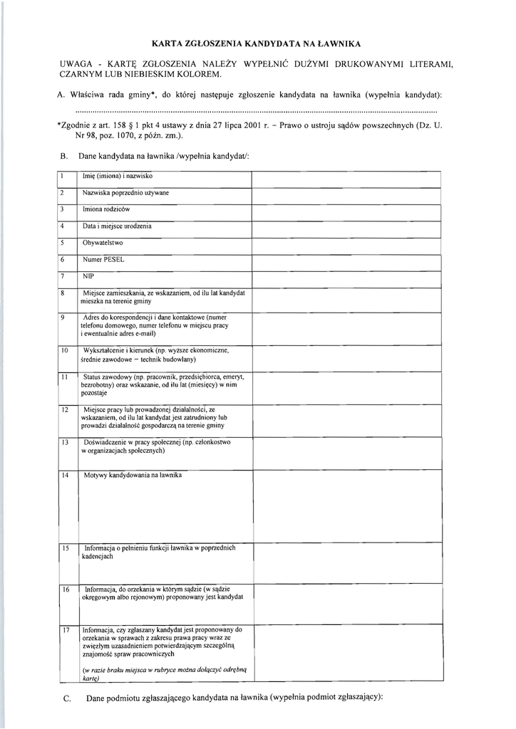 KARTA ZGŁOSZENIA KANDYDATA NA ŁAWNIKA UWAGA - KARTĘ ZGŁOSZENIA NALEŻY WYPEŁNIĆ DUŻYMI DRUKOWANYMI LITERAMI, CZARNYM LUB NIEBIESKIM KOLOREM. A. Właściwa rada gminy*, do której następuje zgłoszenie kandydata na ławnika (wypełnia *Zgodnie z art. 158 § 1 pkt 4 ustawy z dnia 27 lipca 2001 r. - Prawo o ustroju Nr 98, poz. 1070, z późno zm.). B. powszechnych (Dz. U. Dane kandydata na ławnika /wypełnia kandydat!: l Imię 2 Nazwiska poprzednio 3 Imiona rodziców 4 Data i miejsce urodzenia 5 Obywatelstwo 6 Numer PESEL 7 NIP 8 Miejsce zamieszkania, ze wskazaniem , od ilu lat kandydat mieszka na terenie gminy 9 Adres do korespondencji i dane kontaktowe (numer telefonu domowego, numer telefonu w miejscu pracy i ewentualnie adres e-mail) 10 sądów (imiona) i nazwisko używane Wyksztalcenie i kierunek (np . wyższe ekonomiczne, zawodowe - technik budowlany) ś rednie II Status zawodowy (np. pracownik, przedsiębiorca, emeryt, bezrobotny) oraz wskazanie, od ilu lat (miesięcy) w nim pozostaje 12 Miejsce pracy lub prowadzonej dzialalności, ze wskazaniem, od ilu lat kandydat jest zatrudniony lub prowadzi działalnoś ć gospodarczą na terenie gminy I3 Doświadczenie w organizacjach w pracy społecznej (np. czlonkostwo społecznych) 14 Motywy kandydowania na lawnika 15 Informacja o pełn i eniu funkcji kadencjach 16 ławnika w poprzednich Informacja, do orzekania w którym sądzie (w sądzie albo rejonowym) proponowany jest kandydat okręgowym 17 Informacja, czy zglaszany kandydat jest proponowany do orzekania w sprawach z zakresu prawa pracy wraz ze zwięzłym uzasadnieniem potwierdzającym szczególną znajomość spraw pracowniczych (w razie braku miejsca w rubryce możno dołączyć odrębną karlę) C. kandydat): Dane podmiotu zgłaszającego kandydata na ławnika (wypełnia podmiot zgłaszający): I Nazwa podmiotu i oznaczenie siedziby 2 Imię i nazwisko osoby zglaszającej kandydata, uprawnionej do reprezentacji 3 Podpis osoby zgłaszającej kandydata, uprawnionej do reprezentacji 4 Nazwa i numer rejestru lub ewidencji, do których podmiot jest wpisany 5 Dane teleadresowe do korespondencji : adres Ueżeli jest inny niż adres siedziby), telefon kontaktowy i adres e-mail * Prezes sądu wypełnia w części C wyłącznie rubrykę l. Stosownie do art. 7 pkt 5 ustawy z dnia 29 sierpnia 1997 r. o ochronie danych osobowych (Dz . U. z 2002 r. Nr 101, poz. 926, z późno zm .) oświadczam, że wyrażam zgodę na przetwarzanie moich danych osobowych zamieszczonych w niniejszej karcie zgłoszenia w zakresie niezbędnym do przeprowadzenia procedury wyboru ławników przez radę gminy oraz do czynności administracyjnych sądu związanych z organizacją pracy ławników. Wyrażam zgodę własnoręcznym na kandydowanie i potwierdzam podpisem. miejscowość Potwierdzam danych zawartych w karcie zgloszenia czytelny podpis kandydata na ławnika i data wypełnienia prawdziwość (miejscowość prawdziwość danych zawartych w karcie zgłoszenia własnoręcznym podpisem. (czytelny podpis prezesa sądu albo osoby reprezentującej podmiot określony wart. 162 § l ustawy z dnia 27 lipca 200 I r. - Prawo o ustroju sądów powszechnych, uprawnionej do zgloszenia kandydata bądź jednego z pięćdziesięciu obywateli zgłaszających kandydata) i data wypełnienia) POUCZENIE: Zgłoszenie, które wpłynęło do rady gminy po upływie terminu określonego wart. 162 § I ustawy z dnia 27 lipca 200 I r. - Prawo o ustroju sądów powszechnych, lub niespełniające wymagań formalnych, o których mowa wart. 162 § 2 - 5 ustawy z dnia 27 lipca 200] r. - Prawo o ustroju sądów powszechnych i rozporządzeniu Ministra Sprawiedliwości z dnia 9 czerwca 2011 r. w sprawie sposobu postępowania z dokumentami złożonymi radom gmin przy zgłaszaniu kandydatów na ławników oraz wzoru karty zgłoszenia, pozostawia się bez dalszego biegu. Termin do zgłoszenia kandydata nie podlega przywróceniu. Kartę zgłoszenia wraz załącznikami (informacja z Krajowego Rejestru Karnego; oświadczenie kandydata, że nie jest prowadzone przeciwko niemu postępowanie o przestępstwo ścigane z oskarżenia publicznego lub przestępstwo skarbowe; oświadczenie kandydata, że nie jest lub nie był pozbawiony władzy rodzicielskiej, a także że władza rodzicielska nie została mu ograniczona ani zawieszona; zaświadczenie lekarskie o stanie zdrowia, stwierdzające brak przeciwvvskazań do wykonywania funkcji ławnika; dwa zdjęcia; aktualny odpis z Krajowego Rejestru Sądowego albo odpis lub zaświadczenie potwierdzające wpis do innego właściwego rejestru lub ewidencji; lista osób zgłaszających kandydata) podmiot zgłaszający kandydata na ławnika lub kandydat, który nie został wybrany na ławnika, powinien odebrać w nieprzekraczalnym terminie 60 dni od dnia przeprowadzenia wyborów. W przypadku nieodebrania dokumentów w terminie wyżej wskazanym, dokumentacja zostanie zniszczona w terminie 30 dni . Informacje zawarte w karcie zgłoszenia są jednocześnie wykorzystywane przez administrację sądu. W razie zaistnienia jakichkolwiek zmian ławnik powinien je zgłosić do oddziału administracyjnego właściwego sądu.
