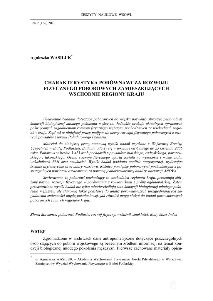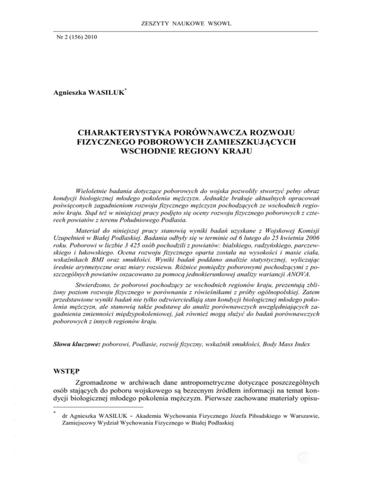 ZESZYTY NAUKOWE WSOWL Nr 2 (156) 2010 ISSN 1731-8157 Agnieszka WASILUK* CHARAKTERYSTYKA PORÓWNAWCZA ROZWOJU FIZYCZNEGO POBOROWYCH ZAMIESZKUJĄCYCH WSCHODNIE REGIONY KRAJU Wieloletnie badania dotyczące poborowych do wojska pozwoliły stworzyć pełny obraz kondycji biologicznej młodego pokolenia mężczyzn. Jednakże brakuje aktualnych opracowań poświęconych zagadnieniom rozwoju fizycznego mężczyzn pochodzących ze wschodnich regionów kraju. Stąd też w niniejszej pracy podjęto się oceny rozwoju fizycznego poborowych z czterech powiatów z terenu Południowego Podlasia. Materiał do niniejszej pracy stanowią wyniki badań uzyskane z Wojskowej Komisji Uzupełnień w Białej Podlaskiej. Badania odbyły się w terminie od 6 lutego do 25 kwietnia 2006 roku. Poborowi w liczbie 3 425 osób pochodzili z powiatów: bialskiego, radzyńskiego, parczewskiego i łukowskiego. Ocena rozwoju fizycznego oparta została na wysokości i masie ciała, wskaźnikach BMI oraz smukłości. Wyniki badań poddano analizie statystycznej, wyliczając średnie arytmetyczne oraz miary rozsiewu. Różnice pomiędzy poborowymi pochodzącymi z poszczególnych powiatów oszacowano za pomocą jednokierunkowej analizy wariancji ANOVA. Stwierdzono, że poborowi pochodzący ze wschodnich regionów kraju, prezentują zbliżony poziom rozwoju fizycznego w porównaniu z rówieśnikami z próby ogólnopolskiej. Zatem przedstawione wyniki badań nie tylko odzwierciedlają stan kondycji biologicznej młodego pokolenia mężczyzn, ale stanowią także podstawę do analiz porównawczych uwzględniających zagadnienia zmienności międzypokoleniowej, jak również mogą służyć do badań porównawczych poborowych z innych regionów kraju. Słowa kluczowe: poborowi, Podlasie, rozwój fizyczny, wskaźnik smukłości, Body Mass Index Zgromadzone w archiwach dane antropometryczne dotyczące poszczególnych osób stających do poboru wojskowego są bezecnym źródłem informacji na temat kondycji biologicznej młodego pokolenia mężczyzn. Pierwsze zachowane materiały opisu- - - WSTĘP - - - * dr Agnieszka WASILUK - Akademia Wychowania Fizycznego Józefa Piłsudskiego w Warszawie, Zamiejscowy Wydział Wychowania Fizycznego w Białej Podlaskiej CHARAKTERYSTYKA PORÓWNAWCZA ROZWOJU FIZYCZNEGO POBOROWYCH… jące poziom rozwoju cech somatycznych żołnierzy pochodzą z Francji (XVII w), Norwegii (od 1741 roku), Anglii i Ameryki Północnej (od 1755 roku) [10]. Szczegółowo poziom rozwoju fizycznego poborowych i rekrutów z armii rosyjskiej zamieszkujących na terenie Królestwa Polskiego opisywali w swoich pracach Czekanowski [6] i Kopczyński [10]. Nie ulega wątpliwości, iż wieloletnie badania dotyczące poborowych do wojska, pozwoliły stworzyć pełny obraz kondycji biologicznej młodego pokolenia mężczyzn. Zgromadzone w ten sposób informacje wykorzystywano między innymi do analizy związków pomiędzy czynnikami środowiskowymi a poziomem rozwoju fizycznego [19,20,21]. Odrębną grupę prac stanowią badania dokumentujące zmiany sekularne cech morfologicznych poborowych [2,3,5]. Analizowano również budowę ciała, sprawność fizyczną oraz stan zdrowia mężczyzn związanych z wojskiem czasowo lub zawodowo [1,7,8,9,13,25,26]. Mimo bogatego piśmiennictwa koncentrującego się na wymienionej problematyce, brakuje opracowań poświęconych zagadnieniom rozwoju fizycznego mężczyzn pochodzących ze wschodnich regionów kraju. Stąd też interesujące wydawało się podjęcie oceny rozwoju fizycznego poborowych zamieszkujących teren Południowego Podlasia. 1. MATERIAŁ I METODY Teren Południowego Podlasia odpowiada zasięgowi dawnego województwa bialskopodlaskiego. Jest to region typowo rolniczy, słabo uprzemysłowiony o małym zanieczyszczeniu środowiska. Na jego obszarze znajduje się zaledwie 6 miast, przy czym największym jest Biała Podlaska licząca niespełna 60 tysięcy mieszkańców. - - - - - Materiał do niniejszej pracy stanowią wyniki badań uzyskane z Wojskowej Komisji Uzupełnień w Białej Podlaskiej. Obejmuje ona swoim zasięgiem powiat bialski, parczewski, radzyński i łukowski (rys. 1). Rys. 1. Rozmieszczenie powiatów w województwie lubelskim Źródło: Opracowanie własne 243 Agnieszka WASILUK Badania odbyły się w terminie od 6 lutego do 25 kwietnia 2006 roku. W tym czasie, przed powiatową komisją lekarską i powiatową komisją poborową właściwą ze względu na stałe miejsce pobytu, stanęło 3 425 mężczyzn urodzonych w roku 1987. Na podstawie danych uzyskanych z bialskiego WKU o dacie urodzenia poborowego oraz jego wysokości i masie ciała oszacowano wiek kalendarzowy oraz wartości wskaźnika masy ciała (BMI) i wskaźnika smukłości (PI): BMI PI masa ciała (kg) wysokość ciała (m) 2 wysokość ciała cm 3 masa ciała kg Wyniki badań poddano analizie statystycznej, wyliczając średnie arytmetyczne oraz miary rozsiewu. Różnice pomiędzy poborowymi pochodzącymi z poszczególnych powiatów oszacowano za pomocą jednokierunkowej analizy wariancji ANOVA, zaś istotność różnic międzygrupowych oceniono testem NIR [17]. Zróżnicowanie w poziomie rozwoju fizycznego badanych mężczyzn przedstawiono również graficznie. W tym celu rezultaty poborowych zamieszkujących powiaty bialski, parczewski, radzyński i łukowski unormowano na średnią arytmetyczną i odchylenie standardowe ogółu badanych. 2. ANALIZA WYNIKÓW W tabeli 1 przedstawiono ogólną charakterystykę badanych mężczyzn. Średni wiek poborowych zamieszkujących wschodnie regiony kraju wynosił 18,68 lat. Natomiast przeciętna wysokość ciała uzyskała wartość 177,63 cm, zaś masa ciała 69,76 kg. Stosunek pomiędzy wymienionymi cechami somatycznymi odzwierciedlają – wskaźnik BMI, który w badanej grupie wyniósł 22,09 kg/m2 oraz wskaźnik smukłości, którego wartość uzyskała poziom 43,35. Poddając ocenie wartości średnie wieku kalendarzowego poborowych z poszczególnych powiatów