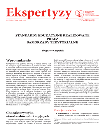 Ekspertyzy Nr 3(3) 2015 | 21 grudnia 2015 www.nist.gov.pl STANDARDY EDUKACYJNE REALIZOWANE PRZEZ SAMORZĄDY TERYTORIALNE Zbigniew Czepelak Wprowadzenie Funkcjonowanie systemu oświaty w Polsce oparte jest na przejęciu odpowiedzialności za funkcjonowanie szkół i placówek oświatowo-wychowawczych przez jednostki samorządu terytorialnego a państwo zobowiązuje się do zapewnienia finansowania tych zadań. System taki wymaga wzajemnej współpracy i zaufania, dlatego powinien wynikać z jasnych i uczciwych założeń. Państwo, chcąc wspierać rozwój i samodzielność szkoły samorządowej, powinno wprowadzać regulacje prawne, które zapewnią zobiektywizowane kryteria finansowania zadań oświatowych realizowanych przez samorządy. Obecnie finansowanie oświaty opiera się na otrzymywanej przez samorządy subwencji oświatowej. Zdecydowana większość gmin i powiatów dokłada do tej subwencji znaczne środki co świadczy o tym, iż naliczona kwota jest zbyt niska a algorytm, stanowiący podstawę wyliczenia środków przeznaczanych przez państwo na cele oświatowe, nie zapewnia obiektywnego, jasnego i przejrzystego sposobu wyliczania potrzebnych na ten cel środków. Regulacje dotyczące finansowania zadań oświatowych winny opierać się na standardach edukacyjnych a państwo powinno dokładnie określić za co i ile płaci. Charakterystyka standardów edukacyjnych Zarządzanie usługami oświatowymi jest jednym z najważniejszych zadań, którymi zajmują się jednostki samorządu terytorialnego. Wynika to zarówno z wielkości wydatków budżetowych jak i społecznej wagi jaką przykładamy do kwestii kształcenia. Przekazanie przez państwo części swoich uprawnień do samorządów dało doskonałe efekty materialne, związane z lepszym zarządzaniem, większą mobilnością i kreatywnością oraz gospodarnością samorządów. Ogromne nakłady na poprawę bazy dydaktycznej zaspokoiły podstawowe potrzeby środowisk lokalnych w tym zakresie, lecz obecnie przechodzimy do następnego etapu rozwoju szkół i placówek, etapu związanego z oczekiwaniami klientów usług oświatowych odnośnie podnoszenia jakości tych usług. Powiązaniem powyższych działań powinny się stać standardy jakości kształcenia w powiązaniu ze standardami finansowania oświaty. Słowo standard oznacza wzorzec, normę. Według normy ISO standard to „…udokumentowane uzgodnienie zawierające techniczne specyfikacje lub inne precyzyjne kryteria, które powinny być używane konsekwentnie jako reguły, wskazówki lub definicje charakterystyk – cech charakterystycznych dla zapewnienia, że materiały, produkty, procesy i usługi są dopasowane do celów”1. W edukacji pojęcie standardów dotyczyło przede wszystkim standardów jakości i jako pierwsze zostało określone jako: kryteria oceny efektywności szkoły, charakteryzujące postulowany stan rzeczy, według którego będziemy określać stopień realizacji przez szkołę zadań edukacyjnych, bądź jej wartości z punktu widzenia jej społecznej misji2. Funkcje standardów • Normotwórcza – formalnie i organizacyjnie uwarunkowane, modelowe porządkowanie relacji pomiędzy E. Kędracka-Fieldman, Jakość w edukacji-teoria i praktyka, KOWEZ, Warszawa 2002 r. 2 A. Bogaj, Efektywność kształcenia w: Encyklopedia pedagogiczna, red. W. Pomyłko, Fundacja Innowacja, Warszawa 1993 r. 1 EKSPERTYZY Nr 3(3) 21 grudnia 2015 techniczno-organizacyjnymi i jakościowymi kryteriami świadczenia usług oświatowych a potrzebami w tym zakresie; • Stymulująca - rozumiana jako zespół czynników mających wpływ na kształt i zasady funkcjonowania rynku usług oświatowych; • Ekonomiczna – określająca, poprzez kryteria kosztów, racjonalność finansową świadczonych usług w tym również porównywalność kosztów realizacji zadań oświatowych; • Społeczna – relacja między sposobem funkcjonowania infrastruktury usług oświatowych a poziomem zaspokojenia potrzeb w tym zakresie. Zasady którym powinny odpowiadać standardy usług • Adekwatności – to znaczy względnej zgodności między potrzebami określonych grup klientów a oferowanym zakresem i jakością usług; • Elastyczności – to znaczy stosowania metod, technik i sposobów zaspokajania potrzeb w zależności od zaistniałej sytuacji, w granicach gwarantujących zachowanie pierwotnego znaczenia i celu realizowanego zadania; • Ramowości – to znaczy możliwości poruszania się w procesie zaspokajania potrzeb w odpowiednim, o ustalonej rozpiętości, przedziale norm i normatywów, pozwalających, dzięki możliwości wyboru kryteriów, działać skutecznie na rzecz konkretnego klienta lub na rzecz grupy klientów; • Spójności – to znaczy korelacji rozwiązań przyjętych i stosowanych na różnych poziomach zarządzania sferą społeczną.3 Rodzaje standardów oświatowych Oświata obejmuje różnorodne grupy zadań, których zdefiniowanie jest uzależnione od przyjętego kryterium. W ramach próby definiowania standardów oświatowych w oparciu o ich zakres i obszar oddziaływania, można sprecyzować podział na kilka rodzajów standardów mających ponadto charakter ogólnopolski lub lokalny. Formułowanie standardów musi uwzględniać kryteria, które powinny: • zawierać opis oczekiwanego i pożądanego stanu, służącego rozwojowi określonego obiektu edukacyjnego, • stanowić spójną całość, • być zgodne z prawem, • być akceptowane społecznie, • charakteryzować się racjonalnością i uniwersalnością. Z formułowaniem standardów wiąże się określanie wskaźników które są miernikami spełniania standardów. W literaturze możemy spotkać się z różnymi podziałami standardów edukacyjnych. Wg Toruńskiego4 podział standardów J. Boczoń, Standaryzacja usług społecznych, SPLOT, 2004 r. J. Toruński, Standardy jakości procesu kształcenia, Zeszyty naukowe Akademii Podlaskiej w Siedlcach Seria: Administracja i Zarzą