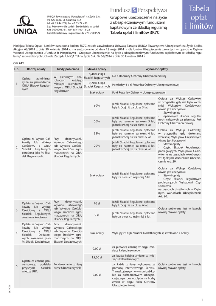 Fundusz & Perspektywa UNIQA Towarzystwo Ubezpieczeñ na ¯ycie S.A. 90-520 £ódŸ, ul. Gdañska 132 tel. 42 63 44 700, fax 42 63 77 430 S¹d Rejonowy dla £odzi - Œródmieœcia w £odzi KRS 0000005751, NIP 554-100-15-22 Kapita³ zak³adowy i wp³acony: 42 774 700 PLN Grupowe ubezpieczenie na życie z ubezpieczeniowym funduszem kapitałowym ze składką regularną Tabela opłat i limitów 3K7C Tabela opłat i limitów Niniejsza Tabela Opłat i Limitów oznaczona kodem 3K7C została zatwierdzona Uchwałą Zarządu UNIQA Towarzystwo Ubezpieczeń na Życie Spółka Akcyjna 66/2014 z dnia 30 kwietnia 2014 r. ma zastosowanie od dnia 12 maja 2014 r dla Umów Ubezpieczenia zawartych w oparciu o Ogólne Warunki Ubezpieczenia „Fundusz & Perspektywa ‑ Grupowe ubezpieczenie na życie z ubezpieczeniowym funduszem kapitałowym ze składką regu‑ larną” zatwierdzonych Uchwałą Zarządu UNIQA TU na Życie S.A. Nr 66/2014 z dnia 30 kwietnia 2014 r. OPŁATY L.p. 1 2 3 4 3K7-C01 5 Rodzaj opłaty Opłata administra‑ cyjna za prowadzenie ORJU Składek Regular‑ nych Opłata za Wykup Cał‑ kowity lub Wykup Częściowy z ORJU Składek Regularnych określona jako % Skła‑ dek Regularnych. Kiedy pobierana Wysokość opłaty 0,40% ORJU W pierwszym dniu Składek Regularnych Do 4 Rocznicy Ochrony Ubezpieczeniowej roboczym każdego 0,20% ORJU miesiąca kalendarzo‑ Pomiędzy 4 a 6 Rocznicą Ochrony Ubezpieczeniowej wego z ORJU Składek Składek Regularnych Regularnych Brak opłaty Po 6 Rocznicy Ochrony Ubezpieczeniowej Przy dokonywaniu Wykupu Całkowitego lub Wykupu Częścio‑ wego środków zgro‑ madzonych na ORJU Składek Regularnych. Opłata za Wykup Cał‑ kowity lub Wykup Częściowy z ORJU Składek Regularnych określona kwotowo Przy dokonywaniu Wykupu Całkowitego lub Wykupu Częścio‑ wego środków zgro‑ madzonych na ORJU Składek Regularnych. Opłata za Wykup Cał‑ kowity lub Wykup Częściowy z ORJU Składek Dodatko‑ wych określona jako % Składki Dodatkowej Przy dokonywaniu Wykupu Całkowitego lub Wykupu Częścio‑ wego środków zgro‑ madzonych na ORJU Składek Dodatkowych. Opłata za zmianę pro‑ centowego podziału przyszłych Składek między UFK. Stawka opłaty 60% Jeżeli Składki Regularne opłacane były krócej niż za okres 3 lat 50% Jeżeli Składki Regularne opłacane były co najmniej za okres 3 lat, jednak krócej niż za okres 4 lat 35% Jeżeli Składki Regularne opłacane były co najmniej za okres 4 lat, jednak krócej niż za okres 5 lat 20% Jeżeli Składki Regularne opłacane były co najmniej za okres 5 lat, jednak krócej niż za okres 6 lat Brak opłaty Jeżeli Składki Regularne opłacane były za okres co najmniej 6 lat 70 zł Jeżeli Składki Regularne opłacane były krócej niż za okres 6 lat 0 zł Jeżeli Składki Regularne opłacane były za okres co najmniej 6 lat Brak opłaty Opłata za Wykup Całkowity, w przypadku gdy dokonano wcześniej Wykupów Częściowych równa jest iloczynowi: · Stawki opłaty · Części Składek Regularnych podlegających Wykupowi Całko‑ witemu na zasadach określonych w Ogólnych Warunkach Ubezpie‑ czenia Art. 20. Opłata za Wykup Częściowy równa jest iloczynowi: · Stawki opłaty · Części Składek Regularnych podlegających Wykupowi Czę‑ ściowemu na zasadach określonych w Ogól‑ nych Warunkach Ubezpieczenia Art. 20. Opłata pobierana jest w kwocie równej Stawce opłaty. Wykupy z ORJU Składek Dodatkowych są zwolnione z opłaty. 0,00 zł za pierwszą zmianę w ciągu mie‑ siąca kalendarzowego 15,00 zł za każdą kolejną zmianę w mie‑ siącu kalendarzowym 0,00 zł za każdą zmianę wykonaną za pomocą Internetowego Serwisu Transakcyjnego www.uniqa24.pl lub za pośrednictwem Ubezpie‑ czającego, bez względu na liczbę zmian w ciągu Roku Ochrony Ubezpieczeniowej Po dokonaniu zmiany przez Ubezpieczyciela Opłata za Wykup Całkowity, w przypadku gdy nie było wcze‑ śniej Wykupów Częściowych równa jest iloczynowi: · Stawki opłaty · opłaconych Składek Regular‑ nych należnych za pierwszy Rok Ochrony Ubezpieczeniowej Opłata pobierana jest w kwocie równej Stawce opłaty. 1 L.p. Rodzaj opłaty Kiedy pobierana Stawka opłaty 0,00 zł 15,00 zł Opłata za przeniesie‑ nie Jednostek Uczest‑ nictwa między UFK 6 Po dokonaniu zmiany przez Ubezpieczyciela 0,00 zł Opłata zgonu nego. 7 za ryzyku Ubezpieczo‑ 8 Opłata za zarządza‑ nie pobierana przez UNIQA TU na Życie S.A. wyrażona w licz‑ bie Jednostek Uczest‑ nictwa. 9 Opłata za zarządza‑ nie uwzględniona w wycenie aktywów fun‑ duszu. 10 Opłata od wpłaconej Składki Regularnej. 11 Opłata od wpłaconej Składki Dodatkowej. Pobierana w pierw‑ szym dniu każdego Miesiąca Ochrony Ubezpieczeniowej poprzez umorzenie odpowiedniej liczby Jednostek Uczestnic‑ twa z ORJU Składek Regularnych. Naliczana codziennie i pobierana w pierw‑ szym dniu roboczym każdego miesiąca kalendarzowego z zastrzeżeniem Art. 20 OWU W przypadku UFK określonych w Szcze‑ gólnym Wykazie UFK jako „Portfel”. Po wpłaceniu Składki Regularnej i przed jej alokacją. Po wpłaceniu Składki Dodatkowej i przed jej alokacją. Wysokość opłaty za pierwsze przeniesienie doko‑ nane w ciągu miesiąca kalenda‑ rzowego za każdą kolejną zmianę w mie‑ siącu kalendarzowym za każdą zmianę wykonaną za pomocą Internetowego Serwisu Transakcyjnego www.uniqa24.pl lub za pośrednictwem Ubezpie‑ czającego, bez względu na liczbę zmian w ciągu Roku Ochrony Ubezpieczeniowej Wiek Ubezpieczonego Stawka opłaty Do 30 lat 0,24% 31 – 40 lat 0,48% 41 – 50 lat 1,08% 51 – 60 lat 2,40% 61 – 70 lat 4,68% 71 – 80 lat 10,20% 81 – 90 lat 22,56% Od 91 lat 43,92% Opłata pobierana jest w kwocie równej Stawce opłaty. Kwota opłaty równa jest iloczy‑ nowi 1/12 Stawki opłaty i różnicy między kwotą Świadczenia Ubez‑ pieczeniowego należnego w przy‑ padku śmierci i wartością ORJU. 1,80% Opłata naliczana
