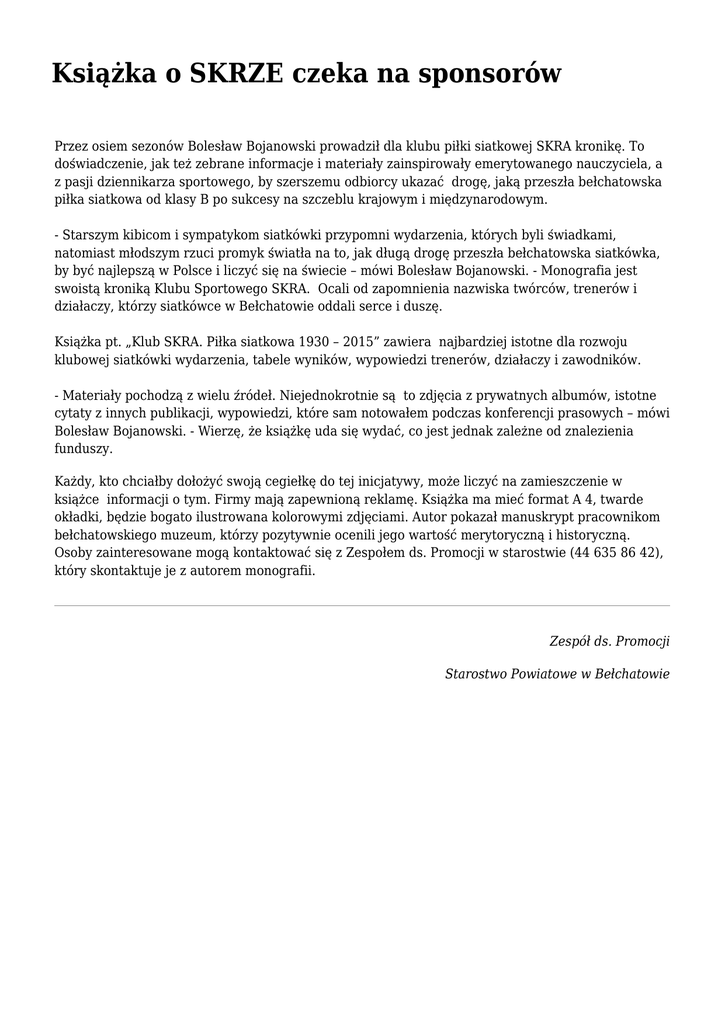Książka o SKRZE czeka na sponsorów Przez osiem sezonów Bolesław Bojanowski prowadził dla klubu piłki siatkowej SKRA kronikę. To doświadczenie, jak też zebrane informacje i materiały zainspirowały emerytowanego nauczyciela, a z pasji dziennikarza sportowego, by szerszemu odbiorcy ukazać drogę, jaką przeszła bełchatowska piłka siatkowa od klasy B po sukcesy na szczeblu krajowym i międzynarodowym. - Starszym kibicom i sympatykom siatkówki przypomni wydarzenia, których byli świadkami, natomiast młodszym rzuci promyk światła na to, jak długą drogę przeszła bełchatowska siatkówka, by być najlepszą w Polsce i liczyć się na świecie – mówi Bolesław Bojanowski. - Monografia jest swoistą kroniką Klubu Sportowego SKRA. Ocali od zapomnienia nazwiska twórców, trenerów i działaczy, którzy siatkówce w Bełchatowie oddali serce i duszę. Książka pt. „Klub SKRA. Piłka siatkowa 1930 – 2015” zawiera najbardziej istotne dla rozwoju klubowej siatkówki wydarzenia, tabele wyników, wypowiedzi trenerów, działaczy i zawodników. - Materiały pochodzą z wielu źródeł. Niejednokrotnie są to zdjęcia z prywatnych albumów, istotne cytaty z innych publikacji, wypowiedzi, które sam notowałem podczas konferencji prasowych – mówi Bolesław Bojanowski. - Wierzę, że książkę uda się wydać, co jest jednak zależne od znalezienia funduszy. Każdy, kto chciałby dołożyć swoją cegiełkę do tej inicjatywy, może liczyć na zamieszczenie w książce informacji o tym. Firmy mają zapewnioną reklamę. Książka ma mieć format A 4, twarde okładki, będzie bogato ilustrowana kolorowymi zdjęciami. Autor pokazał manuskrypt pracownikom bełchatowskiego muzeum, którzy pozytywnie ocenili jego wartość merytoryczną i historyczną. Osoby zainteresowane mogą kontaktować się z Zespołem ds. Promocji w starostwie (44 635 86 42), który skontaktuje je z autorem monografii. Zespół ds. Promocji Starostwo Powiatowe w Bełchatowie