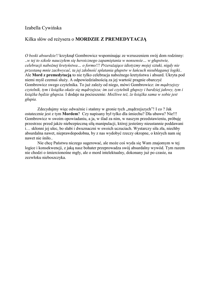 Izabella Cywińska Kilka słów od reżysera o MORDZIE Z PREMEDYTACJĄ O boski absurdzie!! krzyknął Gombrowicz wspominając ze wzruszeniem swój dom rodzinny: ..w tej to szkole nauczyłem się heroicznego zapamiętania w nonsensie… w głupstwie, celebracji nabożnej kretyństwa… o formo!!! Przerażające idiotyzmy mojej sztuki, nigdy nie przestaną mnie zachwycać, ta jej zdolność splatania głupstw w łańcuch nieubłaganej logiki.. Ale Mord z premedytacją to nie tylko celebracja nabożnego kretyństwa i absurd. Ukryta pod niemi myśl czemuś służy. A odpowiedzialnością za jej wartość pragnie obarczyć Gombrowicz swego czytelnika. To już zależy od niego, mówi Gombrowicz: im mądrzejszy czytelnik, tym i książka okaże się mądrzejsza; im zaś czytelnik głupszy i bardziej jałowy, tym i książka będzie głupsza. I dodaje na pocieszenie: Możliwe też, że książka sama w sobie jest głupia. Zdecydujmy więc odważnie i stańmy w gronie tych „mądrzejszych”! I co ? Jak ostatecznie jest z tym Mordem? Czy napisany był tylko dla śmiechu? Dla ubawu? Nie!!! Gombrowicz w swoim opowiadaniu, a ja, w ślad za nim, w naszym przedstawieniu, próbuję przestrzec przed jakże niebezpieczną siłą manipulacji, której jesteśmy nieustannie poddawani i… skłonni jej ulec, bo słabi i dwuznaczni w swoich uczuciach. Wystarczy siła zła, niechby absurdalna nawet, nieprawdopodobna, by z nas wydobyć rzeczy okropne, o których nam się nawet nie śniło.. Nie chcę Państwu niczego sugerować, ale może coś wyda się Wam znajomym w tej logice i konsekwencji, z jaką nasz bohater przeprowadza swój absurdalny wywód. Tym razem nie chodzi o śmiercionośne mgły, ale o mord intelektualny, dokonany już po czasie, na zezwłoku nieboszczyka.