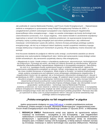 Jak podkreśla dr Joanna Maćkowiak-Pandera, szef Forum Analiz Energetycznych: – Najważniejsze zadania w energetyce to opracowanie nowej Polityki Energetycznej Państwa do 2050 r. z uwzględnieniem polskich zobowiązań europejskich oraz międzynarodowych megatrendów, dywersyfikacja miksu energetycznego – mając na uwadze zmieniające się koszty technologii oraz uwarunkowania surowcowe, m.in. kryzys węglowy. Inne ważne kwestie to zacieśnienie współpracy regionalnej w ramach Unii Europejskiej. Jesteśmy przekonani, że wypracowanie kompromisu pomiędzy unijną a polską wizją energetyki jest warunkiem podstawowym, aby odblokować inwestycje i zminimalizować ryzyka dla sektora. Zarówno Europa potrzebuje polskiego systemu energetycznego, ale też my w kolejnych latach będziemy musieli uzupełniać niedobory kupując energię elektryczną w krytycznych momentach za granicą. W tej współpracy można doszukać się synergii. Inne kluczowe działania do podjęcia to reforma rynku energii, uruchomienie zasobów po stronie popytowej oraz wykorzystanie inteligentnych sieci. Istotne jest opracowanie nowej strategii wobec źródeł odnawialnych, aby sensownie uzupełniały obecny miks energetyczny. – Megatrendy to duże i trwałe zmiany o charakterze społecznym, ekonomicznym, technologicznym lub politycznym. Formułują̨ się̨ wolno, ale kiedy już̇ nabiorą dynamiki są nieodwracalne. W gronie ekspertów zidentyfikowaliśmy najważniejsze megatrendy w europejskiej energetyce. Zaliczyliśmy do nich m.in. spadające koszty wytwarzania energii w źródłach odnawialnych, dążenie do ograniczania oddziaływania energetyki na zdrowie i klimat, zmieniającą się rolę węgla i pojawiające się nowe modele biznesowe w energetyce. Wiele krajów w Europie i na świecie przebudowuje swoje systemy energetyczne pod wpływem coraz silniejszego oddziaływania megatrendów. Z megatrendami można się nie zgadzać, ale w formułowaniu dokumentów strategicznych i decyzji z perspektywą do 2050 r. trzeba je wziąć pod uwagę. W ostatnich latach można odnieść wrażenie, że decydenci przyjęli w warstwie regulacyjnej i technicznej izolację, to tak, jakby monopol telefonii stacjonarnej próbował powstrzymać rozwój telefonii komórkowej. Zmiana paradygmatu energetycznego jest nieunikniona, pytanie jaką krajową strategię przyjąć, aby skorzystała na tym gospodarka i społeczeństwo – komentuje Joanna Maćkowiak-Pandera. Jesteśmy przekonani, że nowe otwarcie w sektorze energetycznym jest potrzebne, w europejskiej polityce energetyczno–klimatycznej znajduje się wiele synergii z polską racją stanu, a modernizacja sektora energetycznego może stać się kołem zamachowym polskiej gospodarki. Pierwsze dwa lata po wyborach to dobry czas na przeprowadzenie reform i decyzje na temat wieloletniej wizji polskiego sektora energetycznego. „Polska energetyka na fali megatrendów” w pigułce (pełne opracowanie dostępne na www.FAE.org.pl, a zostało przedstawione podczas Konferencji „Polska energia w Europie. Wyzwania Modernizacyjne” zorganizowanej przez Forum Analiz Energetyczneych oraz Konfederację Lewiatan 27 stycznia 2016 r. w Warszawie) 1. REDUKCJA EMISJI: Redukowanie emisji oraz dążenie do ograniczenia wpływu inwestycji na środowisko - szczególnie w Unii Europejskiej – jest megatrendem realizowanym z konsekwencją od ponad 20 lat. Ma na celu przeciwdziałanie zmianom klimatycznym i ograniczenie wpływu innych szkodliwych emisji na środowisko. Związany jest z modelem rozwoju Unii Europejskiej, w której ważnym motorem wzrostu są innowacje, inwestycje w zielone technologie oraz poprawa efektywności. Redukcja 1 emisji pochodzących z energetyki objęta prawodawstwem UE dotyczy nie tylko ograniczania emisji gazów cieplarnianych (w tym CO2), ale także ograniczania niskiej emisji i wszelkich zanieczyszczeń powietrza. Konsekwencje i perspektywy: Presja na redukcję emisji gazów cieplarnianych oraz innych zanieczyszczeń/substancji w Europie się utrzyma. Czynniki społeczne, środowiskowe oraz polityczne będą wzmacniały ten trend również poza Europą. Konsekwencją trendu jest dążenie do obniżenia emisyjności energetyki, szczególnie redukcji ilości spalanych paliw kopalnych, wytwarzanie energii z odnawialnych źródłach energii i dążenie do zmniejszenia zapotrzebowania na energię. Walka z tzw. niską emisją w polskich miastach będzie częścią dyskusji o redukcji emisji z energetyki. 2. ROZWÓJ TECHNOLOGII ODNAWIALNYCH ŹRÓDEŁ ENERGII (OZE) I MOŻLIWOŚCI TECHNICZNYCH WYTWARZANIA ENERGII: Optymalizacja technologii oraz spadek kosztów wytworzenia energii w źródłach odnawialnych (OZE15), skutkuje zwiększeniem ich dostępności zarówno dla prosumentów, jak i inwestorów instytucjonalnych, co przełoży się na zwiększenie udziału energetyki odnawialnej w miksie energetycznym. Konsekwencje i perspektywy: Optymalizacja technologii OZE, spadek kosztów oraz działania związane z poprawą integracji w sieci będą prowadzić do zwiększania udziału źródeł odnawialnych w wytwarzaniu energii. Rozwój technologii wpłynie na zwiększenie opłacalności inwestycji zarówno w duże instalacje OZE jak i w lokalne - miejskie, osiedlowe czy przydomowe mikroźródła. W przyszłości przełoży się to na wzrost liczby prosumentów oraz rozwój nowych modeli biznesowych, np. w zakresie lokalnej dystrybucji energii elektrycznej. 3. WZROST ROLI DECYZYJNEJ I ŚWIADOMOŚCI SPOŁECZEŃSTWA: Wzrost świadomości społecznej w zakresie środowiska, oddziaływania inwestycji oraz nowych technologii wytwarzania energii. Obejmuje on w szczególności rosnącą świadomość i partycypację społeczną, sprzeciw wobec nowych inwestycji infrastrukturalnych (tzw. efekt NIMBY) oraz dążenie do autonomii w zaspokajaniu potrzeb energetycznych dzięki rozwojowi źródeł prosumenckich. Konsekwencje i perspektywy: Społeczeństwo ma wpływ na podejmowanie dec