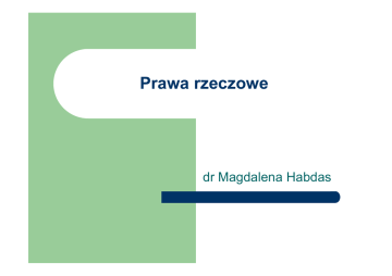 Prawa rzeczowe dr Magdalena Habdas Pojęcie rzeczy art. 45 k.c. – wyłącznie przedmioty materialne na tyle wyodrębnione z przyrody, iż mogą stanowić samodzielny przedmiot obrotu Brak materialności: dobra niematerialne, prawa Brak wyodrębnienia: złoża minerałów, res omnium communes, zwierzęta dzikie żyjące na wolności Rzeczy oznaczone co do tożsamości i co do gatunku Rzeczy ruchome i nieruchomości Brak uznania rzeczy zbiorowych Część składowa i przynależność rzeczy Część składowa – art.47 połączenie fizyczne, na stałe, a nie dla przemijającego użytku Art. 50 k.c. (!) prawa związane z własnością nieruchomości Cz.sk. Nie mogą być przedmiotem własności i innych praw rzeczowych Przynależność: zawsze rzecz ruchoma, będąca własnością właściciela rzeczy głównej; związek funkcjonalny, nie musi dzielić losu prawnego rzeczy głównej (art. 51 k.c.) Prawa rzeczowe 1) 2) 3) Podmiotowe prawa majątkowe o charakterze bezwzględnym (skutecznym erga omnes), które dotyczą rzeczy, Zamknięta lista praw rzeczowych (numerus clausus) Własność Użytkowanie wieczyste Ograniczone prawa rzeczowe: użytkowanie, służebności, spółdzielcze własnościowe prawo do lokalu, zastaw (w tym rejestrowy), hipoteka własność Treść – art. 140 k.c. granice treści: Ustawy Zasady współżycia społecznego Społeczno gospodarcze przeznaczenie własności Triada uprawnień Ius utendi et fruendi et ius abutendi Ius possidendi Ius disponendi Granice przestrzenne nieruchomości – art. 143 k.c. Prawo sąsiedzkie – immisje (art. 144 k.c.) zachowania na własnej nieruchomości, które oddziaływają na nieruchomości sąsiednie Immisje bezpośrednie (zakazane) Immisje pośrednie: materialne i niematerialne Dozwolone, jeżeli nie przekraczają przeciętnej miary, wynikającej ze społ-gosp przeznaczenia nieruchomości i stosunków miejscowych posiadanie Stan faktyczny chroniony przez prawo Corpus i animus Posiadanie samoistne i zależne Posiadanie służebności Ochrona posesoryjna Obrona konieczna Dozwolona samopomoc Ochrona sądowa Roszczenie o wstrzymanie budowy posiadanie Domniemania: Domniemanie posiadania samoistnego Domniemanie ciągłości posiadania Domniemanie dobrej wiary Domniemanie zgodności posiadania ze stanem prawnym Przeniesienie posiadania Wydanie rzeczy (dokumentów) – art 348 k.c. Constitutum possesorium –art. 349 k.c. Traditio brevi manu – art. 351 k.c. Art. 350 k.c. Możliwość dziedziczenia posiadania Nabycie i utrata własności Przeniesienie własności (art. 155 i nast. k.c) Umowa podwójnego skutku (zobowiązująco – rozporządzajaca), konsensualna w odniesieniu do rzeczy oznaczonych co do tożsamości, realna w odniesieniu do rzeczy oznaczonych co do gatunku lub rzeczy przyszłych Nieruchomości: akt notarialny, brak warunku lub terminu przy rozporządzeniu! (art. 157 i 158 k.c.) N i U wł. - Zasiedzenie Zasiedzenie własności nieruchomości (art. 172 k.c.) Posiadanie samoistne Upływ czasu Zasiedzenie własności ruchomości (art. 174 k.c.) Posiadanie samoistne, Upływ czasu Dobra wiara N i U wł Zrzeczenie się własności nieruchomości (art. 179 k.c.) uchylony; Umowa o przekazanie nieruchomości–art. 9021 k.c. Przez umowę przekazania nieruchomości jej właściciel zobowiązuje się nieodpłatnie przenieść na gminę albo na Skarb Państwa własność nieruchomości. Jeżeli strony nie postanowiły inaczej właściciel przekazujący nieruchomość nie ponosi odpowiedzialności za jej wady. Porzucenie rzeczy ruchomej z zamiarem wyzbycia się Zawłaszczenie rzeczy ruchomej przemilczenie Ochrona własności Roszczenie windykacyjne ( art. 222 par.1 k.c.) Roszczenie negatoryjne (art. 222 par. 2 k.c.) Roszczenia uzupełniające Pośrednio art. 189 k.p.c powództwo o ustalenie prawa Roszczenia przeciwstawne posiadacza o zwrot nakładów współwłasność Własność tej samej rzeczy przysługuje niepodzielnie kilku podmiotom (art. 195 k.c.) Współwłasność w częściach ułamkowych Oznaczony ułamkiem udział w prawie Udziałem można swobodnie rozporządzać Współwłasność można w każdym czasie znieść Współwłasność łączna Rola służebna względem stosunku podstawowego (wspólność majątku w k.r.o., spółka cywilna) Brak oznaczonego udziału, nie można znieść dopóki istnieje stosunek podstawowy Współwłasność w częściach ułamkowych Zarząd rzeczą wspólną (ustawowy, umowny, sądowy) Czynności zwykłego zarządu – większość liczona według udziałów Czynności przekraczające zwykły zarząd – jednomyślność Czynności zachowawcze – każdy ze współwłaścicieli może dokonać samodzielnie Współwłasność w częściach ułamkowych Źródła powstania: Czynność prawna Spadkobranie Ex lege – zasiedzenie przez kilka osób Orzeczenie sądowe Zniesienie współwłasności Podział fizyczny, przyznanie rzeczy, podział cywilny Użytkowanie wieczyste Regulacja dwutorowa: k.c. i u.g.n Prawo pośrednie pomiędzy własnością a ogr.pr rzecz. Szeroka treść normatywna (granice: ustawy, zasady wsp. społ., umowa(!)) – korzystanie z rzeczy (w tym zabudowa gruntu) i rozporządzanie prawem Przedmiot: grunty państwowe i samorządowe Prawo: na rzeczy cudzej, zbywalne, dziedziczne, odpłatne, ograniczone w czasie Z prawem tym związana jest odrębna własność budynków Użytkowanie wieczyste – powstanie prawa 1) 2) 3) Wybór użytkownika wieczystego (przetarg, post. bezprzetargowe) umowa o oddanie gruntu w użytkowanie wieczyste (forma aktu notarialnego, określenie podmiotów, przedmiotu, celu, sposobu korzystania – art. 239 k.c., czasu trwania, opłat) Wpis do księgi wieczystej – charakter konstytutywny Użytkowanie wieczyste – wygaśnięcie prawa Rozwiązanie umowy Zrzeczenie się Upływ czasu Konfuzja, Wywłaszczenie Jednostronne rozwiązanie przez właściciela Użytkowanie Prawo do korzystania z rzeczy i pobierania pożytków Odpłatne lub nieodpłatne, termi