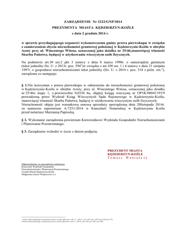ZARZĄDZENIE Nr 2222/GNP/2014 PREZYDENTA MIASTA KĘDZIERZYN-KOŹLE z dnia 2 grudnia 2014 r. w sprawie przysługującego organowi wykonawczemu gminy prawa pierwokupu w związku z zamierzeniem zbycia nieruchomości gruntowej położonej w Kędzierzynie-Koźlu w obrębie Azoty przy ul. Wincentego Witosa, oznaczonej jako działka nr 25/46,stanowiącej własność Skarbu Państwa, będącej w użytkowaniu wieczystym osób fizycznych. Na podstawie art.30 ust.2 pkt 3 ustawy z dnia 8 marca 1990r. o samorządzie gminnym (tekst jednolity Dz. U. z 2013r. poz. 5941)w związku z art.109 ust. 1 i 4 ustawy z dnia 21 sierpnia 1997r. o gospodarce nieruchomościami tekst jednolity (Dz. U. z 2014 r. poz. 518 z późn. zm.2), zarządzam co następuje: § 1.Nie korzystam z prawa pierwokupu w odniesieniu do nieruchomości gruntowej położonej w Kędzierzynie-Koźlu w obrębie Azoty, przy ul. Wincentego Witosa, oznaczonej jako działka nr 25/46z mapy 1, o powierzchni 0,0336 ha, objętej księgą wieczystą nr OP1K/00041193/9 prowadzoną przez Wydział Ksiąg Wieczystych Sądu Rejonowego w Kędzierzynie-Koźlu, stanowiącej własność Skarbu Państwa, będącej w użytkowaniu wieczystym osób fizycznych. Nieruchomość objęta jest warunkową umową sprzedaży sporządzoną dnia 20listopada 2014r. za numerem repertorium A:7251/2014 w Kancelarii Notarialnej w Kędzierzynie Koźlu przed notariusz Marzanną Paprocką. § 2. Wykonanie zarządzenia powierzam Kierownikowi Wydziału Gospodarki Nieruchomościami i Planowania Przestrzennego. § 3. Zarządzenie wchodzi w życie z dniem podjęcia. PREZYDENT MIASTA KĘDZIERZYN-KOŹLE T o m a s z W a n t u ł a (-) Odpowiedzialny za sporządzenie informacji: Kierownik Wydziału Gospodarki Nieruchomościami i Planowania Przestrzennego Urzędu Miasta Kędzierzyn-Koźle Małgorzata Jarosz-Wojtarowicz (-) 1 2 zmiany tekstu jednolitego wymienionej ustawy zostały ogłoszone w Dz. U. z 2013 r. poz. 645 i poz. 1318 oraz 2014 poz.379, zmiany tekstu jednolitego wymienionej ustawy zostały ogłoszone w Dz.U. z 2014r. poz. 659, poz. 805 i poz.906.