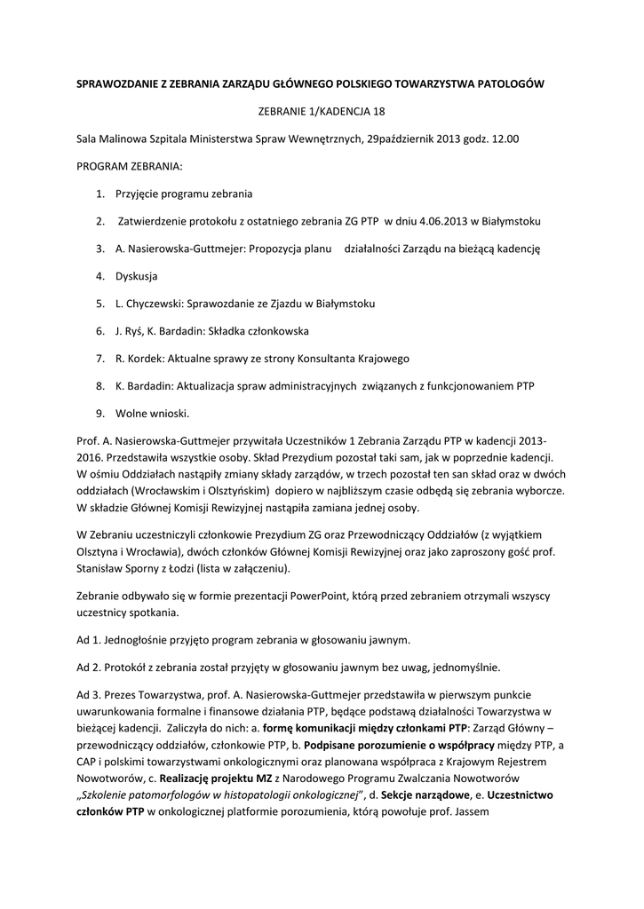 Prof. A. Nasierowska-Guttmejer przywitała Uczestników 1 Zebrania Zarządu PTP w kadencji 20132016. Przedstawiła wszystkie osoby. Skład Prezydium pozostał taki sam, jak w poprzednie kadencji.