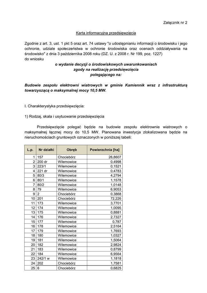 Załącznik nr 2 Karta informacyjna przedsięwzięcia Zgodnie z art. 3, ust. 1 pkt 5 oraz art. 74 ustawy "o udostępnianiu informacji o środowisku i jego ochronie, udziale społeczeństwa w ochronie środowiska oraz ocenach oddziaływania na środowisko" z dnia 3 października 2008 roku (DZ. U. z 2008 r. Nr 199, poz. 1227) do wniosku o wydanie decyzji o środowiskowych uwarunkowaniach zgody na realizację przedsięwzięcia polegającego na: Budowie zespołu elektrowni wiatrowych w gminie Kamiennik wraz z infrastrukturą towarzyszącą o maksymalnej mocy 10,5 MW. I. Charakterystyka przedsięwzięcia: 1) Rodzaj, skala i usytuowanie przedsięwzięcia Przedsięwzięcie polegać będzie na budowie zespołu elektrownie wiatrowych o maksymalnej łącznej mocy do 10,5 MW. Planowana inwestycja zlokalizowana będzie na nieruchomościach gruntowych oznaczonych w poniższej tabeli: L.p. 1 2 3 4 5 6 7 8 9 10 11 12 13 14 15 16 17 18 19 20 21 22 23 24 25 Nr działki 157 200 dr 223/1 221 dr 80/3 80/1 80/2 79 2 201 173 174 175 176 177 178 179 180 181 182 183 184 242/1 w 202 6 Obręb Chociebórz Wilemowice Wilemowice Wilemowice Wilemowice Wilemowice Wilemowice Wilemowice Chociebórz Chociebórz Wilemowice Wilemowice Wilemowice Wilemowice Wilemowice Wilemowice Wilemowice Wilemowice Wilemowice Wilemowice Wilemowice Wilemowice Wilemowice Chociebórz Chociebórz Powierzchnia [ha] 26,8607 0,4998 0,1521 0,4783 4,2794 1,1578 1,0148 6,9053 0,3868 72,226 3,7701 1,0095 0,8881 2,7327 0,787 2,5164 1,7693 1,0327 1,5064 2,9824 0,8799 6,9564 1,1818 1,7581 0,6825 26 27 28 29 30 31 32 33 34 35 36 37 38 39 40 41 42 43 44 45 46 47 48 49 50 51 52 53 54 55 56 57 58 442 441 516 dr 440/3 dr 514 415/2 415/3 416 515/2 410/8 410/9 440/1 440/2 439 432 513 437 438/2 433/6 433/5 431 511 510 433/4 438/1 430 434/1 434/2 435 436/3 436/2 436/1 203 Kamiennik Kamiennik Kamiennik Kamiennik Kamiennik Kamiennik Kamiennik Kamiennik Kamiennik Kamiennik Kamiennik Kamiennik Kamiennik Kamiennik Kamiennik Kamiennik Kamiennik Kamiennik Kamiennik Kamiennik Kamiennik Kamiennik Kamiennik Kamiennik Kamiennik Kamiennik Kamiennik Kamiennik Kamiennik Kamiennik Kamiennik Chociebórz Chociebórz 1,4825 1,6584 0,1407 0,0227 1,018 2,8518 1,7216 4,371 0,0489 4,1808 1,0558 1,0986 1,5419 4,4337 2,4128 0,1705 4,6673 2,5695 0,5086 2,7164 2,3864 0,3218 0,3035 0,0181 0,2435 2,3696 2,6339 0,4853 2,1527 0,0103 0,5584 1,577 0,5579 W skład przedsięwzięcia będą wchodziły 3 turbiny. Wysokość piasty pojedynczej turbiny wynosić będzie maksymalnie 145 m n. p. t. Ważnym elementem przedsięwzięcia jest infrastruktura towarzysząca, która składać sie będzie z dróg dojazdowych, placów manewrowych, okablowania nadziemnego i podziemnego, transformatorów. Dla planowanego przedsięwzięcia inwestor nie uzyskał jeszcze warunków przyłączenia. Nie znane jest więc miejsce przyłączenia planowanej farmy oraz zakres prac związanych z budowa przyłącza. Jednym z możliwych rozwiązań jest podłączenie planowanej inwestycji do istniejącego GPZ Cieszanowice za pomocą kabla średniego napięcia. Inwestycja planowana jest w gminie Kamiennik, w powiecie nyskim, w województwie opolskim. Teren pod elektrownie składa się z gruntów rolnych, teren jest otwarty i stosunkowo urozmaicony pod względem ukształtowania rzeźby terenu. Turbiny wiatrowe są tak planowane by ich położenie zapewniło odległość 750 m od obszarów chronionych akustycznie oraz 200 m od lasów. Zachowanie takich odległości zapewni nieprzekroczenie dopuszczalnych norm hałasu na najbliższych terenach objętych ochroną akustyczną oraz spowoduje, iż elektronie nie będą posadowione na terenach ważnych dla nietoperzy. Łączna powierzchnia nieruchomości gruntowych, na których planowana jest inwestycja to 196,7042 ha. Na obecnym etapie projektowania nie jest możliwe podanie dokładnych lokalizacji turbin wiatrowych, które będą wchodziły w skład parku wiatrowego. Lokalizacja turbin uzależniona jest od wyniku pomiaru wiatru, rezultatu negocjacji z właścicielami gruntów. Z tej przyczyny został wskazany obszar, na którym inwestycja planowana jest do realizacji. 2. Obsługa komunikacyjna: - lokalizacja wjazdu i wyjazdu: drogi dojazdowe zostaną zaprojektowane w sposób najbardziej racjonalny i będą prowadziły pod każdą turbinę; - ilość miejsc postojowo-parkingowych na terenie objętym inwestycją oraz na terenach przyległych: nie planuje się; - ilość samochodów osobowych: • na etapie realizacji : 6 szt./dobę • na etapie eksploatacji: 1 szt./dobę • na etapie likwidacji: 6 szt./ dobę; - ilość samochodów ciężarowych i innych pojazdów: • na etapie realizacji: 250 szt./turbinę • na etapie eksploatacji: 0 szt./turbinę • na etapie likwidacji: 200 szt./turbinę 3. Powierzchnia zajmowanej nieruchomości: Powierzchnia jaka zostanie zajęta przez obiekty budowlane to maksymalnie 2,0 ha, wartość ta stanowi około 1,0 % terenu planowego pod inwestycję. 4. Dotychczasowy sposób wykorzystania terenu przedsięwzięcie i istniejących obiektów budowlanych: na którym planowane jest Tereny planowane pod inwestycję polegającą na budowie zespołu elektrowni wiatrowych wykorzystywane są jako grunty orne. Na gruntach tych prowadzona jest zmechanizowana produkcja rolna. Po zakończeniu inwestycji przeznaczenie gruntów nie ulegnie zmianie. 5. Pokrycie nieruchomości szatą roślinną (w tym gatunki chronione): Nieruchomości planowane pod inwestycję użytkowane są jako grunty orne, na których prowadzona jest uprawa zbóż i rośli okopowych oraz użytki zielone. Nie stwierdzono występowania na terenie gatunków chronionych. 6. Rodzaj technologii: Planowana inwestycja polega na budowie parku wiatrowego złożonego z maksymalnie 3 turbin wiatrowych o łącznej mocy do 10,5 MW. Wysokość piasty turbiny wynosić będzie maksymalnie 145 m. Pojedyncza turbina wiatrowa składa się z czterech podstawowych elementów: fundamentu, wieży, gondoli oraz wirnika. 