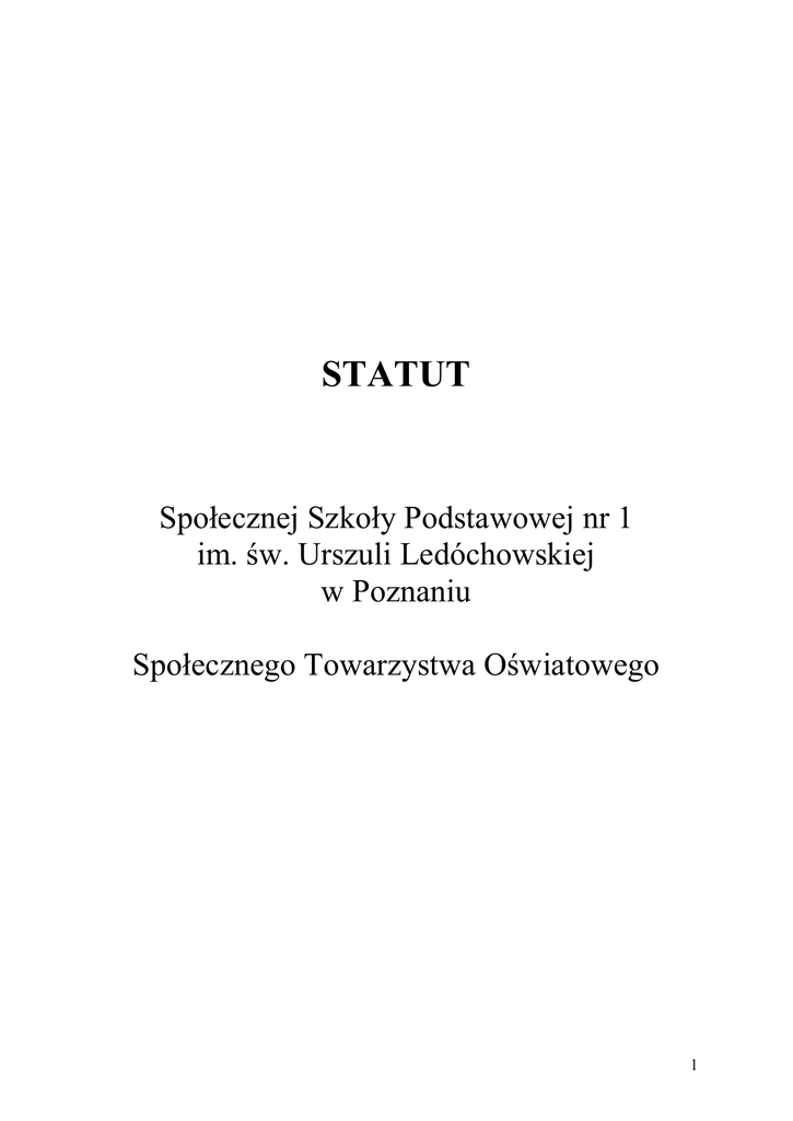 STATUT Społecznej Szkoły Podstawowej nr 1 im. św. Urszuli Ledóchowskiej w Poznaniu Społecznego Towarzystwa Oświatowego 1 Rozdział I PRZEPISY OGÓLNE §1 1. Szkoła posiada nazwę w brzmieniu: Społeczna Szkoła Podstawowa nr 1 im. św. Urszuli Ledóchowskiej w Poznaniu Społecznego Towarzystwa Oświatowego 2. Ilekroć w Statucie występuje zwrot Szkoła należy przez to rozumieć Społeczna Szkoła Podstawowa nr 1 im. św. Urszuli Ledóchowskiej w Poznaniu Społecznego Towarzystwa Oświatowego 3. Nazwa Szkoły używana jest w pełnym brzmieniu (§ 1 pkt.1). Na pieczęciach i stemplach może być używany czytelny skrót nazwy Szkoły. 4. Siedziba Szkoły mieści się w budynku przy ul. Grunwaldzkiej 154 w Poznaniu. §2 1. Organem prowadzącym Szkołę jest Samodzielne Koło Terenowe nr 15 w Poznaniu Społecznego Towarzystwa Oświatowego posiadające osobowość prawną. 2. Organ prowadzący działa poprzez Zarząd Samodzielnego Koła Terenowego nr 15 Społecznego Towarzystwa Oświatowego. 3. Zarząd Samodzielnego Koła Terenowego nr 15 STO sprawuje nadzór nad działalnością szkoły w zakresie spraw finansowych i administracyjnych. 4. Nadzór pedagogiczny nad Szkołą sprawuje Wielkopolski Kurator Oświaty w Poznaniu. 5. Program kształcenia jest zgodny z przepisami prawa oświatowego obowiązującymi w szkołach niepublicznych z uprawnieniami szkoły publicznej. 6. Statut Szkoły jest podstawowym aktem prawnym regulującym działalność Szkoły. §3 1. Dyrektora Szkoły powołuje i odwołuje Zarząd Samodzielnego Koła Terenowego nr 15 STO, który jest dla Dyrektora Szkoły pracodawcą (zgodnie z Kodeksem pracy). 2. Dyrektor Szkoły jest pełnomocnikiem pracodawcy w rozumieniu Kodeksu pracy. 2 3. Dyrektor Szkoły nawiązuje i rozwiązuje stosunki pracy z wszystkimi pracownikami Szkoły. Z upoważnienia organu prowadzącego zawiera także inne umowy niezbędne do właściwego funkcjonowania Szkoły. 4. Nauczyciele i inni pracownicy Szkoły zatrudniani są na podstawie umowy o pracę zgodnie z Kodeksem pracy. Dodatkowo do nauczycieli maja zastosowanie przepisy ustawy Karta Nauczyciela – w zakresie ustalonym tą ustawą dla szkół niepublicznych z uprawnieniami szkół publicznych. §4 W Szkole mogą działać stowarzyszenia i organizacje, których cele statutowe są zgodne z charakterem i profilem wychowawczym Szkoły. Zgodę na podjęcie działalności przez stowarzyszenie lub organizację wydaje i określa warunki działalności na terenie Szkoły Zarząd Samodzielnego Koła Terenowego nr 15 STO. §5 1. Działalność dydaktyczno – wychowawcza oraz działalność organów Szkoły i organizacji tam działających prowadzona jest zgodnie z przepisami prawa oraz ideami zawartymi w Powszechnej Deklaracji Praw Człowieka, Deklaracji Praw Dziecka oraz Konwencji o Prawach Dziecka przyjętej przez Zgromadzenie Ogólne ONZ w dniu 20.09.1989. 2. Wychowanie w szkole jest oparte na chrześcijańskiej koncepcji miłości. 3. Szkoła nosi imię świętej Urszuli Ledóchowskiej. 4. Świętem patronalnym Szkoły jest dzień 11 listopada. 5. Szkoła posiada własny sztandar i godło, które uwidocznione jest na sztandarze i uczniowskich tarczach szkolnych. 6. Szkoła posiada ceremoniał szkolny. Szkoła obchodzi uroczystości szkolne wymienione w szkolnym programie wychowawczym. Rozdział II CELE I ZADANIA SZKOŁY §6 1. Podstawowym celem szkoły jest kształcenie i wychowanie uczniów, które są oparte na chrześcijańskiej koncepcji miłości wyrażonej w „Hymnie o miłości” św. Pawła z jego Pierwszego listu do Koryntian, rozdział 13 – do odpowiedzialności za siebie i za innych oraz za dobro wspólne w życiu rodzinnym i społecznym. 3 2. Celem szkoły jest dążenie do wspólnotowego działania jej podmiotów: nauczycieli, rodziców i uczniów na rzecz idei wychowania opartego na miłości. Preferowanie wychowania personalistycznego i uczenie, że rozwój osoby wymaga otwarcia na potrzeby innych osób i całej wspólnoty. 3. Celem szkoły i jej podmiotów jest dążenie, by była ona placówką radosną, sprzyjającą rozwojowi osobowości dziecka w duchu akceptacji dla jego inności w obrębie wspólnoty, w której żyje: „Aby jemu było dobrze i z nim było dobrze”. 4. Szkoła realizuje cele i zadania określone dla tego typu szkół w ustawie o systemie oświaty i odpowiednich przepisach wykonawczych, opierając się na chrześcijańskim systemie wartości. 5. Realizując cele i zadania, o których mowa w ust. 1, Szkoła w szczególności: 1) kształtuje środowisko wychowawcze wspomagające pełny rozwój osoby, 2) umożliwia zdobycie wiedzy i umiejętności przewidzianych na określonym poziomie kształcenia w szkołach publicznych, niezbędnych do uzyskania promocji, 3) sprawuje opiekę nad uczniami odpowiednio do ich potrzeb oraz własnych możliwości. 6. Realizując zadania ustawy o systemie oświaty, Szkoła w szczególności: 1) wychowuje uczniów w duchu tradycji narodowej – umiłowania Boga i Ojczyzny, przy zachowaniu szacunku dla innych kultur i religii, 2) umożliwia uczniom potrzebującym uzyskanie zindywidualizowanej pomocy, według potrzeb i możliwości Szkoły, 3) umożliwia uczniom zdolnym rozwój ich zdolności i talentów przez udział w wybranych kołach zainteresowań i pogłębianie wiedzy przez dobór lektury, 7. Szkoła spełnia warunki ustawowe przewidziane dla szkół niepublicznych posiadających uprawnienia szkoły publicznej, które stanowią: 1) obowiązek realizowania programów nauczania uwzględniających podstawy programowe obowiązkowych przedmiotów ogólnokształcących, 2) obowiązek stosowania ustalonych przez Ministra Edukacji Narodowej zasad klasyfikowania i promowania uczniów oraz przeprowadzania sprawdzianów i egzaminów, 3) obowiązek prowadzenia dokumentacji przebiegu nauczania, ustalonej dla szkół publicznych, 4) obowiązek zatrudniania nauczycieli przedmiotów obowiązkowych posiadających kwalifikacje określone 