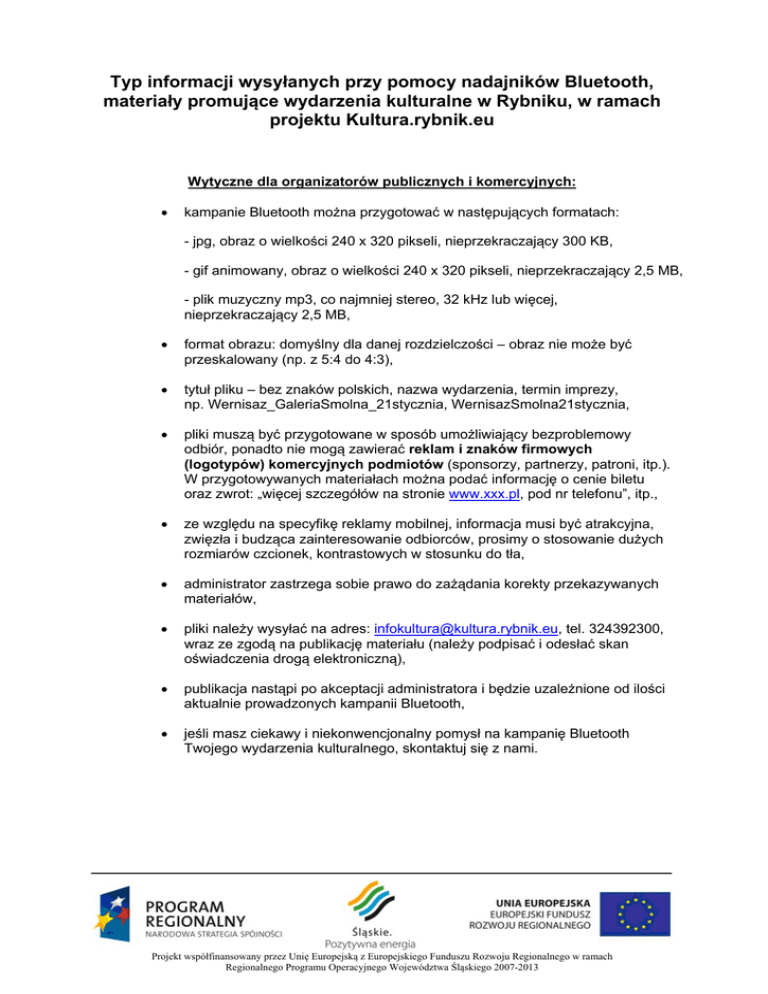 Typ informacji wysyłanych przy pomocy nadajników Bluetooth, materiały promujące wydarzenia kulturalne w Rybniku, w ramach projektu Kultura.rybnik.eu Wytyczne dla organizatorów publicznych i komercyjnych: • kampanie Bluetooth można przygotować w następujących formatach: - jpg, obraz o wielkości 240 x 320 pikseli, nieprzekraczający 300 KB, - gif animowany, obraz o wielkości 240 x 320 pikseli, nieprzekraczający 2,5 MB, - plik muzyczny mp3, co najmniej stereo, 32 kHz lub więcej, nieprzekraczający 2,5 MB, • format obrazu: domyślny dla danej rozdzielczości – obraz nie może być przeskalowany (np. z 5:4 do 4:3), • tytuł pliku – bez znaków polskich, nazwa wydarzenia, termin imprezy, np. Wernisaz_GaleriaSmolna_21stycznia, WernisazSmolna21stycznia, • pliki muszą być przygotowane w sposób umożliwiający bezproblemowy odbiór, ponadto nie mogą zawierać reklam i znaków firmowych (logotypów) komercyjnych podmiotów (sponsorzy, partnerzy, patroni, itp.). W przygotowywanych materiałach można podać informację o cenie biletu oraz zwrot: „więcej szczegółów na stronie www.xxx.pl, pod nr telefonu”, itp., • ze względu na specyfikę reklamy mobilnej, informacja musi być atrakcyjna, zwięzła i budząca zainteresowanie odbiorców, prosimy o stosowanie dużych rozmiarów czcionek, kontrastowych w stosunku do tła, • administrator zastrzega sobie prawo do zażądania korekty przekazywanych materiałów, • pliki należy wysyłać na adres: [email protected], tel. 324392300, wraz ze zgodą na publikację materiału (należy podpisać i odesłać skan oświadczenia drogą elektroniczną), • publikacja nastąpi po akceptacji administratora i będzie uzależnione od ilości aktualnie prowadzonych kampanii Bluetooth, • jeśli masz ciekawy i niekonwencjonalny pomysł na kampanię Bluetooth Twojego wydarzenia kulturalnego, skontaktuj się z nami. Projekt współfinansowany przez Unię Europejską z Europejskiego Funduszu Rozwoju Regionalnego w ramach Regionalnego Programu Operacyjnego Województwa Śląskiego 2007-2013