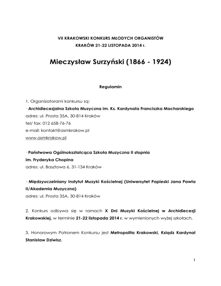 VII KRAKOWSKI KONKURS MŁODYCH ORGANISTÓW KRAKÓW 21-22 LISTOPADA 2014 r. Mieczysław Surzyński (1866 - 1924) Regulamin 1. Organizatorami konkursu są: · Archidiecezjalna Szkoła Muzyczna im. Ks. Kardynała Franciszka Macharskiego adres: ul. Prosta 35A, 30-814 Kraków tel/ fax: 012 658-76-76 e-mail: [email protected] www.asmkrakow.pl · Państwowa Ogólnokształcąca Szkoła Muzyczna II stopnia im. Fryderyka Chopina adres: ul. Basztowa 6, 31-134 Kraków · Międzyuczelniany Instytut Muzyki Kościelnej (Uniwersytet Papieski Jana Pawła II/Akademia Muzyczna) adres: ul. Prosta 35A, 30-814 Kraków 2. Konkurs odbywa się w ramach X Dni Muzyki Kościelnej w Archidiecezji Krakowskiej, w terminie 21-22 listopada 2014 r. w wymienionych wyżej szkołach. 3. Honorowym Patronem Konkursu jest Metropolita Krakowski, Ksiądz Kardynał Stanisław Dziwisz. 1 4. Celem konkursu jest: - wyłonienie wybitnie uzdolnionej młodzieży; - promocja wykonawstwa literatury organowej, szczególnie utworów o tematyce religijnej lub inspirowanych muzyką religijną; - konfrontacja dokonań szkół muzycznych II stopnia z całego kraju; - doskonalenie zawodowe nauczycieli klas organów. 5. Konkurs adresowany jest do uczniów klas IV-VI szkół muzycznych II stopnia. Uczestnikami mogą być również uczniowie klas III tychże szkół i słuchacze Diecezjalnych Studiów Organistowskich, jeśli spełnią wymagania repertuarowe. Laureaci pierwszych miejsc poprzednich edycji konkursu nie mogą brać udziału w edycji bieżącej. 6. Kryteria oceniania Kandydatów oceniać będzie jury powołane przez Dyrektora Centrum Edukacji Artystycznej. Zasady punktacji i rozdziału nagród ustalają jurorzy w oparciu o odrębny regulamin ustanowiony na pierwszym, roboczym posiedzeniu jury. Decyzje jury są ostateczne i nieodwołalne. 7. Konkurs przebiegać będzie w 2 etapach. Uczestnicy zakwalifikowani do konkursu biorą udział w obydwu etapach. Oto wymagany repertuar konkursu: · Program I etapu, który odbędzie się w Archidiecezjalnej Szkole Muzycznej dnia 21 listopada 2014 r. obejmuje wykonanie: · wybranego utworu kompozytora polskiego inspirowanego pieśnią religijną · utworu dowolnego (możliwe jest wykonanie części utworu) · Program II etapu, który odbędzie się w Państwowej Ogólnokształcącej Szkole Muzycznej dnia 22 listopada 2014 r. obejmuje wykonanie: · I lub III części jednej z Sonat triowych Johanna Sebastiana Bacha; 2 · wybranego utworu Mieczysława Surzyńskiego z podanych niżej kompozycji: Elegia op.30 Kolęda op.36 Pastorale op.36 Chant triste op.36 Capriccio op.36 Toccata fis-moll op.36 Improwizacje na temat "Święty Boże" op.38 Choral varie op.50 Czas trwania całości programu obydwu etapów konkursu nie może przekroczyć 30 minut. Uczestnicy konkursu zobowiązani są do przestrzegania podanych limitów czasowych. Istnieje możliwość wyboru kolejności wykonywanych utworów. 8. Zgłoszenia uczestników na prawidłowo wypełnionej karcie zgłoszeniowej (prosimy wypełniać czytelnie pismem drukowanym) wraz z podpisem dyrektora szkoły, należy nadesłać w nieprzekraczalnym terminie do 18 października 2014 r. na adres Biura Organizacyjnego Konkursu. Zgłoszenia nadesłane po upływie podanego terminu nie będą przyjmowane. Ilość uczestników jest ograniczona, a o zakwalifikowaniu się do Konkursu decyduje kolejność zgłoszeń. Podpis dyrektora Szkoły na kwestionariuszu zgłoszeniowym jest równoznaczny z delegowaniem reprezentanta Szkoły do udziału w konkursie. Uwaga: Prosimy o podanie pełnych tytułów wszystkich wykonywanych podczas konkursu utworów, jak również dokładnych numerów katalogowych dzieł, np. BuxWV, BWV, JA, Opus itp. 3 9. Do 31 października 2014 r. zostaną wysłane do uczestników potwierdzenia o zakwalifikowaniu się do udziału w przesłuchaniach konkursowych, zawierające datę i godzinę prób oraz występu. 10. Uczestnicy konkursu wystąpią w kolejności alfabetycznej, począwszy od kandydata wybranego w drodze losowania. 11. Uczestnik konkursu będzie miał zapewnioną możliwość próby przed każdym z etapów konkursu. Terminy prób zostaną przesłane wraz z potwierdzeniem zakwalifikowania kandydata do przesłuchań konkursowych. 12. Uczestnik konkursu ma obowiązek osobistego zarejestrowania się w Biurze Organizacyjnym Konkursu, najpóźniej w dniu poprzedzającym jego rozpoczęcie tj. w czwartek 20 listopada 2014 r. 13. Wpisowe konkursu w wysokości 50 zł. należy przelać w nieprzekraczalnym terminie do 15 listopada 2014 r. na niżej podany rachunek bankowy: Archidiecezjalna Szkoła Muzyczna II stopnia Alior Bank 30 2490 0005 0000 4520 9220 0792 W tytule płatności prosimy podać: · imię i nazwisko uczestnika konkursu; · nazwę delegującej go Szkoły · oraz formułę: „konkurs”. W razie rezygnacji z udziału w konkursie wpisowe nie podlega zwrotowi. 14. Koszty podróży, zakwaterowania i wyżywienia pokrywają uczestnicy. 4 15. Propozycje miejsc zakwaterowania zostaną przedstawione wraz z potwierdzeniem udziału kandydata w konkursie. 16. Wyznaczeni przez Jury laureaci konkursu zobowiązani są do wystąpienia na koncercie laureatów, który odbędzie się w sali organowej Akademii Muzycznej w Krakowie dnia 22 listopada 2014 r. (sobota). Program koncertu zostanie ustalony przez Jury. 17. Wszyscy uczestnicy konkursu otrzymają dyplom uczestnictwa. Ponadto laureaci konkursu otrzymają nagrody. Poza wyłonieniem laureatów przewidziana jest również możliwość przyznania przez Jury wyróżnień. 18. Biuro Organizacyjne VII KRAKOWSKIEGO KONKURSU MŁODYCH ORGANISTÓW: Archidiecezjalna Szkoła Muzyczna im. Ks. Kardynała Franciszka Macharskiego ul. Prosta 35A, 30-814 KRAKÓW, tel. 12 658 76 66 Wszelkich informacji dotyczących konkursu udzielają Koordynatorzy: Aleksandra Gawlik: tel.: 694 591 365 e – mail: [email protected] Maciej Banek tel.: 602 608 448 e – mail: [email protected] 5