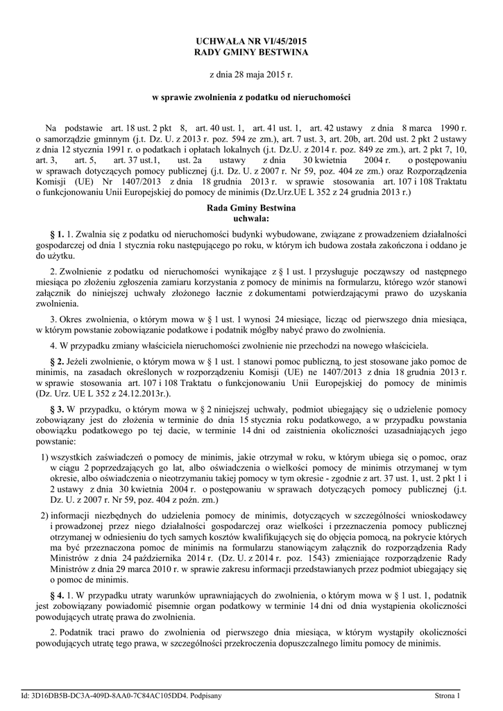 UCHWAŁA NR VI/45/2015 RADY GMINY BESTWINA z dnia 28 maja 2015 r. w sprawie zwolnienia z podatku od nieruchomości Na podstawie art. 18 ust. 2 pkt 8, art. 40 ust. 1, art. 41 ust. 1, art. 42 ustawy z dnia 8 marca 1990 r. o samorządzie gminnym (j.t. Dz. U. z 2013 r. poz. 594 ze zm.), art. 7 ust. 3, art. 20b, art. 20d ust. 2 pkt 2 ustawy z dnia 12 stycznia 1991 r. o podatkach i opłatach lokalnych (j.t. Dz.U. z 2014 r. poz. 849 ze zm.), art. 2 pkt 7, 10, art. 3, art. 5, art. 37 ust.1, ust. 2a ustawy z dnia 30 kwietnia 2004 r. o postępowaniu w sprawach dotyczących pomocy publicznej (j.t. Dz. U. z 2007 r. Nr 59, poz. 404 ze zm.) oraz Rozporządzenia Komisji (UE) Nr 1407/2013 z dnia 18 grudnia 2013 r. w sprawie stosowania art. 107 i 108 Traktatu o funkcjonowaniu Unii Europejskiej do pomocy de minimis (Dz.Urz.UE L 352 z 24 grudnia 2013 r.) Rada Gminy Bestwina uchwala: § 1. 1. Zwalnia się z podatku od nieruchomości budynki wybudowane, związane z prowadzeniem działalności gospodarczej od dnia 1 stycznia roku następującego po roku, w którym ich budowa została zakończona i oddano je do użytku. 2. Zwolnienie z podatku od nieruchomości wynikające z § 1 ust. 1 przysługuje począwszy od następnego miesiąca po złożeniu zgłoszenia zamiaru korzystania z pomocy de minimis na formularzu, którego wzór stanowi załącznik do niniejszej uchwały złożonego łacznie z dokumentami potwierdzającymi prawo do uzyskania zwolnienia. 3. Okres zwolnienia, o którym mowa w § 1 ust. 1 wynosi 24 miesiące, licząc od pierwszego dnia miesiąca, w którym powstanie zobowiązanie podatkowe i podatnik mógłby nabyć prawo do zwolnienia. 4. W przypadku zmiany właściciela nieruchomości zwolnienie nie przechodzi na nowego właściciela. § 2. Jeżeli zwolnienie, o którym mowa w § 1 ust. 1 stanowi pomoc publiczną, to jest stosowane jako pomoc de minimis, na zasadach określonych w rozporządzeniu Komisji (UE) ne 1407/2013 z dnia 18 grudnia 2013 r. w sprawie stosowania art. 107 i 108 Traktatu o funkcjonowaniu Unii Europejskiej do pomocy de minimis (Dz. Urz. UE L 352 z 24.12.2013r.). § 3. W przypadku, o którym mowa w § 2 niniejszej uchwały, podmiot ubiegający się o udzielenie pomocy zobowiązany jest do złożenia w terminie do dnia 15 stycznia roku podatkowego, a w przypadku powstania obowiązku podatkowego po tej dacie, w terminie 14 dni od zaistnienia okoliczności uzasadniających jego powstanie: 1) wszystkich zaświadczeń o pomocy de minimis, jakie otrzymał w roku, w którym ubiega się o pomoc, oraz w ciągu 2 poprzedzających go lat, albo oświadczenia o wielkości pomocy de minimis otrzymanej w tym okresie, albo oświadczenia o nieotrzymaniu takiej pomocy w tym okresie - zgodnie z art. 37 ust. 1, ust. 2 pkt 1 i 2 ustawy z dnia 30 kwietnia 2004 r. o postępowaniu w sprawach dotyczących pomocy publicznej (j.t. Dz. U. z 2007 r. Nr 59, poz. 404 z poźn. zm.) 2) informacji niezbędnych do udzielenia pomocy de minimis, dotyczących w szczególności wnioskodawcy i prowadzonej przez niego działalności gospodarczej oraz wielkości i przeznaczenia pomocy publicznej otrzymanej w odniesieniu do tych samych kosztów kwalifikujących się do objęcia pomocą, na pokrycie których ma być przeznaczona pomoc de minimis na formularzu stanowiącym załącznik do rozporządzenia Rady Ministrów z dnia 24 października 2014 r. (Dz. U. z 2014 r. poz. 1543) zmieniające rozporządzenie Rady Ministrów z dnia 29 marca 2010 r. w sprawie zakresu informacji przedstawianych przez podmiot ubiegający się o pomoc de minimis. § 4. 1. W przypadku utraty warunków uprawniających do zwolnienia, o którym mowa w § 1 ust. 1, podatnik jest zobowiązany powiadomić pisemnie organ podatkowy w terminie 14 dni od dnia wystąpienia okoliczności powodujących utratę prawa do zwolnienia. 2. Podatnik traci prawo do zwolnienia od pierwszego dnia miesiąca, w którym wystąpiły okoliczności powodujących utratę tego prawa, w szczególności przekroczenia dopuszczalnego limitu pomocy de minimis. Id: 3D16DB5B-DC3A-409D-8AA0-7C84AC105DD4. Podpisany Strona 1 3. W przypadku nie dotrzymania przez podatnika któregokolwiek z wymienionych w uchwale warunków, w szczególności nie dostarczenia dokumentów określonych w art. 37 ust. 1 i ust. 2a ustawy z dnia 30 kwietnia 2004 r. o postępowaniu w sprawach dotyczących pomocy publicznej zwolnienie nie przysługuje. 4. Podatnik, który wprowadził w błąd organ udzielający pomocy co do spełnienia warunków uprawniających do uzyskania zwolnienia, traci prawo do zwolnienia za cały okres przez jaki korzystał ze zwolnienia. 5. Podatnik korzystający ze zwolnienia, na żądanie organu podatkowego, przedkłada wszelkie dowody i informacje, celem stwierdzenia warunków zwolnienia od podatku od nieruchomości. 6. Organ udzielający pomocy de minimis zastrzega sobie prawo do przeprowadzenia kontroli u podatnika korzystającego z pomocy w zakresie sprawdzenia zgodności ze stanem faktycznym składanych dokumentów, informacji i oświadczeń. § 5. Zwolnienie nie przysługuje przedsiębiorcy, który jest zadłużony w stosunku do Gminy Bestwina z jakiegokolwiek tytułu, a także w okresie dwóch lat przed zgłoszeniem zamiaru skorzystania ze zwolnienia określonego niniejszą uchwałą, uzyskał umorzenie zaległości z tytułu podatku od nieruchomości. § 6. Uchwała obowiązuje do dnia 31 grudnia 2020 r. i w tym okresie podatnik może nabyć prawo do zwolnienia. § 7. Wykonanie uchwały powierza się Wójtowi Gminy Bestwina. § 8. Uchwała podlega podaniu do publicznej wiadomości w sposób zwyczajowo przyjęty na terenie Gminy Bestwina. § 9. Uchwała wchodzi w życie po upływie czternastu dni od dnia jej ogłoszenia w Dzienniku Urzędowym Województwa Śląskiego. Przewodniczący Rady mgr Jerzy Stanclik Id: 3D16DB5B-DC3A-409D-8AA0-7C84AC105DD4. Podpisany Strona 2 Załącznik do Uchwały Nr VI/45/2015 Rady Gminy Bestwina z dnia 28 maja 2015 r. …………………………