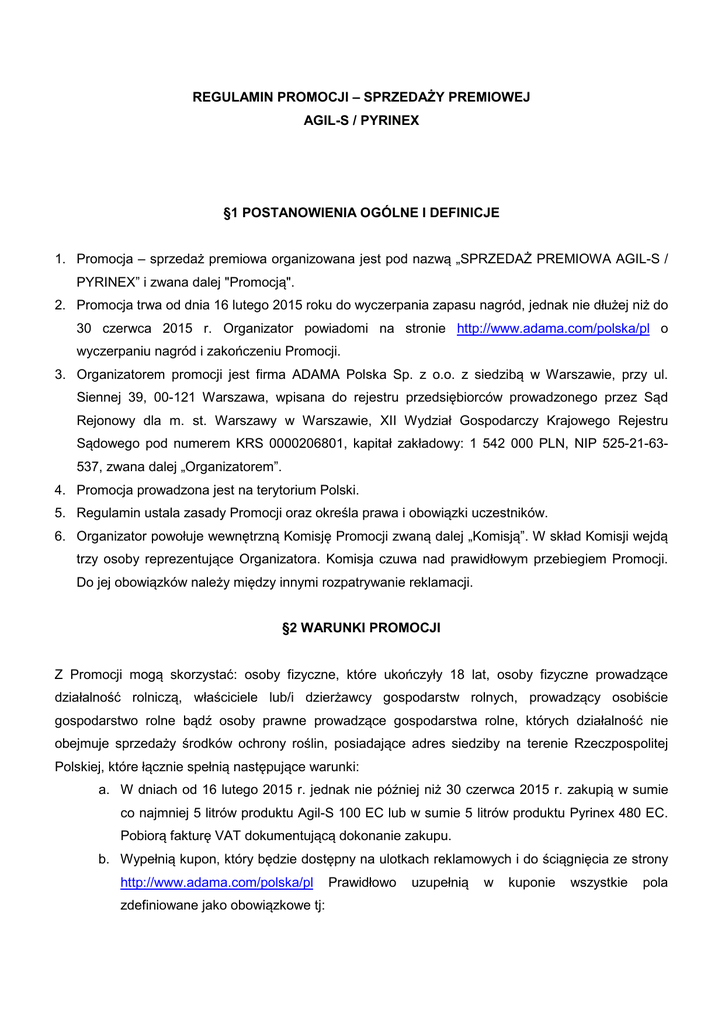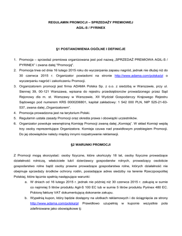 REGULAMIN PROMOCJI – SPRZEDAŻY PREMIOWEJ AGIL-S / PYRINEX §1 POSTANOWIENIA OGÓLNE I DEFINICJE 1. Promocja – sprzedaż premiowa organizowana jest pod nazwą „SPRZEDAŻ PREMIOWA AGIL-S / PYRINEX” i zwana dalej "Promocją". 2. Promocja trwa od dnia 16 lutego 2015 roku do wyczerpania zapasu nagród, jednak nie dłużej niż do 30 czerwca 2015 r. Organizator powiadomi na stronie http://www.adama.com/polska/pl o wyczerpaniu nagród i zakończeniu Promocji. 3. Organizatorem promocji jest firma ADAMA Polska Sp. z o.o. z siedzibą w Warszawie, przy ul. Siennej 39, 00-121 Warszawa, wpisana do rejestru przedsiębiorców prowadzonego przez Sąd Rejonowy dla m. st. Warszawy w Warszawie, XII Wydział Gospodarczy Krajowego Rejestru Sądowego pod numerem KRS 0000206801, kapitał zakładowy: 1 542 000 PLN, NIP 525-21-63537, zwana dalej „Organizatorem”. 4. Promocja prowadzona jest na terytorium Polski. 5. Regulamin ustala zasady Promocji oraz określa prawa i obowiązki uczestników. 6. Organizator powołuje wewnętrzną Komisję Promocji zwaną dalej „Komisją”. W skład Komisji wejdą trzy osoby reprezentujące Organizatora. Komisja czuwa nad prawidłowym przebiegiem Promocji. Do jej obowiązków należy między innymi rozpatrywanie reklamacji. §2 WARUNKI PROMOCJI Z Promocji mogą skorzystać: osoby fizyczne, które ukończyły 18 lat, osoby fizyczne prowadzące działalność rolniczą, właściciele lub/i dzierżawcy gospodarstw rolnych, prowadzący osobiście gospodarstwo rolne bądź osoby prawne prowadzące gospodarstwa rolne, których działalność nie obejmuje sprzedaży środków ochrony roślin, posiadające adres siedziby na terenie Rzeczpospolitej Polskiej, które łącznie spełnią następujące warunki: a. W dniach od 16 lutego 2015 r. jednak nie później niż 30 czerwca 2015 r. zakupią w sumie co najmniej 5 litrów produktu Agil-S 100 EC lub w sumie 5 litrów produktu Pyrinex 480 EC. Pobiorą fakturę VAT dokumentującą dokonanie zakupu. b. Wypełnią kupon, który będzie dostępny na ulotkach reklamowych i do ściągnięcia ze strony http://www.adama.com/polska/pl zdefiniowane jako obowiązkowe tj: Prawidłowo uzupełnią w kuponie wszystkie pola dla osób fizycznych: imię, nazwisko, adres, numer telefonu, adres e-mail, numery faktur, których zgłoszenie dotyczy oraz uzupełnią pola dotyczące akceptacji zasad regulaminu Promocji i przetwarzania danych. Poświadczą wpisane dane własnoręcznym podpisem; dla osób prawnych: nazwę firmy, adres, numer NIP, imię i nazwisko osoby reprezentującej podmiot, numer telefonu, adres e-mail, numery faktur, których zgłoszenie dotyczy oraz uzupełnią pola dotyczące akceptacji zasad regulaminu Promocji i przetwarzania danych osobowych. Poświadczą wpisane dane pieczęcią firmy i podpisem osoby reprezentującej podmiot. c. Dołączą do wypełnionego kuponu kopie faktur VAT, które zostały wymienione na kuponie. d. Zachowają oryginały faktur VAT, które zostały wymienione na kuponie. e. W terminie od 16 lutego 2015 r. jednak nie później niż 30 czerwca 2015 r. wyślą na adres ADAMA Polska Sp. z o.o., ul. Sienna 39, 00-121 Warszawa, dokumenty, o których mowa powyżej. §3 NAGRODY 1. Nagrodami w Promocji jest: - 1000 kubków z limitowanej serii z rysunkiem Andrzeja Mleczki dotyczącym preparatu Agil-S 100 EC i - 1000 kubków z limitowanej serii z rysunkiem Andrzeja Mleczki dotyczącym preparatu Pyrinex 480 EC. Każdy kubek o wartości 35 zł brutto. 2. Każdy uczestnik Promocji, który spełni postanowienia §2 niniejszego Regulaminu dotyczące zakupu preparatu Agil-S 100 EC otrzyma nagrodę – kubek z rysunkiem dotyczącym preparatu AgilS 100 EC. Nagrody są wydawane do wyczerpania zapasów, jednak nie dłużej niż do 19 września 2015 r. 3. Każdy uczestnik Promocji, który spełni postanowienia §2 niniejszego Regulaminu dotyczące zakupu preparatu Pyrinex 480 EC otrzyma nagrodę – kubek z rysunkiem dotyczącym preparatu Pyrinex 480 EC. Nagrody są wydawane do wyczerpania zapasów, jednak nie dłużej niż do 19 września 2015 r. 4. Uczestnik Promocji rozumiany, jako członek jednego gospodarstwa domowego tj. zamieszkały pod tym samym adresem, niezależnie od posiadanego imienia i nazwiska może otrzymać maksymalnie dwa kubki po jednym z każdego rodzaju. 5. W przypadku uczestnictwa w Promocji osoby prawnej, niezależnie od imienia i nazwiska osoby reprezentującej, można otrzymać maksymalnie dwa kubki po jednej z każdego rodzaju. 6. Wysyłka nagród zostanie dokonana najpóźniej do 19 września 2015 r. 7. Przekazanie nagrody zwycięzcy odbędzie się za pośrednictwem poczty polskiej lub za pośrednictwem firmy kurierskiej. 8. Nagrody nie podlegają zamianie na inne nagrody rzeczowe ani na ich równowartość pieniężną. Prawo do nagrody przysługujące osobom nagrodzonym nie jest zbywalne. §4 DANE OSOBOWE UCZESTNIKÓW PROMOCJI 1. Dane osobowe uczestników Promocji są przetwarzane zgodnie z postanowieniami ustawy z dnia 29 sierpnia 1997 r. o ochronie danych osobowych (Dz. U. z 2002 r., Nr 101, poz. 926 ze zm.). 2. Administratorem danych osobowych uczestników Promocji jest Organizator. Dane uczestników Promocji są przetwarzane jedynie w celach związanych z organizacją i przeprowadzeniem Promocji. Każdy z uczestników Promocji ma prawo wglądu do swoich danych osobowych oraz ich poprawiania. Podanie danych osobowych jest dobrowolne, jednocześnie niezbędne dla potrzeb rozstrzygnięcia Promocji oraz rozpatrzenia ewentualnych reklamacji. § 5 POSTANOWIENIA KOŃCOWE 1. Reklamacje mogą być zgłaszane przez uczestników Promocji na piśmie w czasie trwania Promocji, najpóźniej w ciągu 30 dni od daty wydania nagrody. 2. Reklamacje rozpatruje Komisja. Rozpatrzeniu podlegają wyłącznie reklamacje zgłoszone w formie pisemnej (listem poleconym) na adres ADAMA Polska Sp. z o.o., ul. Sienna 39, 00-121 Warszawa. 3. Rozpatrywanie reklamacji trwa do 14 dni od dnia wpłynięcia reklamacji, włąc