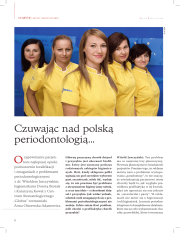 A ASYST Y DENT YST YCZNEJ S Y S T A D E N T Y S T Y C Z N A fot. A. Larisz SYLWETKI Czuwając nad polską periodontologią... O zapewnianiu pacjentom najlepszej opieki, podnoszeniu kwalifikacji i zmaganiach z problemami periodontologicznymi z dr. Witoldem Jurczyńskim, higienistkami Dorotą Brożek i Katarzyną Kowal z Centrum Stomatologicznego „Globus” rozmawiała Anna Olszewska-Adamowicz. 8 Główną przyczyną chorób dziąseł i przyzębia jest obecność biofilmu, który jest usuwany podczas codziennych zabiegów higienicznych. Dziś, kiedy sklepowe półki uginają się pod szerokim wyborem past, szczoteczek, nitek itd., wydaje się, że nie powinno być problemu z utrzymaniem higieny jamy ustnej, a co za tym idzie – z chorobami dziąseł i przyzębia. Jak widać jednak, odsetek osób zmagających się z problemami periodontologicznymi nie maleje. Gdzie zatem tkwi problem, jeśli chodzi o profilaktykę chorób przyzębia? Witold Jurczyński: Ten problem ma co najmniej trzy płaszczyzny. Pierwsza płaszczyzna to świadomość pacjentów. Pomimo tego, że reklamy mówią nam o problemie występowania „paradontozy”, to nie znaczy, że uświadamiają pacjentowi istotę choroby bądź to, jak wygląda prawidłowa profilaktyka w tej kwestii, gdyż nie ogranicza się ona jedynie do „szczoteczki i pasty”. W reklamach nie mówi się o higienizacji i roli higienistek. Leczenie periodontologiczne to kompleksowe działanie, które ma na celu wyhamowanie choroby przewlekłej, która towarzyszy SYLWETKI 3/2012 pacjentom przez całe życie. Dlatego musi być wypracowana pewna strategia postępowania – proszę zauważyć, że o tym się w reklamach nie mówi. Następną płaszczyznę stanowią lekarze, którzy mając wiele zadań do wykonania, począwszy od stomatologii zachowawczej, przez protetykę, implantologię, owej periodontologii poświęcają zbyt mało czasu. Za mało również uwagi poświęcają na uświadamianie pacjentom, jak powinno wyglądać leczenie tej choroby. Nie chodzi mi tutaj o doradzanie pacjentowi, jaką wybrać szczoteczkę. Mało jest w gabinetach informacji dotyczących strategii postępowania i sposobów leczenia w przypadku chorób przyzębia. W tej strategii pacjent musi przejść przez trzy fazy leczenia: uświadomienie o chorobie, leczenie, podtrzymywanie wyników leczenia. Natomiast trzecią płaszczyznę stanowi pacjent. Z racji tego, że mamy do czynienia z chorobą przewlekłą, wymagana jest od niego dyscyplina i ciągła praca, a z uwagi na to, że natura ludzka jest dość leniwa i potrzebuje stałej motywacji, to nie każdy pacjent wchodzi w ramy tej strategii i bywa, że nie wykonuje systematycznej pracy. Co z rolą higienistek w przypadku wystąpienia u pacjenta problemów periodontologicznych? Dorota Brożek: Higienistki stomatologiczne w tej kwestii wykonują właściwie największą pracę. Higienistka w Polsce nie ma jeszcze tak mocno ugruntowanej pozycji, jaką mogłaby i powinna mieć. Spowodowane jest to m.in. poziomem edukacji szkół. Drugi powód stanowią gabinety stomatologiczne, które nie są jeszcze w pełni przygotowane, aby wykorzystywać umiejętności higienistek. Oczywiście ma też na to wpływ wzgląd ekonomiczny. Jak widać, jest to złożony problem. Katarzyna Kowal: Jednak bez względu na owe trudności, najważniejszy jest pacjent. To on za naszym pośrednictwem musi zrozumieć, że szczoteczka do zębów jest ważna w leczeniu tej choroby, ale nie najważniejsza, że równie istotny jest tryb życia. W życiu pacjenta musi się pojawić systematyczność. Podsumowując, aby leczenie było efektywne, musi być odpowiednia strategia postępowania z pacjentem w gabinecie, profesjonalny zespół medyczny oraz otwarty na współpracę pacjent. Jeżeli filar pracy z pacjentem będzie solidny, to wszystkie ASYST Y DENT YST YCZNEJ inne środki, które stanowią dodatek, będą skuteczne. Jaką rolę w Pana Centrum Stomatologicznym „Globus” pełnią higienistki stomatologiczne? W.J.: Higienistki stomatologiczne stanowią podstawową grupę osób pracujących w Centrum Stomatologicznym. Nie można powiedzieć, że jest to jakaś drugorzędna rola, panie, które ten zawód wykonują, zajmują się przygotowaniem pacjenta oraz podtrzymywaniem wyników leczenia. Późniejsze narzekanie lekarzy na pacjentów, którzy np. nie czyszczą zębów albo nie przychodzą na kontrole, spowodowane jest najczęściej zbyt małą ilością czasu, jaka została poświęcona na wytłumaczenie pacjentowi, jak powinna wyglądać współpraca, aby jego leczenie miało długodystansowe wyniki. Dotyczy to działań protetycznych i implantologicznych. W dzisiejszych czasach, kiedy mamy do czynienia z takimi wyzwaniami, jak zapalenie przyzębia wokół prac protetycznych czy też zapalenie wokółwszczepowe, nie wyobrażam sobie gabinetu, który wykonuje takie leczenie bez profesjonalnego supportu higienizacyjnego. Wobec Lekarzom najbardziej potrzebna jest pomoc w postaci wykwalifikowanych higienistek. To z kolei z pewnością wpłynie na poprawę poziomu profilaktyki w Polsce. 9 SYLWETKI tych argumentów widać, że higienistki wykonują kolosalną pracę, a ich rola jest nie do podważenia. Członkowie zespołu „Globus” motywują się wzajemnie do ciągłego rozwoju. Domyślam się, że to Pan jest twórcą „Periopraktyka”. Proszę o tym opowiedzieć. Skąd pomysł na tego typu działalność edukacyjną? W.J.: „Perioprakt yk” to s posób na współpracę z lekarzami i asystą dentystyczną, potrzebującą pogłębienia swojej wiedzy dotyczącej postępowania z pacjentem periodontologicznym. Pomysł powstał co najmniej 12 lat temu, kiedy pracowałem jako nauczyciel akademicki, przez tyle lat zdobywałem doświadczenie wykładowe. Uznaliśmy, że należy stworzyć forum do wymiany doświadczeń w prowadzeniu pacjentów z chorobami przyzębia. Periodontologia to dziedzina „niedoinformowana”, jest zbyt mało informacji praktyc