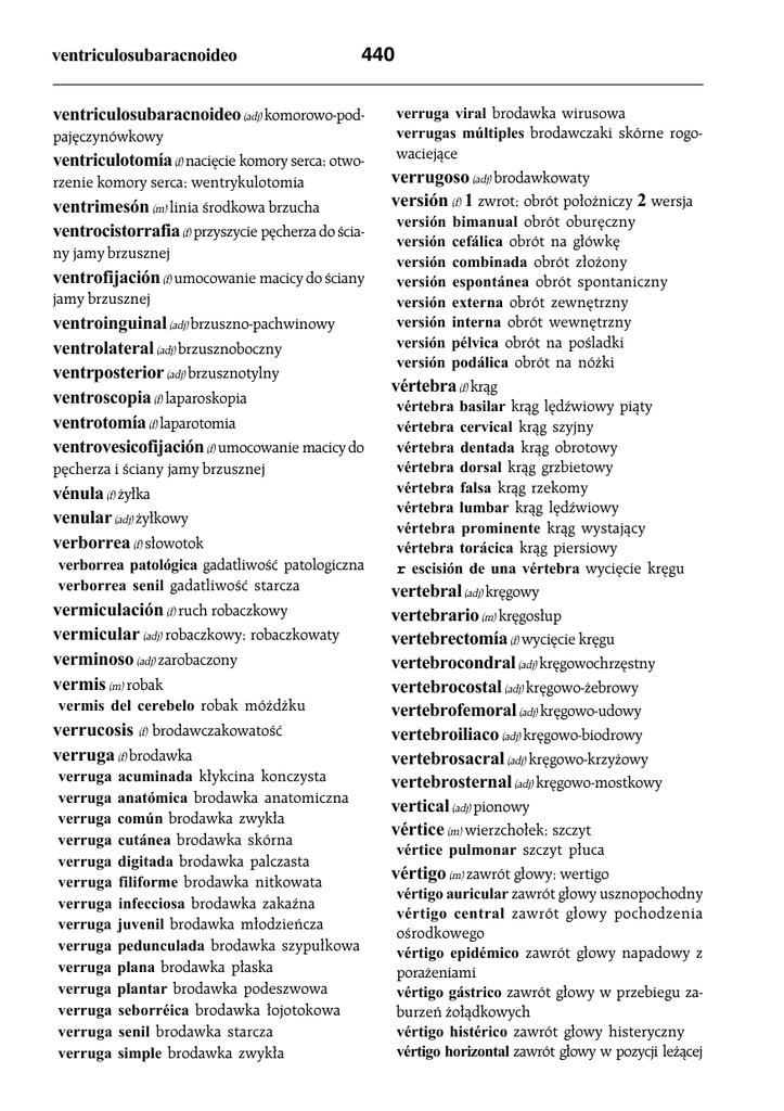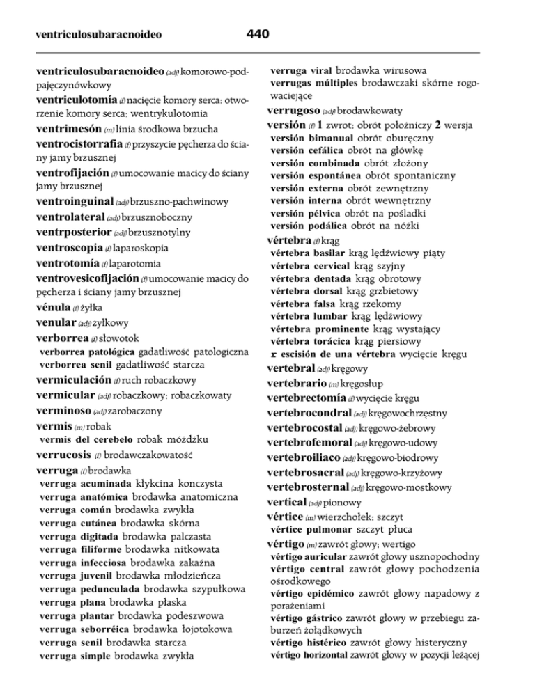 ventriculosubaracnoideo 440 ventriculosubaracnoideo (adj) komorowo-podpajęczynówkowy ventriculotomía (f) nacięcie komory serca; otworzenie komory serca; wentrykulotomia ventrimesón (m) linia środkowa brzucha ventrocistorrafia (f) przyszycie pęcherza do ściany jamy brzusznej ventrofijación (f) umocowanie macicy do ściany jamy brzusznej ventroinguinal (adj) brzuszno-pachwinowy ventrolateral (adj) brzusznoboczny ventrposterior (adj) brzusznotylny ventroscopia (f) laparoskopia ventrotomía (f) laparotomia ventrovesicofijación (f) umocowanie macicy do pęcherza i ściany jamy brzusznej vénula (f) żyłka venular (adj) żyłkowy verborrea (f) słowotok verborrea patológica gadatliwość patologiczna verborrea senil gadatliwość starcza vermiculación (f) ruch robaczkowy vermicular (adj) robaczkowy; robaczkowaty verminoso (adj) zarobaczony vermis (m) robak vermis del cerebelo robak móżdżku verrucosis (f) brodawczakowatość verruga (f) brodawka verruga verruga verruga verruga verruga verruga verruga verruga verruga verruga verruga verruga verruga verruga acuminada kłykcina konczysta anatómica brodawka anatomiczna común brodawka zwykła cutánea brodawka skórna digitada brodawka palczasta filiforme brodawka nitkowata infecciosa brodawka zakaźna juvenil brodawka młodzieńcza pedunculada brodawka szypułkowa plana brodawka płaska plantar brodawka podeszwowa seborréica brodawka łojotokowa senil brodawka starcza simple brodawka zwykła verruga viral brodawka wirusowa verrugas múltiples brodawczaki skórne rogowaciejące verrugoso (adj) brodawkowaty versión (f) 1 zwrot; obrót położniczy 2 wersja versión versión versión versión versión versión versión versión bimanual obrót oburęczny cefálica obrót na główkę combinada obrót złożony espontánea obrót spontaniczny externa obrót zewnętrzny interna obrót wewnętrzny pélvica obrót na pośladki podálica obrót na nóżki vértebra (f) krąg vértebra basilar krąg lędźwiowy piąty vértebra cervical krąg szyjny vértebra dentada krąg obrotowy vértebra dorsal krąg grzbietowy vértebra falsa krąg rzekomy vértebra lumbar krąg lędźwiowy vértebra prominente krąg wystający vértebra torácica krąg piersiowy r escisión de una vértebra wycięcie kręgu vertebral (adj) kręgowy vertebrario (m) kręgosłup vertebrectomía (f) wycięcie kręgu vertebrocondral (adj) kręgowochrzęstny vertebrocostal (adj) kręgowo-żebrowy vertebrofemoral (adj) kręgowo-udowy vertebroiliaco (adj) kręgowo-biodrowy vertebrosacral (adj) kręgowo-krzyżowy vertebrosternal (adj) kręgowo-mostkowy vertical (adj) pionowy vértice (m) wierzchołek; szczyt vértice pulmonar szczyt płuca vértigo (m) zawrót głowy; wertigo vértigo auricular zawrót głowy usznopochodny vértigo central zawrót głowy pochodzenia ośrodkowego vértigo epidémico zawrót głowy napadowy z porażeniami vértigo gástrico zawrót głowy w przebiegu zaburzeń żołądkowych vértigo histérico zawrót głowy histeryczny vértigo horizontal zawrót głowy w pozycji leżącej 441 vértigo laberíntico zawrót głowy błędnikowy vértigo mecánico zawrót głowy wywołany wibracją ciała lub obrotami vértigo nocturno zawrót głowy nocny vértigo ocular zawrót głowy przy wadach refrakcji vértigo orgánico zawrót głowy w chorobach organicznych mózgu vértigo postural zawrót głowy przy zmianie położenia ciała vértigo rotatorio zawrót głowy przy obrotach ciała vértigo vertical zawrót głowy przy patrzeniu w dół lub w górę vértigo vestibular zawrót głowy przedsionkowy verumontanitis (f) zapalenie wzgórka nasiennego verumontanum (m) wzgórek nasienny inflamación del verumontanum zapalenie wzgórka nasiennego vesania (f) obłęd; á locura vesical (adj) pęcherzowy vesícula (f) pęcherzyk vesícula acrosomial pęcherzyk akrosomalny vesícula acústica pęcherzyk słuchowy vesícula alantóica pęcherzyk omoczni vesícula biliar pęcherzyk żółciowy vesícula cerebral pęcherzyk mózgowy vesícula citoplasmática pęcherzyk cytoplazmatyczny vesícula de Graaf pęcherzyk Graafa vesícula lenticular pęcherzyk soczewkowy vesícula ocular pęcherzyk oczny vesícula pinocítica pęcherzyk pinocytowy vesícula seminal pęcherzyk nasienny vesícula sináptica pęcherzyk synaptyczny vesícula umbilical pęcherzyk żółtkowy vesicoabdominal (adj) pęcherzowo-brzuszny vesicobulloso (adj) pęcherzykowo-pęcherzowy vesicocele (m) przepuklina pęcherza vesicocervical (adj) pęcherzowo-szyjkowy vesicoclisis (f) płukanie pęcherza vesicofijación (f) umocowanie pęcherza; cytopeksja vesicointestinal (adj) pęcherzowo-jelitowy vesicoprostático (adj) pęcherzowo-sterczowy vesicopúbico (adj) pęcherzowo-łonowy vesicorrectal (adj) pęcherzowo-odbytniczy vesicorrenal (adj) pęcherzowo-nerkowy viable vesicospinal (adj) pęcherzowo-rdzeniowy vesicotomía (f) nacięcie pęcherza vesicoumbilical (adj) pęcherzowo-pępkowy vesicoureteral (adj) pęcherzowo-moczowodowy vesicouretral (adj) pęcherzowo-cewkowy vesicouterino (adj) pęcherzowo-maciczny vesicovaginal (adj) pęcherzowo-pochwowy vesicovaginorrectal (adj) pęcherzowo-pochwowo-odbytniczy vesicular (adj) pęcherzykowy vesiculectomía (f) wycięcie pęcherzyka nasiennego; wesikulektomia vesiculitis (f) zapalenie pęcherzyków nasiennych vesiculobronquial (adj) pęcherzykowo-oskrzelowy vesiculocavernoso (adj) pęcherzykowo-jamowy vesiculopapular (adj) pęcherzykowo-grudkowy vesiculoprostatitis (f) zapalenie pęcherzyków nasiennych i gruczołu krokowego vesiculotimpánico (adj) pęcherzykowo-bębenkowy vesiculotomía (f) nacięcie pęcherzyka nasiennego; wesikulotomia vestibular (adj) przedsionkowy vestíbulo (m) przedsionek vestíbulo aórtico część lewej komory przed początkiem aorty vestíbulo de la bolsa omental przedsionek torby sieciowej vestíbulo bucal przedsionek jamy ustnej vestíbulo del laberinto óseo przedsionek błędnika kostnego vestíbulo de la laringe przedsionek