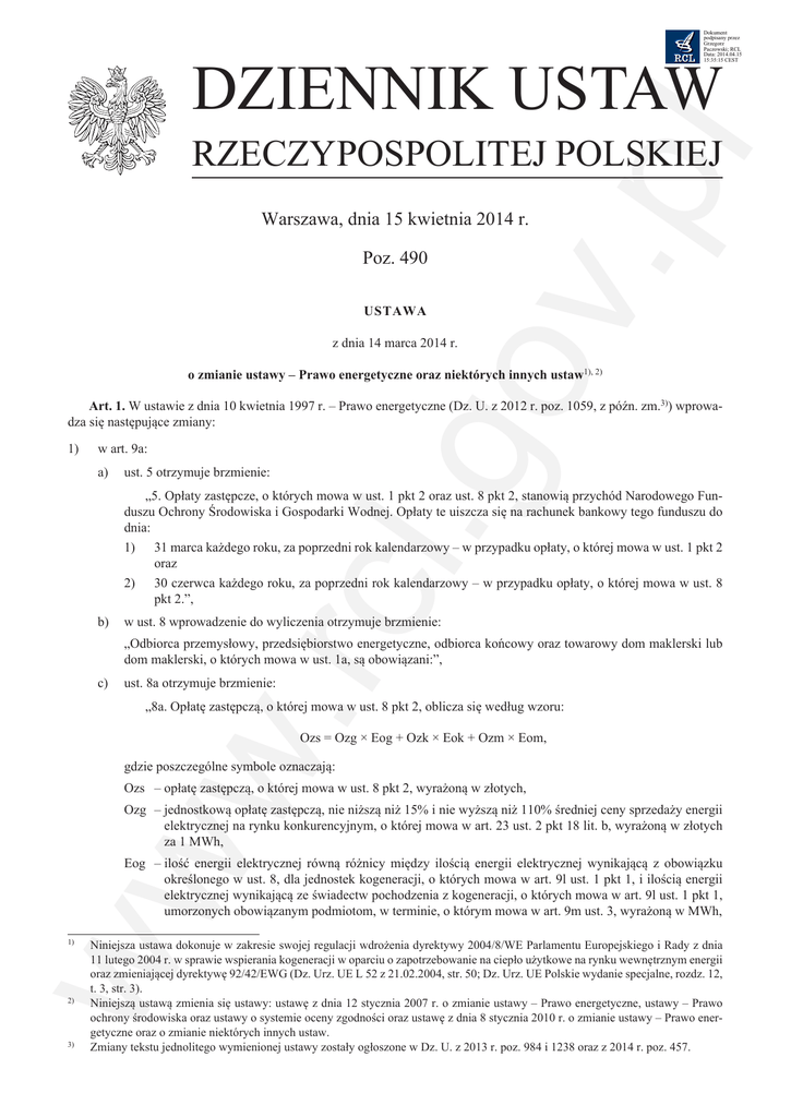 Dokument podpisany przez Grzegorz Paczowski; RCL Data: 2014.04.15 15:35:15 CEST DZIENNIK USTAW v.p l RZECZYPOSPOLITEJ POLSKIEJ Warszawa, dnia 15 kwietnia 2014 r. Poz. 490 USTAWA .go z dnia 14 marca 2014 r. o zmianie ustawy – Prawo energetyczne oraz niektórych innych ustaw1), 2) Art. 1. W ustawie z dnia 10 kwietnia 1997 r. – Prawo energetyczne (Dz. U. z 2012 r. poz. 1059, z późn. zm.3)) wprowadza się następujące zmiany: 1)w art. 9a: a)ust. 5 otrzymuje brzmienie: w. rcl „5. Opłaty zastępcze, o których mowa w ust. 1 pkt 2 oraz ust. 8 pkt 2, stanowią przychód Narodowego Funduszu Ochrony Środowiska i Gospodarki Wodnej. Opłaty te uiszcza się na rachunek bankowy tego funduszu do dnia: 1)31 marca każdego roku, za poprzedni rok kalendarzowy – w przypadku opłaty, o której mowa w ust. 1 pkt 2 oraz 2)30 czerwca każdego roku, za poprzedni rok kalendarzowy – w przypadku opłaty, o której mowa w ust. 8 pkt 2.”, b)w ust. 8 wprowadzenie do wyliczenia otrzymuje brzmienie: „Odbiorca przemysłowy, przedsiębiorstwo energetyczne, odbiorca końcowy oraz towarowy dom maklerski lub dom maklerski, o których mowa w ust. 1a, są obowiązani:”, c)ust. 8a otrzymuje brzmienie: „8a. Opłatę zastępczą, o której mowa w ust. 8 pkt 2, oblicza się według wzoru: Ozs = Ozg × Eog + Ozk × Eok + Ozm × Eom, gdzie poszczególne symbole oznaczają: Ozs – opłatę zastępczą, o której mowa w ust. 8 pkt 2, wyrażoną w złotych, ww Ozg – jednostkową opłatę zastępczą, nie niższą niż 15% i nie wyższą niż 110% średniej ceny sprzedaży energii elektrycznej na rynku konkurencyjnym, o której mowa w art. 23 ust. 2 pkt 18 lit. b, wyrażoną w złotych za 1 MWh, Eog – ilość energii elektrycznej równą różnicy między ilością energii elektrycznej wynikającą z obowiązku określonego w ust. 8, dla jednostek kogeneracji, o których mowa w art. 9l ust. 1 pkt 1, i ilością energii elektrycznej wynikającą ze świadectw pochodzenia z kogeneracji, o których mowa w art. 9l ust. 1 pkt 1, umorzonych obowiązanym podmiotom, w terminie, o którym mowa w art. 9m ust. 3, wyrażoną w MWh, Niniejsza ustawa dokonuje w zakresie swojej regulacji wdrożenia dyrektywy 2004/8/WE Parlamentu Europejskiego i Rady z dnia 11 lutego 2004 r. w sprawie wspierania kogeneracji w oparciu o zapotrzebowanie na ciepło użytkowe na rynku wewnętrznym energii oraz zmieniającej dyrektywę 92/42/EWG (Dz. Urz. UE L 52 z 21.02.2004, str. 50; Dz. Urz. UE Polskie wydanie specjalne, rozdz. 12, t. 3, str. 3). 2) Niniejszą ustawą zmienia się ustawy: ustawę z dnia 12 stycznia 2007 r. o zmianie ustawy – Prawo energetyczne, ustawy – Prawo ochrony środowiska oraz ustawy o systemie oceny zgodności oraz ustawę z dnia 8 stycznia 2010 r. o zmianie ustawy – Prawo energetyczne oraz o zmianie niektórych innych ustaw. 3) Zmiany tekstu jednolitego wymienionej ustawy zostały ogłoszone w Dz. U. z 2013 r. poz. 984 i 1238 oraz z 2014 r. poz. 457. 1) Dziennik Ustaw –2– Poz. 490 v.p l Ozk – jednostkową opłatę zastępczą, nie niższą niż 5% i nie wyższą niż 40% średniej ceny sprzedaży energii elektrycznej na rynku konkurencyjnym, o której mowa w art. 23 ust. 2 pkt 18 lit. b, wyrażoną w złotych za 1 MWh, Eok – ilość energii elektrycznej równą różnicy między ilością energii elektrycznej wynikającą z obowiązku określonego w ust. 8, dla jednostek kogeneracji, o których mowa w art. 9l ust. 1 pkt 2, i ilością energii elektrycznej wynikającą ze świadectw pochodzenia z kogeneracji, o których mowa w art. 9l ust. 1 pkt 2, umorzonych obowiązanemu podmiotowi, w terminie, o którym mowa w art. 9m ust. 3, wyrażoną w MWh, Ozm – jednostkową opłatę zastępczą, nie niższą niż 30% i nie wyższą niż 120% średniej ceny sprzedaży energii elektrycznej na rynku konkurencyjnym, o której mowa w art. 23 ust. 2 pkt 18 lit. b, wyrażoną w złotych za 1 MWh, d)w ust. 10: .go Eom – ilość energii elektrycznej równą różnicy między ilością energii elektrycznej wynikającą z obowiązku określonego w ust. 8 dla jednostek kogeneracji, o których mowa w art. 9l ust. 1 pkt 1a, i ilością energii elektrycznej wynikającą ze świadectw pochodzenia z kogeneracji, o których mowa w art. 9l ust. 1 pkt 1a, umorzonych obowiązanym podmiotom, w terminie, o którym mowa w art. 9m ust. 3, wyrażoną w MWh.”, – wprowadzenie do wyliczenia otrzymuje brzmienie: „Minister właściwy do spraw gospodarki określi, w drodze rozporządzenia, sposób obliczania danych podanych we wniosku o wydanie świadectwa pochodzenia z kogeneracji, o którym mowa w art. 9l ust. 1, oraz szczegółowy zakres obowiązku potwierdzania danych, o których mowa w art. 9l ust. 8, w tym:”, – uchyla się pkt 5; 2)w art. 9m ust. 3 otrzymuje brzmienie: w. rcl „3. Świadectwo pochodzenia z kogeneracji umorzone przez Prezesa Urzędu Regulacji Energetyki do dnia 30 czerwca danego roku kalendarzowego, wydane dla energii elektrycznej wytworzonej w jednostce kogeneracji w poprzednim roku kalendarzowym, jest uwzględniane przy rozliczeniu wykonania obowiązku określonego w art. 9a ust. 8, w poprzednim roku kalendarzowym.”. Art. 2. W ustawie z dnia 12 stycznia 2007 r. o zmianie ustawy – Prawo energetyczne, ustawy – Prawo ochrony środowiska oraz ustawy o systemie oceny zgodności (Dz. U. Nr 21, poz. 124) uchyla się art. 13. Art. 3. W ustawie z dnia 8 stycznia 2010 r. o zmianie ustawy – Prawo energetyczne oraz o zmianie niektórych innych ustaw (Dz. U. Nr 21, poz. 104) uchyla się art. 11. Art. 4. 1. Zakres obowiązku uzyskania i przedstawienia do umorzenia świadectwa pochodzenia z kogeneracji lub uiszczenia opłaty zastępczej, o którym mowa w art. 9a ust. 8 ustawy zmienianej w art. 1, określa się: 1)dla jednostki kogeneracji, o której mowa w art. 9l ust. 1 pkt 1 ustawy zmienianej w art. 1, na poziomie: a)3,9% w 2014 r., b)4,9% w 2015 r., c)6,0% w 2016 r., d)7,0% w 2017 r., ww e)8,0% w 2018 r.; 2)dl