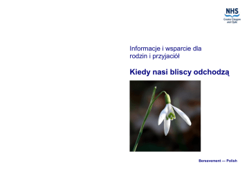 Informacje i wsparcie dla rodzin i przyjaciół Kiedy nasi bliscy odchodzą Bereavement — Polish Przydatne dane kontaktowe Spis treści Wprowadzenie Informacja • Kapelan szpitalny • Akt zgonu i zaświadczenie o kremacji • Sekcja zwłok • Odbiór prywatnych pieniędzy i przedmiotów należących do pacjentów • Zgłoszenie zgonu • Informacje wymagane przez Urząd Stanu Cywilnego • Jakie dokumenty są wymagane? • Wypisy z aktu zgonu • Organizacja pogrzebu • Płatność za pogrzeb • Doradztwo finansowe • Kontakt z innymi organizacjami Wsparcie • Na początku • Nagła śmierć • Pożegnanie • Żal po stracie jest normalny • Ból • Dzieci i młodzież również przeżywają żałobę • Krok po kroku • Życie nie jest już takie samo Wprowadzenie Śmierć członka rodziny lub przyjaciela to trudne i pełne zmartwień doświadczenie. Być może po raz pierwszy są Państwo odpowiedzialni za organizację pogrzebu i nie wiedzą, od czego zacząć. W niniejszej broszurze zawarto informacje na temat przygotowań do pogrzebu i możliwości uzyskania wsparcia oraz dane kontaktowe. Mamy nadzieję, że broszura pomoże Państwu wywiązać się ze wszystkich obowiązków. Informacja W przypadku śmierci kogoś bliskiego wiele osób nie wie, z kim i kiedy się skontaktować. Są trzy sprawy, które należy załatwić bezpośrednio: • uzyskać akt zgonu; • zgłosić zgon w ciągu 8 dni; • skontaktować się z zakładem pogrzebowym i ustalić szczegóły dotyczące pogrzebu. Kapelan szpitalny W szpitalach NHS można uzyskać wsparcie ze strony kapelanów, bez względu na wyznanie czy przekonania. Kapelan zapewni wsparcie w czasie żałoby, wysłucha Państwa wątpliwości i trosk i udzieli porad dotyczących pogrzebu. Kapelani mogą również udzielić informacji na temat różnych wspólnot wyznaniowych i pomóc z nimi się skontaktować. Akt zgonu i zaświadczenie o kremacji Jeśli śmierć nastąpiła w domu, mogą Państwo odebrać akt zgonu i zaświadczenie o kremacji z gabinetu lekarza rodzinnego opiekującego się zmarłym. Najlepiej wcześniej zadzwonić do gabinetu i upewnić się, że dokumenty zostały już przygotowane. Jeśli śmierć miała miejsce w szpitalu, będą Państwo mieli kontakt ze starszą pielęgniarką oddziałową lub pielęgniarką nadzorującą dany oddział. To ona wykona czynności niezbędne do wydania przez lekarza aktu zgonu. Akt ten jest wydawany bezpłatnie. Jeśli z przyczyn religijnych wydanie aktu zgonu musi być przyspieszone, należy powiadomić o tym personel oddziału. Jeśli poproszono Państwa o odebranie aktu zgonu następnego dnia, najlepiej zadzwonić na oddział ok. godziny 11:00, aby upewnić się, że dokument został przygotowany – dzięki temu nie będą Państwo tracić czasu, czekając na oddziale (jeśli zgon jest badany przez koronera, procedura wydania aktu zgonu może się różnić). Jeśli zdecydowali się Państwo na kremację, należy o tym poinformować starszą pielęgniarkę oddziałową, pielęgniarkę nadzorującą dany oddział lub lekarza. Pomoże to uniknąć opóźnień związanych z koniecznością przygotowania dokumentów przez dwóch lekarzy. Aby zgłosić zgon, nie trzeba posiadać zaświadczenia o kremacji. Kierownik zakładu pogrzebowego odbierze to zaświadczenie w Państwa imieniu. Zaświadczenie o braku chorób zakaźnych — Jeśli zmarły ma zostać repatriowany poza Zjednoczone Królestwo, kierownik zakładu pogrzebowego będzie potrzebował zaświadczenia lekarskiego potwierdzającego brak chorób zakaźnych u zmarłego. Wydanie takiego zaświadczenia może się wiązać z niewielką opłatą. Wszelkie problemy i wątpliwości związane z wydaniem tego zaświadczenia wyjaśni kierownik zakładu pogrzebowego. Sekcja zwłok W przypadku nagłej i niespodziewanej śmierci lekarz rodzinny lub lekarz pracujący w szpitalu może nie mieć uprawnień do wydania aktu zgonu. W takim przypadku zawiadamiane jest biuro koronera. W przypadku niektórych rodzajów zgonu (np. wypadków przy pracy, samobójstw itp.) jest to wymóg prawny. Koroner podejmuje następnie decyzję, czy konieczne jest wykonanie sekcji zwłok. Jest to tzw. sekcja zwłok na wniosek koronera. Sekcja zwłok zostanie przeprowadzona tak szybko, jak to możliwe. Po sekcji patolog wypełni akt zgonu. Należy pamiętać, że jest to powszechnie stosowana procedura, która w żadnym wypadku nie sugeruje, że śmierć mogła mieć podłoże kryminalne. Jeśli śmierć została zgłoszona do Biura Koronera, oficjalne zaświadczenie o kremacji nie jest wymagane. Koroner wystawi formularz E1. W innych sytuacjach mogą Państwo zostać poproszeni o wydanie pisemnej, świadomej zgody na wykonanie „szpitalnej” sekcji zwłok. Mają Państwo prawo wiedzieć, jakie są przyczyny wykonania sekcji, i mogą odmówić wydania zgody. Główne powody wykonywania sekcji zwłok to: • badanie natury choroby w przypadkach, w których nie została ona jeszcze ustalona; • podanie dodatkowych informacji na temat przyczyny śmierci; • wykrycie komplikacji lub działań niepożądanych terapii i leków; • diagnozowanie schorzeń, które mogą dotyczyć również innych członków rodziny. Odbiór prywatnych pieniędzy i przedmiotów należących do pacjentów Prywatne pieniądze i przedmioty należące do pacjentów, oprócz pieniędzy, mogą obejmować odzież, cenne przedmioty itp. Mogą Państwo odebrać z oddziału odzież w dowolnym dogodnym dla Państwa momencie. Jeśli to możliwe, należy mieć ze sobą odpowiednią walizkę. Personel oddziału poinformuje Państwa także o ewentualnych przedmiotach lub pieniądzach, które zostały przekazane do depozytu. Przedmioty i pieniądze należące do zmarłego mogą odebrać z kasy szpitala lub biura spraw pacjentów wyłącznie najbliżsi krewni. Jeśli najbliżsi krewni nie mogą odebrać prywatnych przedmiotów lub pieniędzy, należy skontaktować się z pracownikiem kasy. Dost