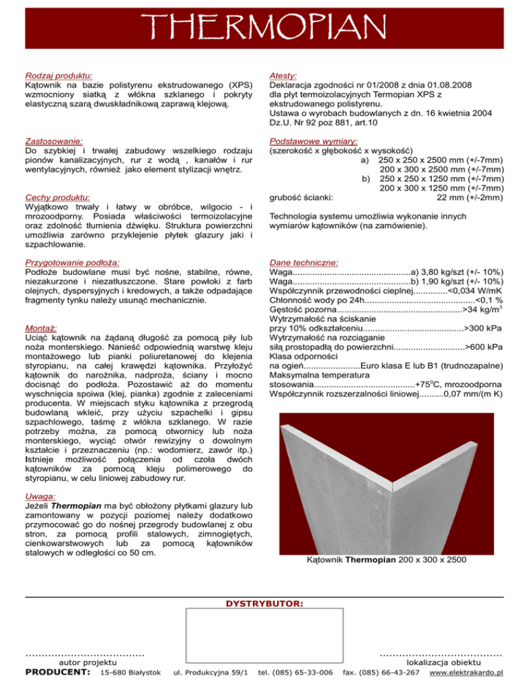 THERMOPIAN Rodzaj produktu: Kątownik na bazie polistyrenu ekstrudowanego (XPS) wzmocniony siatką z włókna szklanego i pokryty elastyczną szarą dwuskładnikową zaprawą klejową. Atesty: Deklaracja zgodności nr 01/2008 z dnia 01.08.2008 dla płyt termoizolacyjnych Termopian XPS z ekstrudowanego polistyrenu. Ustawa o wyrobach budowlanych z dn. 16 kwietnia 2004 Dz.U. Nr 92 poz 881, art.10 Zastosowanie: Do szybkiej i trwałej zabudowy wszelkiego rodzaju pionów kanalizacyjnych, rur z wodą , kanałów i rur wentylacyjnych, równieŜ jako element stylizacji wnętrz. Podstawowe wymiary: (szerokość x głębokość x wysokość) a) 250 x 250 x 2500 mm (+/-7mm) 200 x 300 x 2500 mm (+/-7mm) b) 250 x 250 x 1250 mm (+/-7mm) 200 x 300 x 1250 mm (+/-7mm) grubość ścianki: 22 mm (+/-2mm) Cechy produktu: Wyjątkowo trwały i łatwy w obróbce, wilgocio - i mrozoodporny. Posiada właściwości termoizolacyjne oraz zdolność tłumienia dźwięku. Struktura powierzchni umoŜliwia zarówno przyklejenie płytek glazury jaki i szpachlowanie. Przygotowanie podłoŜa: PodłoŜe budowlane musi być nośne, stabilne, równe, niezakurzone i niezatłuszczone. Stare powłoki z farb olejnych, dyspersyjnych i kredowych, a takŜe odpadające fragmenty tynku naleŜy usunąć mechanicznie. MontaŜ: Uciąć kątownik na Ŝądaną długość za pomocą piły lub noŜa monterskiego. Nanieść odpowiednią warstwę kleju montaŜowego lub pianki poliuretanowej do klejenia styropianu, na całej krawędzi kątownika. PrzyłoŜyć kątownik do naroŜnika, nadproŜa, ściany i mocno docisnąć do podłoŜa. Pozostawić aŜ do momentu wyschnięcia spoiwa (klej, pianka) zgodnie z zaleceniami producenta. W miejscach styku kątownika z przegrodą budowlaną wkleić, przy uŜyciu szpachelki i gipsu szpachlowego, taśmę z włókna szklanego. W razie potrzeby moŜna, za pomocą otwornicy lub noŜa monterskiego, wyciąć otwór rewizyjny o dowolnym kształcie i przeznaczeniu (np.: wodomierz, zawór itp.) Istnieje moŜliwość połączenia od czoła dwóch kątowników za pomocą kleju polimerowego do styropianu, w celu liniowej zabudowy rur. Technologia systemu umoŜliwia wykonanie innych wymiarów kątowników (na zamówienie). Dane techniczne: Waga................................................a) 3,80 kg/szt (+/- 10%) Waga................................................b) 1,90 kg/szt (+/- 10%) Współczynnik przewodności cieplnej..............<0,034 W/mK Chłonność wody po 24h.............................................<0,1 % Gęstość pozorna...................................................>34 kg/m3 Wytrzymałość na ściskanie przy 10% odkształceniu.........................................>300 kPa Wytrzymałość na rozciąganie siłą prostopadłą do powierzchni.............................>600 kPa Klasa odporności na ogień.......................Euro klasa E lub B1 (trudnozapalne) Maksymalna temperatura stosowania.........................................+750C, mrozoodporna Współczynnik rozszerzalności liniowej..........0,07 mm/(m K) Uwaga: JeŜeli Thermopian ma być obłoŜony płytkami glazury lub zamontowany w pozycji poziomej naleŜy dodatkowo przymocować go do nośnej przegrody budowlanej z obu stron, za pomocą profili stalowych, zimnogiętych, cienkowarstwowych lub za pomocą kątowników stalowych w odległości co 50 cm. Kątownik Thermopian 200 x 300 x 2500 DYSTRYBUTOR: ..................................... ...................................... autor projektu PRODUCENT: 15-680 Białystok lokalizacja obiektu ul. Produkcyjna 59/1 tel. (085) 65-33-006 fax. (085) 66-43-267 www.elektrakardo.pl