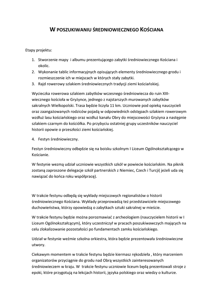 W POSZUKIWANIU ŚREDNIOWIECZNEGO KOŚCIANA Etapy projektu: 1. Stworzenie mapy i albumu prezentującego zabytki średniowiecznego Kościana i okolic. 2. Wykonanie tablic informacyjnych opisujących elementy średniowiecznego grodu i rozmieszczenie ich w miejscach w których stały zabytki. 3. Rajd rowerowy szlakiem średniowiecznych tradycji ziemi kościańskiej. Wycieczka rowerowa szlakiem zabytków wczesnego średniowiecza do ruin XIIIwiecznego kościoła w Gryżynce, jednego z najstarszych murowanych zabytków sakralnych Wielkopolski. Trasa będzie liczyła 11 km. Uczniowie pod opieką nauczycieli oraz zaangażowanych rodziców pojadą w odpowiednich odstępach szlakiem rowerowym wzdłuż lasu kościańskiego oraz wzdłuż kanału Obry do miejscowości Gryżyna a następnie szlakiem czarnym do kościółka. Po przybyciu ostatniej grupy uczestników nauczyciel historii opowie o przeszłości ziemi kościańskiej. 4. Festyn średniowieczny. Festyn średniowieczny odbędzie się na boisku szkolnym I Liceum Ogólnokształcącego w Kościanie. W festynie wezmą udział uczniowie wszystkich szkół w powiecie kościańskim. Na piknik zostaną zaproszone delegacje szkół partnerskich z Niemiec, Czech i Turcji( jeżeli uda się nawiązać do końca roku współpracę). W trakcie festynu odbędą się wykłady miejscowych regionalistów o historii średniowiecznego Kościana. Wykłady przeprowadzą też przedstawiciele miejscowego duchowieństwa, którzy opowiedzą o zabytkach sztuki sakralnej w mieście. W trakcie festynu będzie można porozmawiać z archeologiem (nauczycielem historii w I Liceum Ogólnokształcącym), który uczestniczył w pracach poszukiwawczych mających na celu zlokalizowanie pozostałości po fundamentach zamku kościańskiego. Udział w festynie weźmie szkolna orkiestra, która będzie prezentowała średniowieczne utwory. Ciekawym momentem w trakcie festynu będzie kiermasz rękodzieła , który marzeniem organizatorów przyciągnie do grodu nad Obrą wszystkich zainteresowanych średniowieczem w kraju. W trakcie festynu uczniowie liceum będą prezentowali stroje z epoki, które przygotują na lekcjach historii, języka polskiego oraz wiedzy o kulturze. Każda klasa upiecze jedną blachę ciasta według staropolskich przepisów, ciasto będzie sprzedawana kawałek za 50gr za sztukę a pieniądze zostaną przeznaczone na TPD czyli Towarzystwo Pomocy Dzieciom w naszej szkole. Dzięki współpracy z wydziałem Historii Uniwersytetu Adama Mickiewicza zostanie przeprowadzona średniowieczna rozprawa sądowa, na której to młodzież pozna system prawa miejskiego w średniowiecznym Kościanie. Kulminacyjnym punktem będzie inscenizowany pojedynek rycerski w strojach z epoki oraz przy wykorzystaniu broni średniowiecznej. W trakcie zabawy będzie można płacić monetami które wybije specjalnie na tą okazję miasto Kościan. W czasie festynu odbędzie się finał i wyłonienie laureatów konkursu wiedzy o średniowiecznym Kościanie. Konkurs prowadzony będzie w 2 kategoriach wiekowych: pierwszą będą tworzyli uczniowie szkoły podstawowej i gimnazjum a drugą grupę będą tworzyli uczniowie szkoły średniej oraz osoby dorosłe. Zadaniem uczestników będzie poprawne rozwiązanie testu sprawdzającego wiedzę o średniowieczu, który opublikowany będzie w lokalnej gazecie.