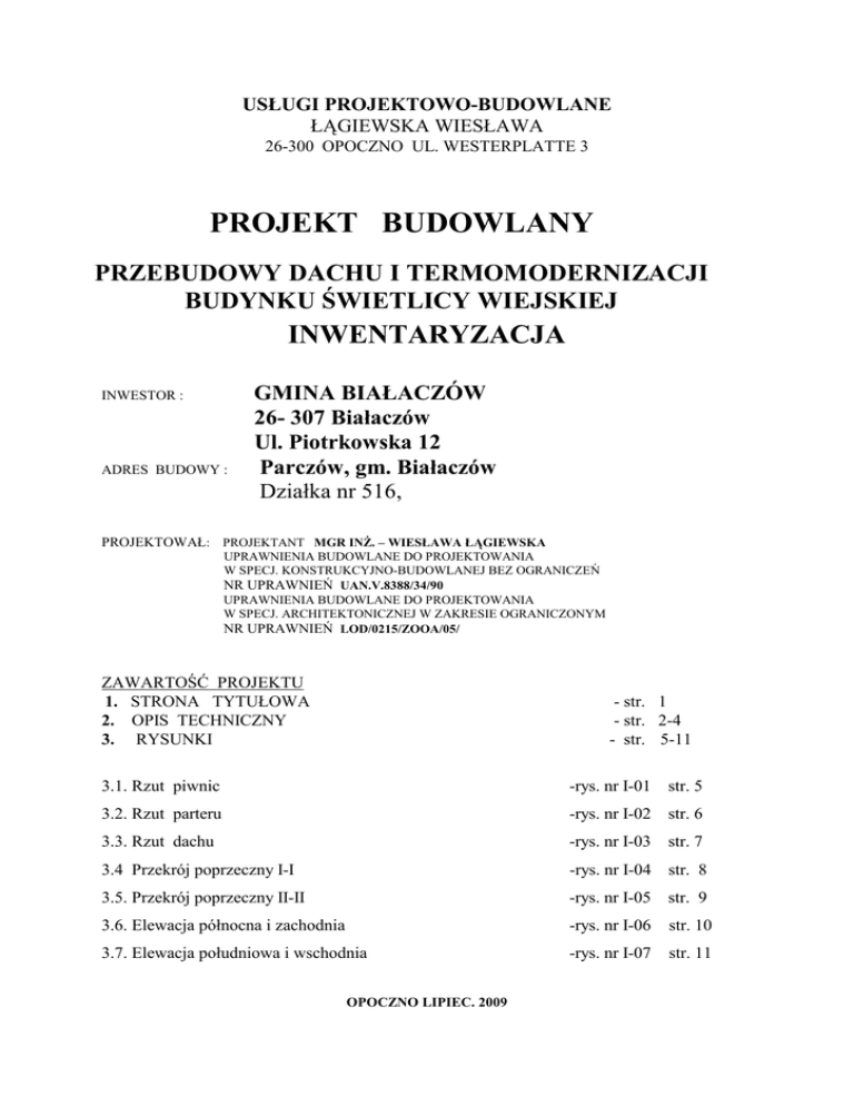 USŁUGI PROJEKTOWO-BUDOWLANE ŁĄGIEWSKA WIESŁAWA 26-300 OPOCZNO UL. WESTERPLATTE 3 PROJEKT BUDOWLANY PRZEBUDOWY DACHU I TERMOMODERNIZACJI BUDYNKU ŚWIETLICY WIEJSKIEJ INWENTARYZACJA INWESTOR : ADRES BUDOWY : GMINA BIAŁACZÓW 26- 307 Białaczów Ul. Piotrkowska 12 Parczów, gm. Białaczów Działka nr 516, PROJEKTOWAŁ: PROJEKTANT MGR INś. – WIESŁAWA ŁĄGIEWSKA UPRAWNIENIA BUDOWLANE DO PROJEKTOWANIA W SPECJ. KONSTRUKCYJNO-BUDOWLANEJ BEZ OGRANICZEŃ NR UPRAWNIEŃ UAN.V.8388/34/90 UPRAWNIENIA BUDOWLANE DO PROJEKTOWANIA W SPECJ. ARCHITEKTONICZNEJ W ZAKRESIE OGRANICZONYM NR UPRAWNIEŃ LOD/0215/ZOOA/05/ ZAWARTOŚĆ PROJEKTU 1. STRONA TYTUŁOWA 2. OPIS TECHNICZNY 3. RYSUNKI - str. 1 - str. 2-4 - str. 5-11 3.1. Rzut piwnic -rys. nr I-01 str. 5 3.2. Rzut parteru -rys. nr I-02 str. 6 3.3. Rzut dachu -rys. nr I-03 str. 7 3.4 Przekrój poprzeczny I-I -rys. nr I-04 str. 8 3.5. Przekrój poprzeczny II-II -rys. nr I-05 str. 9 3.6. Elewacja północna i zachodnia -rys. nr I-06 str. 10 3.7. Elewacja południowa i wschodnia -rys. nr I-07 str. 11 OPOCZNO LIPIEC. 2009 OPIS TECHNICZNY STAN ISTNIEJĄCY 1. DANE OGÓLNE: Tematem niniejszej części opracowania jest inwentaryzacja architektoniczno – budowlana budynku Świetlicy Wiejskiej oraz garaŜu na wóz straŜacki w miejscowości Parczów. Wykonanie tej inwentaryzacji było warunkiem koniecznym do opracowania zasadniczego tematu jakim jest projekt przebudowy dachu i termomodernizacji budynku. 2. PARAMETRY TECHNICZNE . BUDYNEK ŚWIETLICY WIEJSKIEJ: - pow. zabudowy - kubatura budynku - max wysokość ścian budynku od poz. terenu = GARAś NA SAMOCHÓD STRAśACKI: - pow. zabudowy - kubatura budynku - max wysokość ścian budynku od poz. terenu (w szczycie) = 3. 274,3 m2 1665,0 m3 5,10m 63,6 m2 273,5 m3 4,5m FORMA I CHARAKTER BUDYNKU. Budynek Świetlicy Wiejskiej został wybudowany w latach 70-tych XX-tego wieku. Budynek jest podpiwniczony i ma jedną kondygnację nadziemną- parter. Bezpośrednio do budynku od strony wschodniej przylega garaŜ na samochód straŜacki. GaraŜ został dobudowany do budynku głównego później-w 2004r. Budynek ma dość zwartą bryłę architektoniczną. Składa się z dwóch przesuniętych względem siebie prostopadłościanów. Ma dwuspadowy stropodach o kalenicy równoległej do dłuŜszego boku budynku. Pochylenie dachu jest bardzo małe- ok. 3o. Poziom parteru jest dość wysoko wyniesiony nad poziom przyległego terenu. Na parter budynku wchodzi się po wysokich schodach- 2,0m róŜnicy poziomów. GaraŜ na wóz straŜacki dobudowany jest do budynku świetlicy wiejskiej wzdłuŜ całej wschodniej ściany budynku. Przykryty jest jednospadowym dachem o pochyleniu ok. 15o. Jest niŜszy od głównego budynku, zasadniczo róŜni się od tego budynku. Część piwnic jest uŜytkowana na świetlicę wiejską. Są to dwa pomieszczenia od wschodniej strony budynku. W piwnicach są teŜ pomieszczenia magazynowe uŜytkowane przez straŜaków. Piwnice od zachodniej strony są praktycznie na dzień dzisiejszy nie uŜytkowane. Na parterze są pomieszczenia Koła Gospodyń Wiejskich. Jest jedno większe pomieszczenie, pom. uŜytkowane jako kuchnia, zaplecze sanitarne i magazynki. W budynku na parterze od strony zachodniej jest wydzielone mieszkanie z osobnym, niezaleŜnym wejściem. Mieszkanie składa się z trzech pokoi, kuchni, łazienki, korytarza i małej spiŜarni. Główne wejście do budynku na parter jest od strony północnej. Podest wejściowy osłonięty jest odkrytym wiarołapem. Wejście do piwnicy jest niezaleŜne, teŜ jest od strony północnej. Do piwnicy wchodzi się poprzez dobudowany wiatrołap. Wejście do mieszkania jest od zachodniej strony i jest osłonięte odkrytym wiatrołapem pobudowanym częściowo z luksferów. Elewacje budynku są urozmaicone murowanymi filarami wystającymi poza lico ścian 12-13 lub 25cm. Filary są co ok. 6,0m. TuŜ pod stropodachem są wystające, betonowe gzymsy na których są połoŜone rynny dachowe. Płaszczyzny zewnętrznych ścian piwnic i parteru licują się. Teren wokół budynku ma dość duŜe róŜnice poziomów. Teren znacznie opada w kierunku północnym. RóŜnica poziomów między terenem przy ścianie południowej i północnej wynosi około 0,45m. Na południową ścianę budynku napływają wody opadowe z przyległych pól. 4. CHARAKTERYSTYKA KONSTRUKCJI BUDYNKU. Budynek Świetlicy Wiejskiej jest murowany, stropy i stropodach są z płyt kanałowych. Układ konstrukcyjny jest poprzeczny. Ściany konstrukcyjne to ściany szczytowe i ściany do nich równoległe. Rozstaw osiowy ścian konstrukcyjnych jest co 6,0m i na styku przesunięcia dwóch części budynku co 3,0m. Zewnętrzne ściany piwnic są murowane z kamienia, w pobliŜu okien i na naroŜnikach ścian są przemurowania z cegły ceramicznej. Ściany są grubości ok. 46cm.Względem ścian parteru są pogrubione do środka, od zewnątrz licują się z tymi ścianami. Ściany wewnętrzne są murowane z kamienia lub z cegły. Zewnętrzne ściany budynku Świetlicy Wiejskiej to ściany dwuwarstwowe. Od zewnątrz są murowane z cegły ceramicznej pełnej, od wewnątrz z bloczka betonu komórkowego -PGS gr. 24cm. Całkowita grubość ścian zewnętrznych to 40cm. Ściany podłuŜne w miejscach, gdzie na konstrukcyjnych ścianach poprzecznych opierają się stropy, mają przemurowane filary. Strop nad piwnicami w większości jest wykonany z płyt kanałowych, ale po układzie zarysowań widać, Ŝe w niektórych miejscach ma inną konstrukcję. Stropodach nad parterem to płyty kanałowe. UłoŜone są one ze spadkiem, ten spadek jest niewielki-3o. WzdłuŜ ścian podłuŜnych, przy okapie w poziomie górnej krawędzi płyt kanałowych, w miejscu prawdopodobnego wieńca stropowego jest Ŝelbetowy gzyms. Budynek garaŜu jest murowany z pustaków ŜuŜlobetonowych. Jest on dobudowany do głównego budynku, nie ma swojej ściany od strony budynku Świetlicy Wiejskiej. Z tej strony są tylko wymurowane słup