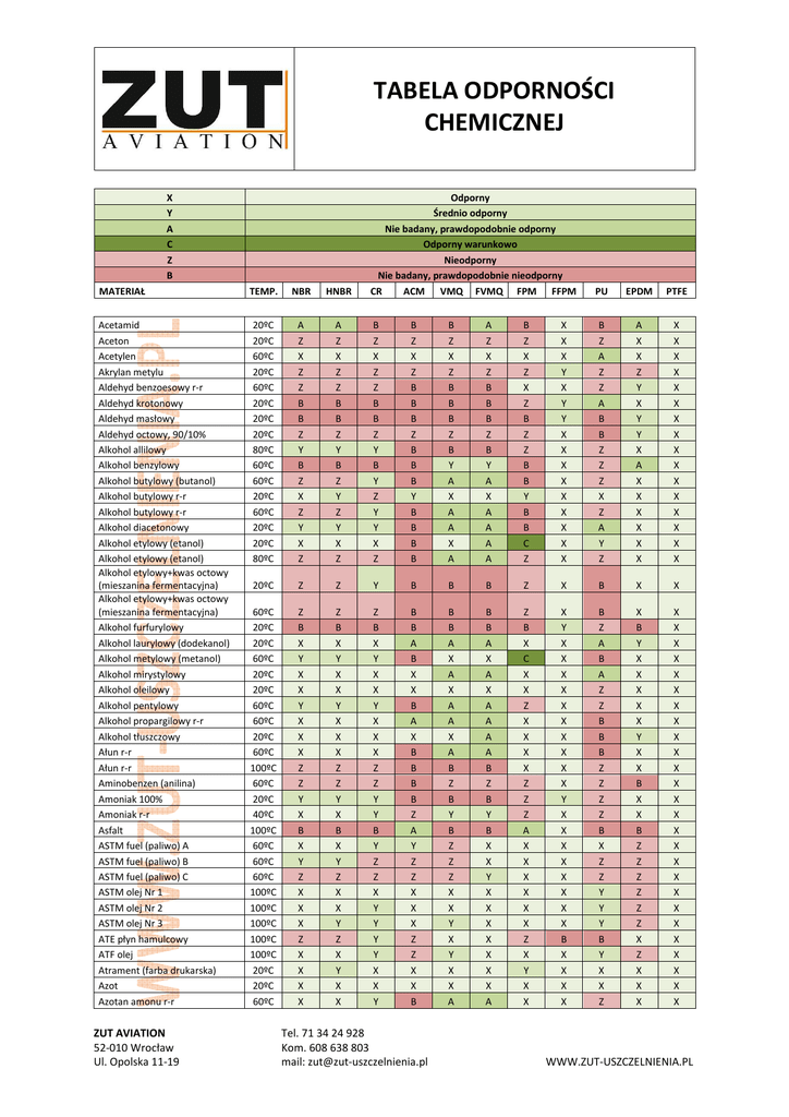 TABELA ODPORNOŚCI CHEMICZNEJ X Y A C Z B Odporny Średnio odporny Nie badany, prawdopodobnie odporny Odporny warunkowo Nieodporny Nie badany, prawdopodobnie nieodporny CR ACM VMQ FVMQ FPM FFPM PU EPDM PTFE MATERIAŁ TEMP. NBR HNBR Acetamid Aceton Acetylen Akrylan metylu Aldehyd benzoesowy r-r Aldehyd krotonowy Aldehyd masłowy Aldehyd octowy, 90/10% Alkohol allilowy Alkohol benzylowy Alkohol butylowy (butanol) Alkohol butylowy r-r Alkohol butylowy r-r Alkohol diacetonowy Alkohol etylowy (etanol) Alkohol etylowy (etanol) Alkohol etylowy+kwas octowy (mieszanina fermentacyjna) Alkohol etylowy+kwas octowy (mieszanina fermentacyjna) Alkohol furfurylowy Alkohol laurylowy (dodekanol) Alkohol metylowy (metanol) Alkohol mirystylowy Alkohol oleilowy Alkohol pentylowy Alkohol propargilowy r-r Alkohol tłuszczowy Ałun r-r Ałun r-r Aminobenzen (anilina) Amoniak 100% Amoniak r-r Asfalt ASTM fuel (paliwo) A ASTM fuel (paliwo) B ASTM fuel (paliwo) C ASTM olej Nr 1 ASTM olej Nr 2 ASTM olej Nr 3 ATE płyn hamulcowy ATF olej Atrament (farba drukarska) Azot Azotan amonu r-r 20ºC 20ºC 60ºC 20ºC 60ºC 20ºC 20ºC 20ºC 80ºC 60ºC 60ºC 20ºC 60ºC 20ºC 20ºC 80ºC A Z X Z Z B B Z Y B Z X Z Y X Z A Z X Z Z B B Z Y B Z Y Z Y X Z B Z X Z Z B B Z Y B Y Z Y Y X Z B Z X Z B B B Z B B B Y B B B B B Z X Z B B B Z B Y A X A A X A A Z X Z B B B Z B Y A X A A A A B Z X Z X Z B Z Z B B Y B B C Z X X X Y X Y Y X X X X X X X X X B Z A Z Z A B B Z Z Z X Z A Y Z A X X Z Y X Y Y X A X X X X X X X X X X X X X X X X X X X X X X 20ºC Z Z Y B B B Z X B X X 60ºC 20ºC 20ºC 60ºC 20ºC 20ºC 60ºC 60ºC 20ºC 60ºC 100ºC 60ºC 20ºC 40ºC 100ºC 60ºC 60ºC 60ºC 100ºC 100ºC 100ºC 100ºC 100ºC 20ºC 20ºC 60ºC Z B X Y X X Y X X X Z Z Y X B X Y Z X X X Z X X X X Z B X Y X X Y X X X Z Z Y X B X Y Z X X Y Z X Y X X Z B X Y X X Y X X X Z Z Y Y B Y Z Z X Y Y Y Y X X Y B B A B X X B A X B B B B Z A Y Z Z X X X Z Z X X B B B A X A X A A X A B Z B Y B Z Z Z X X Y X Y X X A B B A X A X A A A A B Z B Y B X X Y X X X X X X X A Z B X C X X Z X X X X Z Z Z A X X X X X X Z X Y X X X Y X X X X X X X X X X Y X X X X X X X X B X X X X B Z A B A Z Z B B B Z Z Z Z B X Z Z Y Y Y B Y X X Z X B Y X X X X X Y X X B X X B Z Z Z Z Z Z X Z X X X X X X X X X X X X X X X X X X X X X X X X X X X X X ZUT AVIATION 52-010 Wrocław Ul. Opolska 11-19 Tel. 71 34 24 928 Kom. 608 638 803 mail: [email protected] WWW.ZUT-USZCZELNIENIA.PL TABELA ODPORNOŚCI CHEMICZNEJ X Y A C Z B Odporny Średnio odporny Nie badany, prawdopodobnie odporny Odporny warunkowo Nieodporny Nie badany, prawdopodobnie nieodporny CR ACM VMQ FVMQ FPM FFPM PU EPDM PTFE MATERIAŁ TEMP. NBR HNBR Azotan amonu r-r Azotan miedzi r-r Azotan ołowiu r-r Azotan potasu r-r Azotan sodu r-r Azotan srebra r-r Azotan wapnia r-r Azotyn sodu Benzen Benzoesan sodu r-r Benzyna Benzyna ciężka Benzyna lakowa Bezwodnik maleinowy Bezwodnik octowy Bezwodnik octowy Bitumin Boraks, tynkal r-r Boran potasu r-r Brom ciekły Brom, opary Bromek litu r-r Bromek metylu (bromometan) Bromek potasu r-r Bromian potasu 10% Bromobenzen Butadien Butan gazowy Butanodiol r-r Butanodiol r-r Butylen ciekły Butylofenol Butyndiol Cellosolwe (rozpuszczalnik na glikolu etylenowym) Chlor ciekły Chlor gazowy mokry Chlor gazowy suchy Chloramina r-r Chloran potasu r-r Chloran sodu Chlorek amonu r-r (salmiak) Chlorek antymonu r-r Chlorek etylenu (dwuchloroetan) 100ºC 60ºC 20ºC 60ºC 60ºC 20ºC 40ºC 60ºC 20ºC 40ºC 60ºC 20ºC 60ºC 60ºC 20ºC 80ºC 60ºC 60ºC 60ºC 20ºC 20ºC 20ºC 20ºC 60ºC 60ºC 20ºC 60ºC 20ºC 20ºC 60ºC 20ºC 20ºC 20ºC X X X X X Y X Y Z X X Z X B Z Z Z X X Z Z X Z X X B A X X X X Z X X X X X X Y X Y Z X Y Z Y B Z Z Z X X Z Z X Z X X B A X X X X Z X Y Y Y Y Y Y X Y Z Y Y Z Y B Y X Z Y Y Z Z Y Z Y Y B Y Y Y X Y Z Y B B A B B B B B Z B X Y X B B B B B B B B B Z B B B B X B B A Z B A A A A A A X A Z A Z B A B B B B X A B B X Z A A B Y A A A A Z A A A A A A A X A Y A X Y A A B B B X A B B X A A A A X X A A X B A X X X X X X X X Y X X X X X Z Z X X X B B X X X X A X X Y A X Y Y X X X X X X X X X X X X X X Y X X X X A A X X X X A X X X A X X Y Z B Z Z B B B B Z A X Z A B B B B Z Z B B X Z Z Z B A X A Z X Z X X X X X X X X X Z X Z B Z B A X B X X A A X Z X X B Z Z X X B Z X X X X X X X X X X X X X X X X X X X X X X X X X X X X X X X X X X 20ºC 20ºC 20ºC 20ºC 20ºC 60ºC 20ºC 60ºC 20ºC B Z Z Z X Z Z X X B Z Z Z X Z Z X X B Z Z Z X Y Z Y X B B B B A B B B X B B B B A A A A X B B B B A A A A X B Y Y Y B X X X X A Y Y Y Y X X X X B B B A A Z B Z B Y Y Y Y X X X X X X X X X X X X X X 20ºC Y Y Y Z Z B Y X Y Y X ZUT AVIATION 52-010 Wrocław Ul. Opolska 11-19 Tel. 71 34 24 928 Kom. 608 638 803 mail: [email protected] WWW.ZUT-USZCZELNIENIA.PL TABELA ODPORNOŚCI CHEMICZNEJ X Y A C Z B Odporny Średnio odporny Nie badany, prawdopodobnie odporny Odporny warunkowo Nieodporny Nie badany, prawdopodobnie nieodporny CR ACM VMQ FVMQ FPM FFPM MATERIAŁ TEMP. NBR HNBR Chlorek etylu (chloroetan) Chlorek fosforu Chlorek fosforylu Chlorek izopropylu Chlorek litu Chlorek magnezu r-r Chlorek metylenu (dwuchlorometan) Chlorek metylu (chlorometan) Chlorek miedzi r-r Chlorek niklu r-r Chlorek potasu r-r Chlorek sodu (sól kuchenna) Chlorek sulfurylu Chlorek tionylu Chlorek wapnia r-r Chlorek winylu (chloroetylen) ciekły Chlorek żelaza (III) r-r Chlorobenzen Chlorobromometan Chloroetanol Chloroform Chlorohydryna gliceryny Chlorowodorek aniliny Chlorowodorek aniliny Chlorowodór gaz Chromian potasu r-r Ciecz badawcza ASTM olej Nr 1 Ciecz badawcza ASTM olej Nr 2 Ciecz badawcza ASTM olej Nr 3 Ciecz hydrauliczna DIN 51 524 Ciecz hydrauliczna, emulsja olejowo-wodna HFA Ciecz hydrauliczna, emulsja woda-poliglikol HFC Ciecz hydrauliczna, emulsja wodno-olejowa HFB Ciecz hydrauliczna, ester fosforanowy HFD Clophen T 64 Clophen-typ A Cukier gronowy r-r Cyjanek potasu r-r Cyjanek potasu r-r Cykloheksan Cykloheksanol 20ºC 20ºC 20ºC 20ºC 20ºC 100ºC Y Z Z Z X X Y Z Z Z X X Y Z B Z Y Y Z B B Z B Z Z B B Z X A B B B Y X A Y 