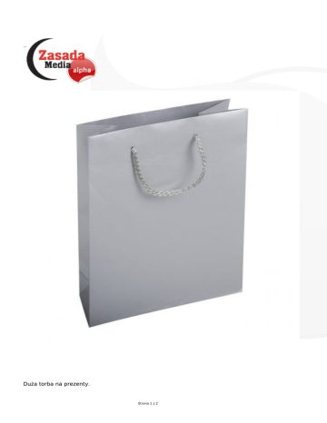 Duża torba na prezenty. Strona 1 z 2 Duża torba na prezenty wykonana z papieru o gramaturze 170 g/m2 pokryta błyszczącym laminatem. Oferowana w kolorze srebrnym. Do torby dołączony jest bilecik. Uchwyt wykonany ze sznurka polimerowego. Logo naniesiemy techniką sitodruku. Strona 2 z 2