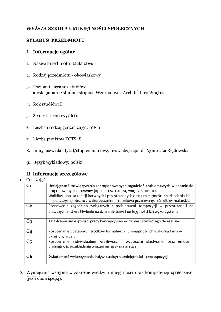 WYŻSZA SZKOŁA UMIEJĘTNOŚCI SPOŁECZNYCH SYLABUS PRZEDMIOTU I. Informacje ogólne 1. Nazwa przedmiotu: Malarstwo 2. Rodzaj przedmiotu - obowiązkowy 3. Poziom i kierunek studiów: niestacjonarne studia I stopnia, Wzornictwo i Architektura Wnętrz 4. Rok studiów: I 5. Semestr : zimowy/ letni 6. Liczba i rodzaj godzin zajęć: 108 h 7. Liczba punktów ECTS: 8 8. Imię, nazwisko, tytuł/stopień naukowy prowadzącego: dr Agnieszka Błędowska 9. Język wykładowy: polski II. Informacje szczegółowe 1. Cele zajęć Umiejętność rozwiązywania zaproponowanych zagadnień problemowych w kontekście C1 C2 proponowanych motywów (np. martwa natura, wnętrze, postać). Wnikliwa analiza relacji barwnych i przestrzennych oraz umiejętności przekładania ich na płaszczyznę obrazu z wykorzystaniem stopniowo poznawanych środków malarskich Poznawanie zagadnień związanych z problemami kompozycji w przestrzeni i na płaszczyźnie. Uwrażliwienie na działanie barw i umiejętności ich wykorzystania. C3 Kształcenie umiejętności pracy koncepcyjnej- od zamysłu twórczego do realizacji. C4 Rozpoznanie dostępnych środków formalnych i umiejętność ich wykorzystania w określonym celu. Rozpoznanie indywidualnej wrażliwości i wyobraźni plastycznej oraz emocji i umiejętność przekładania wrażeń na język malarstwa. C5 C6 Świadomość wykorzystania indywidualnych umiejętności i predyspozycji 2. Wymagania wstępne w zakresie wiedzy, umiejętności oraz kompetencji społecznych (jeśli obowiązują): 1 Umiejętności manualne (na podstawowym poziomie) pozwalające na rozwiązywanie problemów z wykorzystaniem barwy w kontekście relacji przestrzennych. Podstawowa wiedza z historii sztuki w zakresie malarstwa pozwalająca na ogólną orientację w tym zakresie. Kreatywność i wyobraźnia. 3. Efekty kształcenia w zakresie wiedzy, umiejętności oraz kompetencji społecznych Efekty kształcenia w odniesieniu do wiedzy Symbol Opis efektów kształcenia efektu kształcenia Ma podstawową wiedzę dotyczącą realizacji prac w zakresie malarstwa w EK1 EK2 EK3 EK4 EK5 oparciu o pracę z natury i pracę z modelem. Zna określony zakres problematyki związanej z technologiami stosowanymi w dyscyplinie malarstwa Zna i rozumie podstawy geometrii, pespektywy, systemów barwnych i sposoby ich artystycznego wykorzystania Wskazuje na powiązania pomiędzy malarstwem a historią sztuki. Rozpoznaje style w sztuce i rozumie związane z nimi tradycje zarówno dotyczące sztuki dawnej jaki i współczesnej Efekty kształcenia w odniesieniu do umiejętności Symbol Opis efektów kształcenia efektu kształcenia Umie tworzyć i realizować własne koncepcje artystyczne oraz dysponuje EK6 EK7 EK8 EK9 EK10 umiejętnościami potrzebnymi do ich wyrażania Umie podejmować samodzielne decyzje odnośnie do realizacji i własnych prac artystycznych. Posługuje się bogatym językiem wizualnym (problemy kompozycji plastycznej: barwa, linia, faktura, przestrzeń, rytm, kształt, światło, bryła) Posiada umiejętność określania proporcji i umiejętności charakteryzowania formy plastycznej poprzez syntezę i selekcję form obserwowanych w naturze Posiada sprawność manualną i warsztatową w podstawowym zakresie w dyscyplinie malarstwa Efekty kształcenia w odniesieniu do kompetencji społecznych Symbol efektu kształcenia EK11 Opis efektów kształcenia Rozumie potrzebę indywidualnego zaangażowania i uczenia się przez całe życie 2 4. Treści programowe Symbol treści programowych Opis treści programowych Odniesienie do efektów kształcenia dla przedmiotu (symbol efektów) Przestrzeń – obserwacja złożonych relacji przestrzennych. Blisko – daleko. Przekładanie relacji przestrzennych na płaszczyznę. Podstawowe pojęcia. Operowanie plamą. Obserwacje i realizacja w odniesieniu do zaproponowanej martwej natury. Barwa – mieszanie barw. Barwy ciepłe – barwy zimne. Barwa w świetle – barwa w cieniu. .Relacje barwne w przestrzeni. Budowanie przestrzeni barwą. Realizacja w odniesieniu do zaproponowanej martwej natury. EK1, EK2, EK3, EK4, EK5, EK6,EK7, EK8, EK9, EK10, EK11 TP3 Przedmioty, kształty, proporcje. Małe – duże. Figura i tło. Nakładanie się elementów przestrzennych – analiza w odniesieniu do martwej natury. TP4 Konstrukcja obrazu. Kierunki i napięcia. Kompozycja otwarta – kompozycja zamknięta. Ramy obrazu. Wnętrze i zewnętrze obrazu. Poszukiwanie indywidualnych rozwiązań. TP5 Perspektywa, skróty perspektywiczne. Zniekształcenia. Koncepcja – realizacja indywidualnych zamierzeń. TP6 Kadrowanie i kompozycja kadru wobec całości. Indywidualne spojrzenie i możliwe środki plastyczne. TP7 Abstrahowanie i odejście od przedmiotu. Synteza i manipulacja skalą w określonym celu. TP8 Odniesienie do emocji i doświadczeń. Praca z wyobraźni. EK1, EK2, EK3, EK4, EK5, EK6,EK7, EK8, EK9, EK10, EK11 EK1, EK2, EK3, EK4, EK5, EK6,EK7, EK8, EK9, EK10, EK11 EK1, EK2, EK3, EK4, EK5, EK6,EK7, EK8, EK9, EK10, EK11 EK1, EK2, EK3, EK4, EK5, EK6,EK7, EK8, EK9, EK10, EK11 EK1, EK2, EK3, EK4, EK5, EK6,EK7, EK8, EK9, EK10, EK11 EK1, EK2, EK3, EK4, EK5, EK6,EK7, EK8, EK9, EK10, EK11 TP1 TP2 EK1, EK2, EK3, EK4, EK5, EK6,EK7, EK8, EK9, EK10, EK11 5. Literatura podstawowa: Gombrich Ernst Hans, O sztuce, Wydawnictwo Rebis, Poznań 2008 Herbert Read ,O pochodzeniu formy w sztuce, Wydawnictwo PIW, Warszawa 1973 3 John Gage , Kolor i kultura, Wydawnictwo Universitas, Kraków 2008 Maria Rzepińska , Siedem wieków malarstwa europejskiego, Wydawnictwo Ossolineum, Wrocław 1988 Maria Rzepińska, Historia koloru w dziejach malarstwa europejskiego, I i II Tom, Warszawa 1989 dodatkowa: Rudolf Arnhem, Sztuka i percepcja wzrokowa, Wydawnictwo słowo/obraz/terytoria, Gdańsk 2004 Gombrich Ernst Hans ,Sztuka i złudzenie - o psychologii przedstawiania obrazowego , PIW, Warszawa 1981 Herbert Read ,Sens sztuki, Wydawnictwo PWN, Warszawa 1965 Umberto Eco , Historia piękna, Wydawnictwo Rebis, Poznań 200