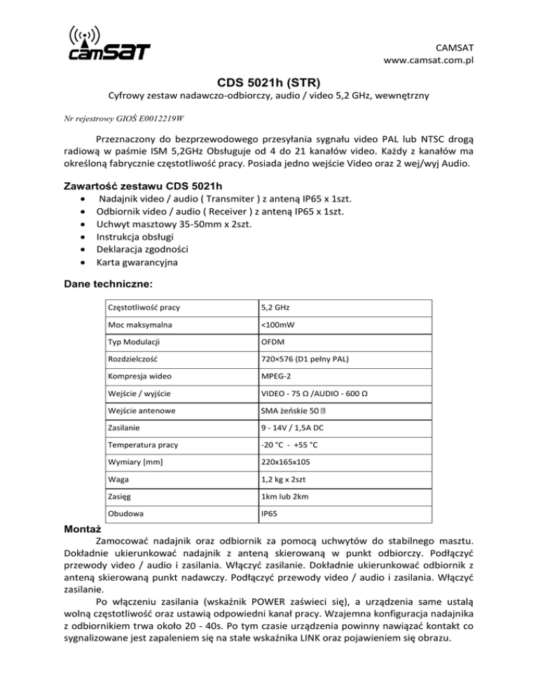 CAMSAT www.camsat.com.pl CDS 5021h (STR) Cyfrowy zestaw nadawczo-odbiorczy, audio / video 5,2 GHz, wewnętrzny Nr rejestrowy GIOŚ E0012219W Przeznaczony do bezprzewodowego przesyłania sygnału video PAL lub NTSC drogą radiową w paśmie ISM 5,2GHz Obsługuje od 4 do 21 kanałów video. Każdy z kanałów ma określoną fabrycznie częstotliwośd pracy. Posiada jedno wejście Video oraz 2 wej/wyj Audio. Zawartość zestawu CDS 5021h Nadajnik video / audio ( Transmiter ) z anteną IP65 x 1szt. Odbiornik video / audio ( Receiver ) z anteną IP65 x 1szt. Uchwyt masztowy 35-50mm x 2szt. Instrukcja obsługi Deklaracja zgodności Karta gwarancyjna Dane techniczne: Częstotliwośd pracy 5,2 GHz Moc maksymalna <100mW Typ Modulacji OFDM Rozdzielczośd 720×576 (D1 pełny PAL) Kompresja wideo MPEG-2 Wejście / wyjście VIDEO - 75 Ω /AUDIO - 600 Ω Wejście antenowe Zasilanie 9 - 14V / 1,5A DC Temperatura pracy -20 °C - +55 °C Wymiary [mm] 220x165x105 Waga 1,2 kg x 2szt Zasięg 1km lub 2km Obudowa IP65 Montaż Zamocowad nadajnik oraz odbiornik za pomocą uchwytów do stabilnego masztu. Dokładnie ukierunkowad nadajnik z anteną skierowaną w punkt odbiorczy. Podłączyd przewody video / audio i zasilania. Włączyd zasilanie. Dokładnie ukierunkowad odbiornik z anteną skierowaną punkt nadawczy. Podłączyd przewody video / audio i zasilania. Włączyd zasilanie. Po włączeniu zasilania (wskaźnik POWER zaświeci się), a urządzenia same ustalą wolną częstotliwośd oraz ustawią odpowiedni kanał pracy. Wzajemna konfiguracja nadajnika z odbiornikiem trwa około 20 - 40s. Po tym czasie urządzenia powinny nawiązad kontakt co sygnalizowane jest zapaleniem się na stałe wskaźnika LINK oraz pojawieniem się obrazu. Pulsowanie lub wyłączenie wskaźnika LINK oznacza zerwanie transmisji radiowej co może byd objawem źle wykierowanych anten, zakłóceo lub wystąpieniem dużych przeszkód pomiędzy antenami. W przypadku braku połączenia kilkakrotnie wyłączyd oraz włączyd zasilanie urządzeo przez co zostanie wymuszone automatyczne przeszukiwanie pasma. Ważne: Aby zapewnid stabilny zasięg radiowy anteny muszą widzied się optycznie. Należy zapewnid stuprocentową widzialnośd optyczną w pierwszej strefie Fresnela. Np. przy częstotliwości 5,2 Ghz i odległości 2km należy zapewnid dla wiązki radiowej wolną przestrzeo o średnicy co najmniej 6m, a dla odległości 1km wolną przestrzeo o średnicy co najmniej 4,5m. Dokładnych obliczeo można dokonad posługując się wzorem zamieszczonym na stronie www.camsat.com.pl. W celu zwiększenia zasięgów można w gniazda (Rx) podłączyd większe anteny kierunkowe. Procedura przypisywania nadajnika do pamięci odbiornika: Każdy nowy zestaw jest fabrycznie zaprogramowany i nie ma konieczności programowania. W przypadku konieczności przypisania nowego nadajnika należy postępowad zgodnie z poniższą procedurą: podłączyd odbiornik (Rx) i nadajnik (Tx) do zasilania włączyd odbiornik (Rx) i nadajnik (Tx) włącznikiem POWER (6) poczekad ok. 20 sekund ,aż dioda LINK (2) w nadajniku zacznie migad. nacisnąd przycisk PAIRING (2) jednocześnie w nadajniku (Tx) oraz odbiorniku (Rx) na 2 sekundy i puścid. (Uwaga: przycisk PAIRING trzeba nacisnąd dopiero gdy dioda LINK w nadajniku zacznie migad) po puszczeniu przycisku PAIRING (2) w odbiorniku (Rx) zapali się na ok. 1 sekundę dioda PAIRING (1) poczekad ok. 10 sekund , aż odbiornik zapisze adres nadajnika dioda LINK zaświeci się na stałe co oznacza prawidłowe połączenie nadajnika z odbiornikiem Istnieje możliwośd przypisywania kilku odbiorników do jednego nadajnika, lecz obraz jest przesyłany tylko do jednego połączonego (dioda LINK świeci) odbiornika. Po utracie zasięgu z połączonego odbiornika lub wyłączeniu go nadajnik wyszukuje następne dostępne odbiorniki i łączy się z nimi. Obsługa sterownika W cyfrowych systemach bezprzewodowych CDS5021h(STR) które zostały rozbudowane o dodatkowy sterownik (STR) istnieje możliwośd ręcznego ustawienia parametrów pracy zestawu za pomocą 8 przełączników typu dip switch. Sterownik daje możliwośd wyboru kanału pracy, wyboru typu transmisji (jednokierunkowy, dwukierunkowy) orazregulacji mocy anteny nadawczej. Dodatkowy watchdog nadzoruje pracę zestawu, tak aby zapewnid jeszcze lepszą jakośd połączenia. W razie problemów z transmisją radiową automatycznie resetuje urządzenia. Obsługa sterownika Konfigurację zestawu należy rozpocząd od ustawienia przełączników typu dip switch zgodnie z tabelą obok. Dioda SETTING powinna zacząd migad, wskazując że ustawienia na przełącznikach się zmieniły i są inne, niż te wgrane do pamięci nadajnika/odbiornika CDS5021h(STR). Aby rozpocząd proces zapisu ustawieo do pamięci urządzenia należy na 3 sekundy przytrzymad przycisk SW SAVE. Proces programowania rozpocznie się automatycznym resetem urządzenia (dioda POWER na chwilę zgaśnie) i potrwa około 5 sekund. Programowanie zakooczy się gdy dioda SETTING zgaśnie. Rozpocznie się normalny proces łączenie się zestawu CDS-5021h(STR), po połączeniu się i uzyskaniu transmisji Video/Audio zaświeci się dioda OK – zestaw pracuję prawidłowo. UWAGA! Należy pamiętad, że aby zestaw pracował prawidłowo ustawienia w nadajniku i w odbiorniku muszą byd identycznie. ZALECENIA: 1. Większe systemy złożone z kilku zestawów powinny byd uruchomione oraz ustawione po kolei tzn. podłączenie zasilania następnego zestawu powinno odbyd się dopiero po precyzyjnym ustawieniu poprzedniego kompletu. 2. Z uwagi na cyfrową modulację urządzenia tego typu nie powinny byd montowane w pobliżu innych radiowych urządzeo analogowych video (np. CAM5816h lub TCO5807h ). Zaleca się montaż CDS-5021h w odstępie co najmniej 7m od odbiorników analogowych oraz należy zasilad je własnym niezależnym zasilaczem. Producent: CAMSAT Gralak Przemysław Ul. Ogrodowa 2a 86-050 Solec Kujawski Oferta oraz informacje