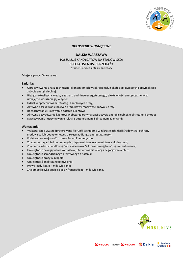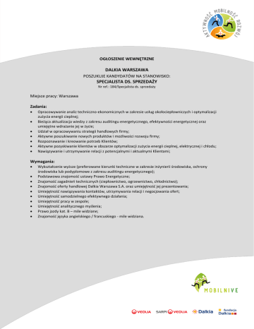 OGŁOSZENIE WEWNĘTRZNE DALKIA WARSZAWA POSZUKUJE KANDYDATÓW NA STANOWISKO: SPECJALISTA DS. SPRZEDAŻY Nr ref.: 184/Specjalista ds. sprzedaży Miejsce pracy: Warszawa Zadania: Opracowywanie analiz techniczno-ekonomicznych w zakresie usług okołociepłowniczych i optymalizacji zużycia energii cieplnej; Bieżąca aktualizacja wiedzy z zakresu auditingu energetycznego, efektywności energetycznej oraz umiejętne wdrażanie jej w życie; Udział w opracowywaniu strategii handlowych firmy; Aktywne poszukiwanie nowych produktów i możliwości rozwoju firmy; Rozpoznawanie i kreowanie potrzeb Klientów; Aktywne pozyskiwanie klientów w obszarze optymalizacji zużycia energii cieplnej, elektrycznej i chłodu; Nawiązywanie i utrzymywanie relacji z potencjalnymi i aktualnymi Klientami; Wymagania: Wykształcenie wyższe (preferowane kierunki techniczne w zakresie inżynierii środowiska, ochrony środowiska lub podyplomowe z zakresu auditingu energetycznego); Podstawowa znajomość ustawy Prawo Energetyczne; Znajomość zagadnień technicznych (ciepłownictwo, ogrzewnictwo, chłodnictwo); Znajomość oferty handlowej Dalkia Warszawa S.A. oraz umiejętność jej prezentowania; Umiejętność nawiązywania kontaktów, utrzymywania relacji i negocjowania ofert; Umiejętność samodzielnego efektywnego działania; Umiejętność pracy w zespole; Umiejętność analitycznego myślenia; Prawo jazdy kat. B – mile widziane; Znajomość języka angielskiego / francuskiego - mile widziana. Oferujemy: Atrakcyjne warunki zatrudnienia w oparciu o umowę o pracę; Pracę pełną wyzwań, w dynamicznie rozwijającej się, nowoczesnej organizacji; Możliwość pozyskania cennego doświadczenia oraz rozwoju. Zainteresowane osoby prosimy o przesłanie ofert zawierających CV i list motywacyjny na adres Dalkia Warszawa S.A., Dział Rozwoju Zasobów Ludzkich, Plac Unii C ul. Puławska 2, 02-566 Warszawa: [email protected] W temacie wiadomości prosimy zaznaczyć: Nr ref: 184/Specjalista ds. sprzedaży Termin składania aplikacji upływa z dniem: 28.11.2014r. Aplikacje złożone w procesie rekrutacji nie będą zwracane. W aplikacji prosimy zawrzeć klauzulę: ,,Wyrażam zgodę na przetwarzanie moich danych osobowych zawartych w ofercie pracy dla potrzeb niezbędnych do realizacji procesu rekrutacji zgodnie z ustawą z dnia 29.08.1997 r. o ochronie danych osobowych (Dz.U. z 2002 r. Nr101, poz.926, ze zm.)”.