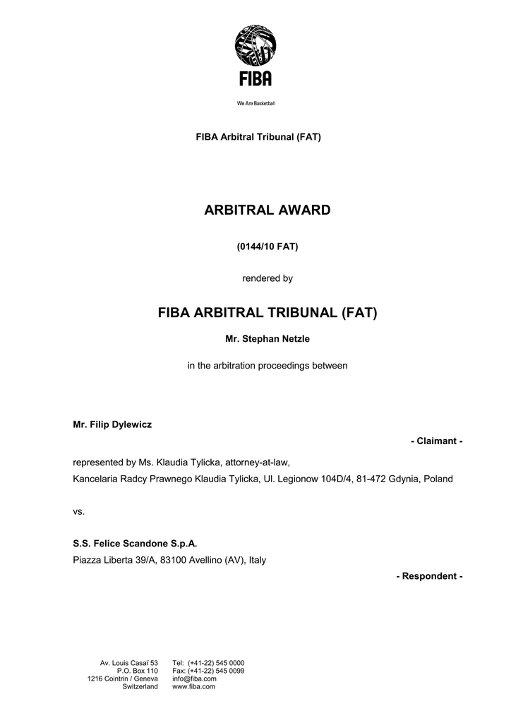 FIBA Arbitral Tribunal (FAT) ARBITRAL AWARD (0144/10 FAT) rendered by FIBA ARBITRAL TRIBUNAL (FAT) Mr. Stephan Netzle in the arbitration proceedings between Mr. Filip Dylewicz - Claimant represented by Ms. Klaudia Tylicka, attorney-at-law, Kancelaria Radcy Prawnego Klaudia Tylicka, Ul. Legionow 104D/4, 81-472 Gdynia, Poland vs. S.S. Felice Scandone S.p.A. Piazza Liberta 39/A, 83100 Avellino (AV), Italy - Respondent - Av. Louis Casaï 53 P.O. Box 110 1216 Cointrin / Geneva Switzerland Tel: (+41-22) 545 0000 Fax: (+41-22) 545 0099 [email protected] www.fiba.com FIBA Arbitral Tribunal (FAT) AWARD Upon providing both parties with an opportunity to be heard, having ascertained his jurisdiction and considered the factual and legal arguments as well as the requests for relief submitted in this case, the Arbitrator decides as follows: 1. S.S. Felice Scandone S.p.A. is ordered to pay to Mr. Filip Dylewicz an outstanding bonus in the amount of EUR 5,000.00 plus interest in the amount of EUR 173.29. 2. S.S. Felice Scandone S.p.A. is ordered to pay to Mr. Filip Dylewicz outstanding salaries in the amount of EUR 14,000.00 plus interest in the amount of EUR 372.57. 3. S.S. Felice Scandone S.p.A. is ordered to pay to Mr. Filip Dylewicz the amount of EUR 3,960.00 as a contribution towards his legal costs and expenses. S.S. Felice Scandone S.p.A. shall bear its own legal costs and expenses. 4. The costs of this arbitration until the present Award, which were determined by the President of the FAT in the amount of EUR 3,700.00, shall be borne by S.S. Felice Scandone S.p.A. alone. Accordingly, S.S. Felice Scandone S.p.A. shall pay to Mr. Filip Dylewicz EUR 3,700.00. The balance of the Advance on Costs, in the amount of EUR 1,300.00, will be reimbursed to Mr. Filip Dylewicz by the FAT. 5. Any arbitration costs associated with a Request for Reasons (see attached Notice) shall be advanced and borne by the requesting party. 6. Any other or further requests for relief are dismissed. Award 0144/10 FAT 2/4 FIBA Arbitral Tribunal (FAT) Geneva, seat of the arbitration, 24 March 2011 Stephan Netzle (Arbitrator) Award 0144/10 FAT 3/4 FIBA Arbitral Tribunal (FAT) Notice about Request for Reasons in accordance with Article 16.2 of the FAT Rules: “By agreeing to submit their dispute to arbitration under these Rules, the Parties agree that, where the value of the dispute does not exceed EUR 30,000, the Arbitrator will issue an award without reasons. The Arbitrator shall deliver reasons only in the case where a party a) files a request to that effect at any stage from when the Request for Arbitration is filed until no later than ten (10) days after the notification of the award without reasons; and b) pays the respective advance on costs as determined and within the time limit set by the FAT Secretariat.” On 13 December 2010 the FAT Secretariat informed the Parties that the amount of the advance on costs to be paid for a reasoned award in this case is EUR 6,000.00. The time limit for payment thereof shall be set by the FAT Secretariat upon receipt of the Request for Reasons, if any. Award 0144/10 FAT 4/4